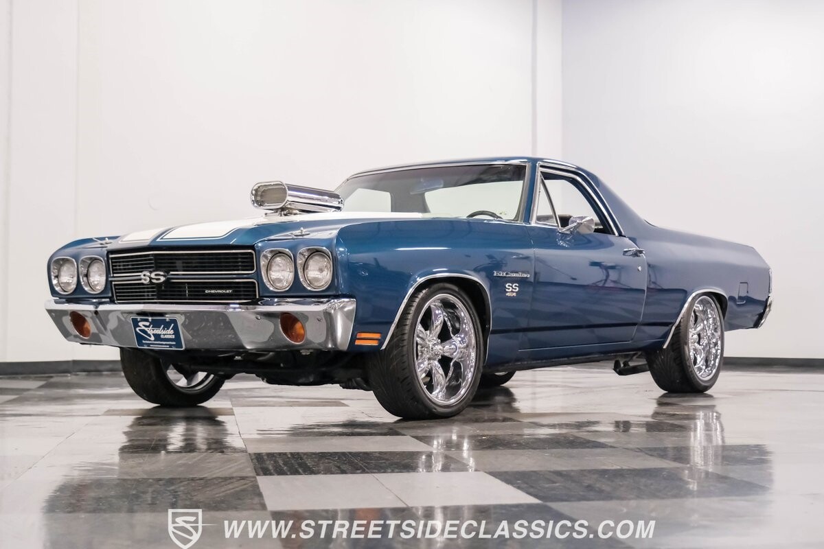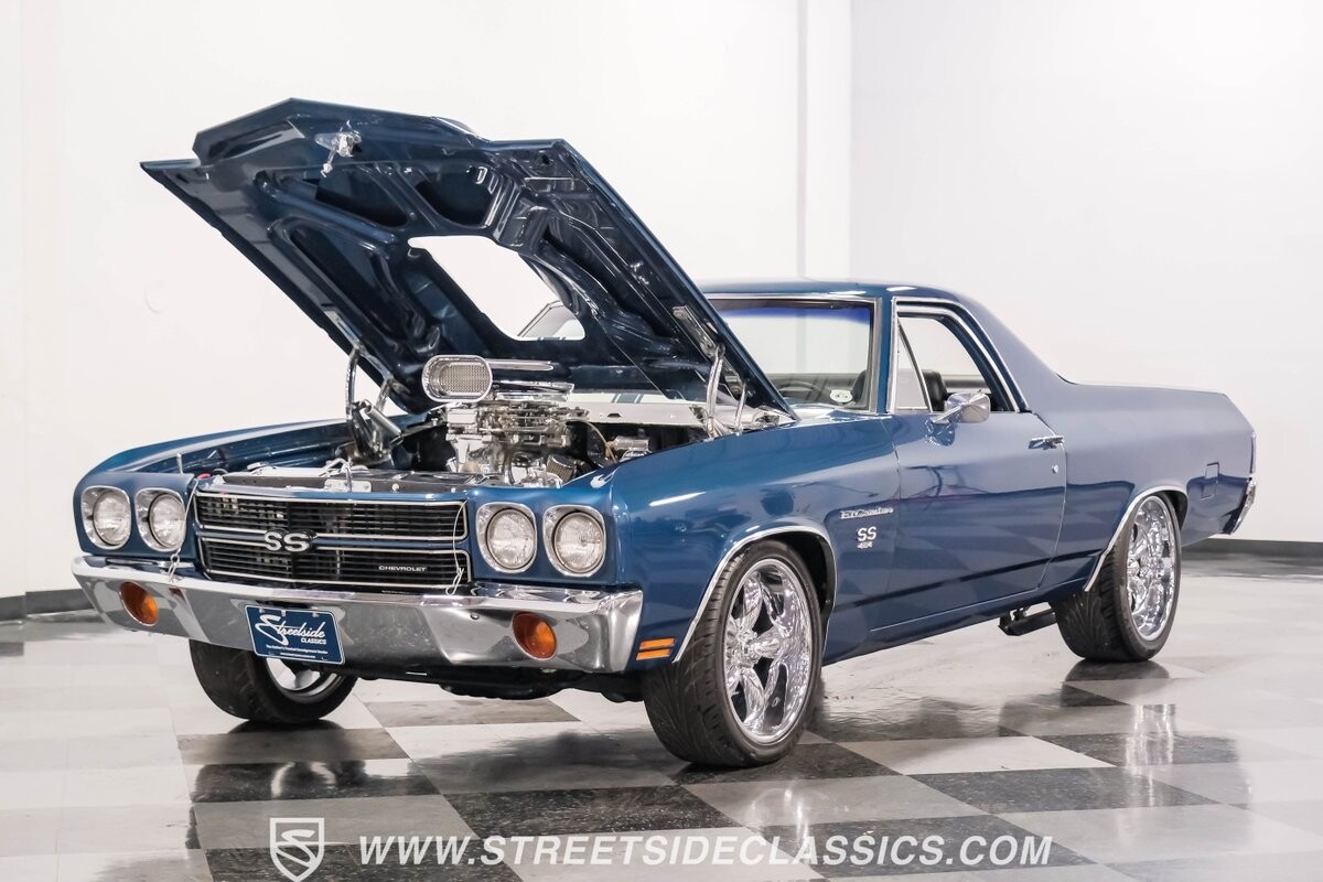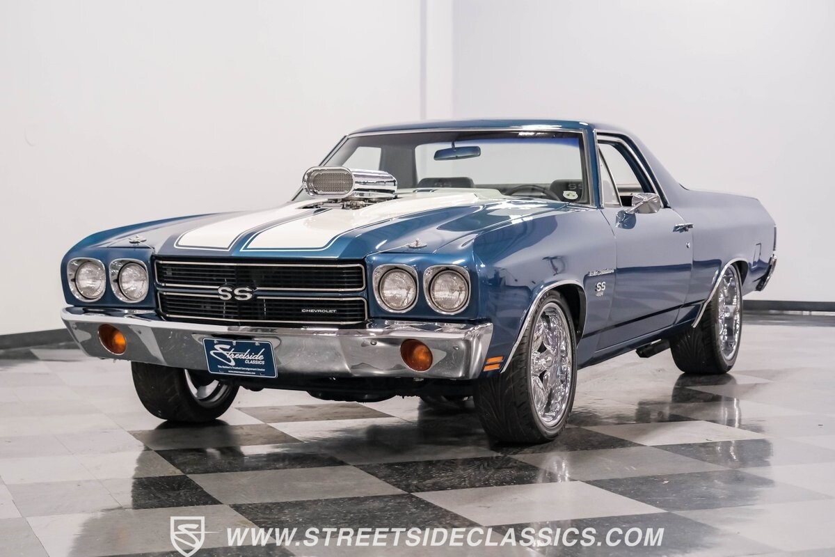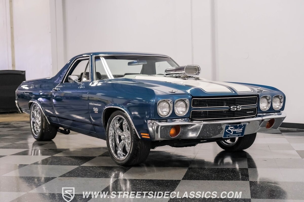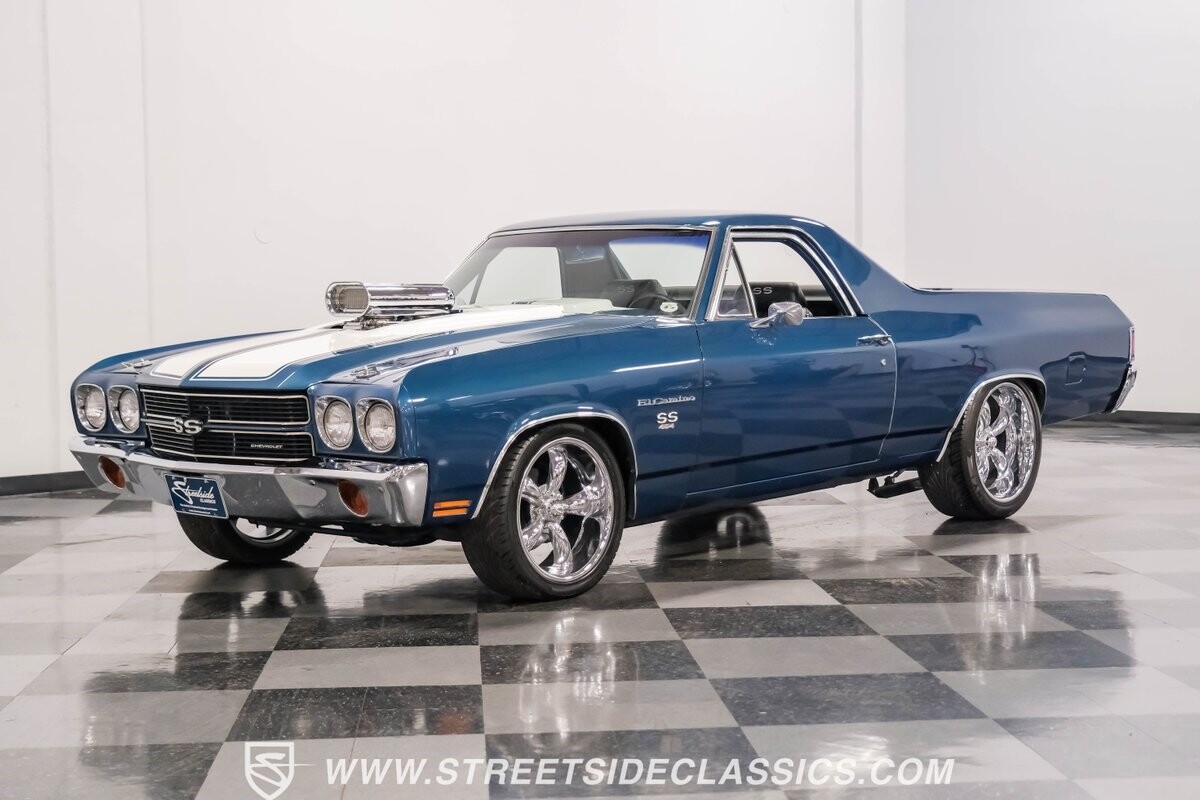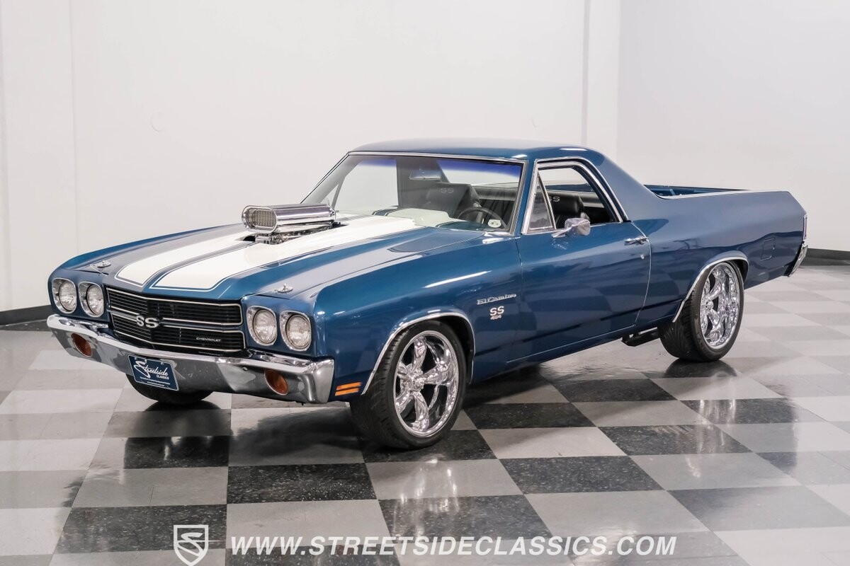 This 1970 Chevrolet El Camino SS 454 sports a Dark Blue Metallic finish accented by bold white stripes. A custom steel cowl hood amplifies its muscular profile, while chrome accents complement the paint, creating a blend of classic muscle car aesthetics and modern style. Coys wheels, 18" front and 20" rear wrapped in 245/40ZR18 and 275/40ZR20 tires, give it a commanding road presence.