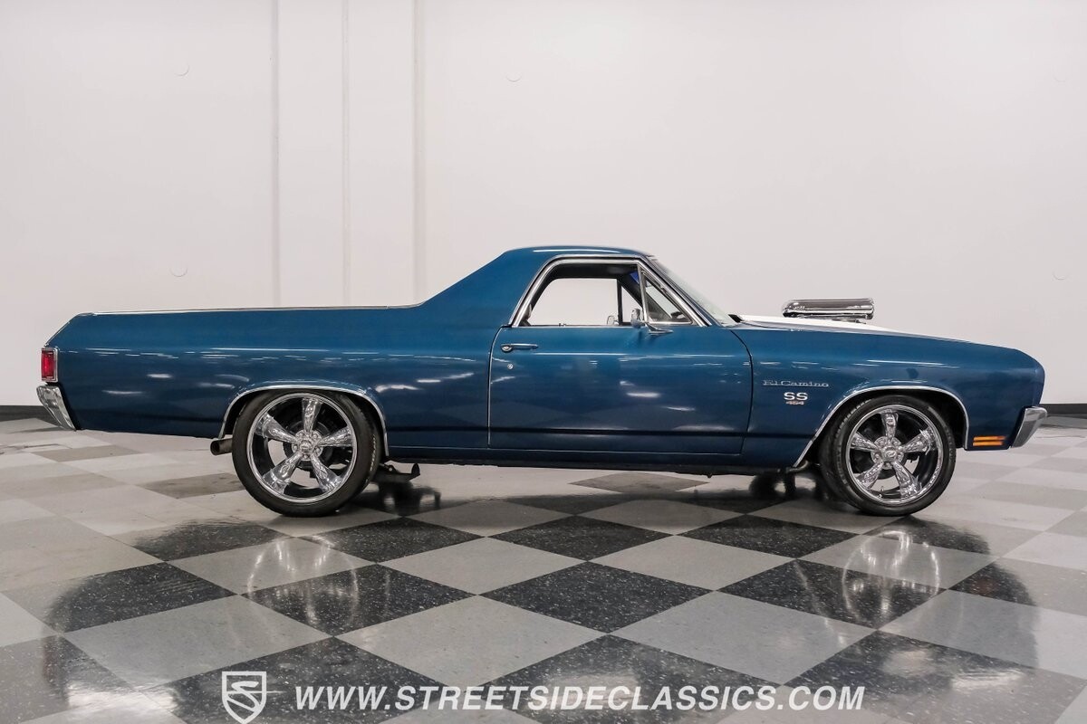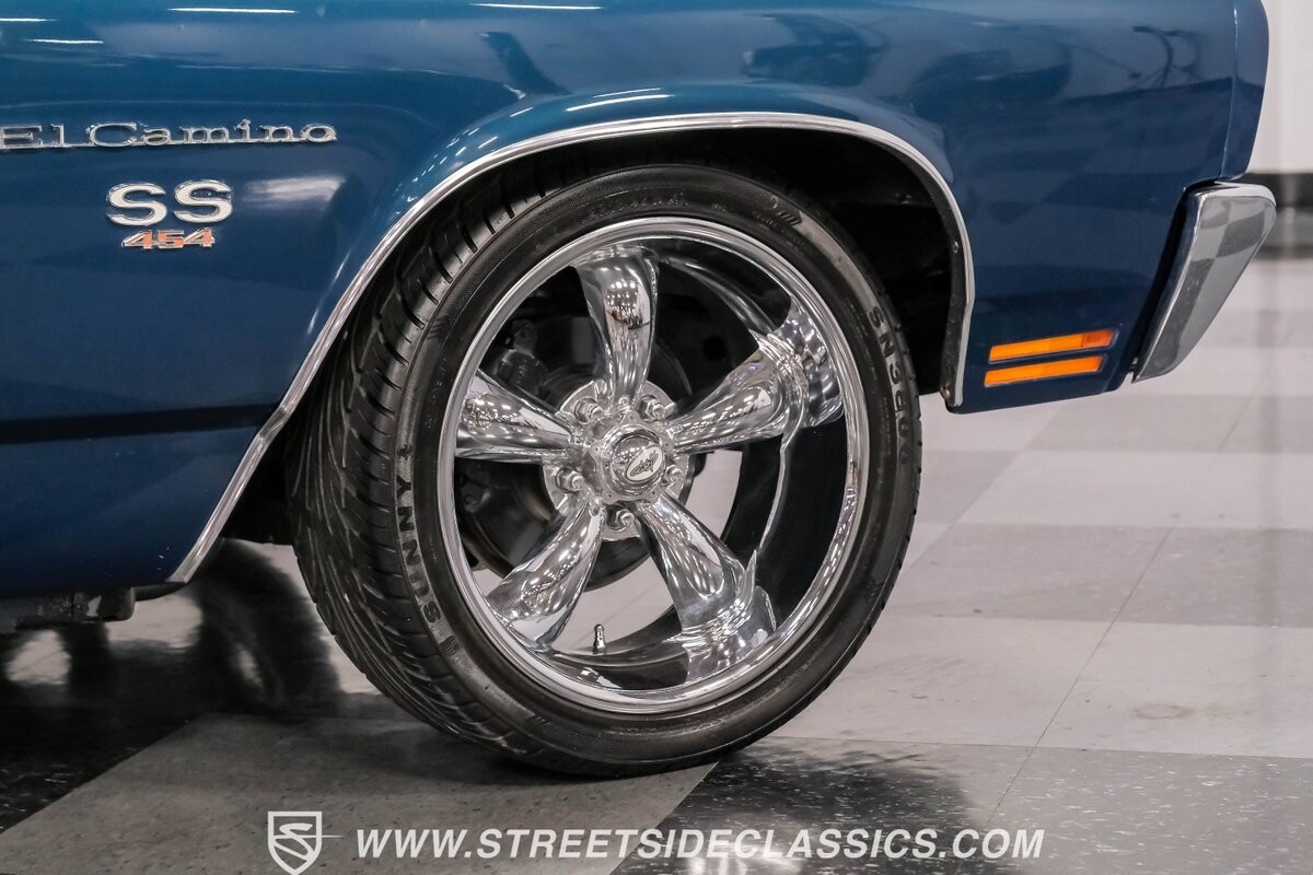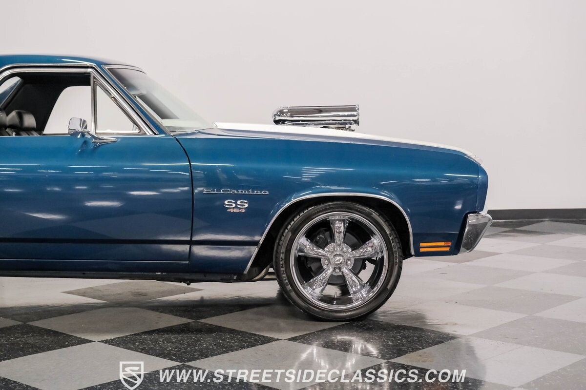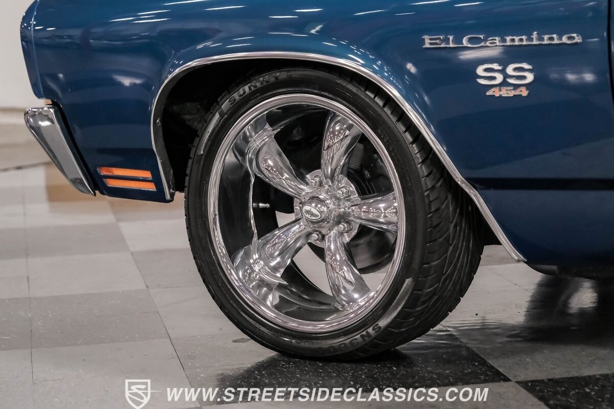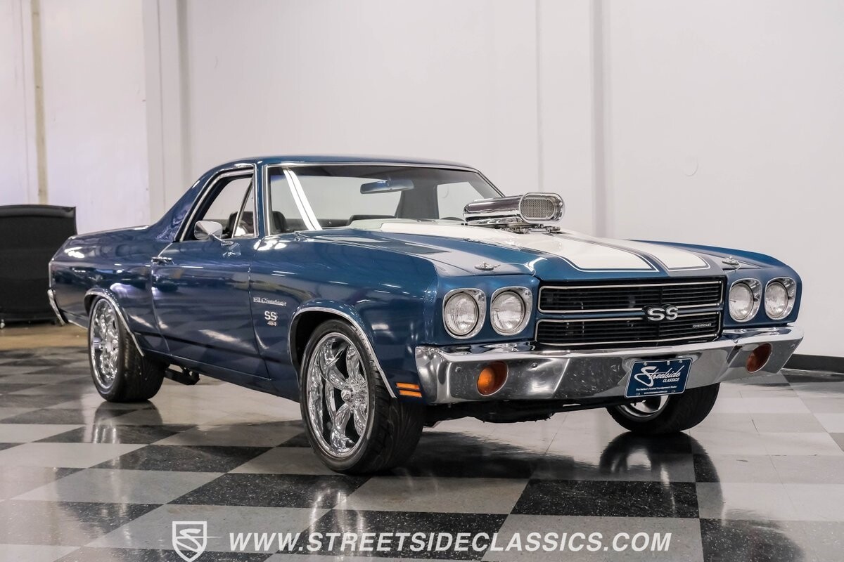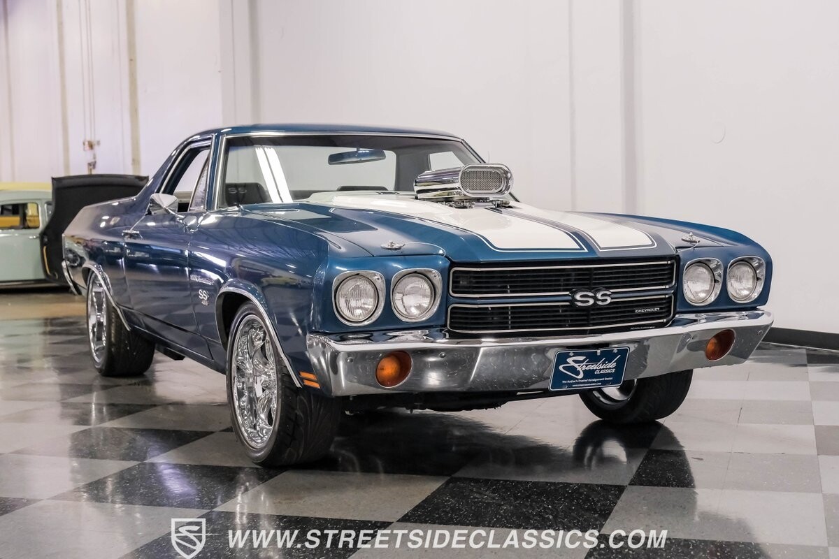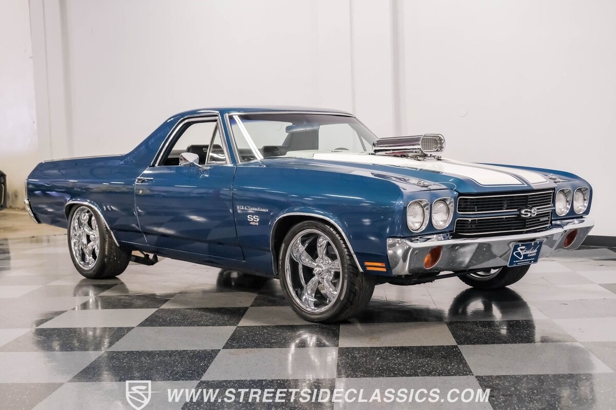 This 1970 Chevrolet El Camino SS 454 sports a Dark Blue Metallic finish accented by bold white stripes. A custom steel cowl hood amplifies its muscular profile, while chrome accents complement the paint, creating a blend of classic muscle car aesthetics and modern style. Coys wheels, 18" front and 20" rear wrapped in 245/40ZR18 and 275/40ZR20 tires, give it a commanding road presence.