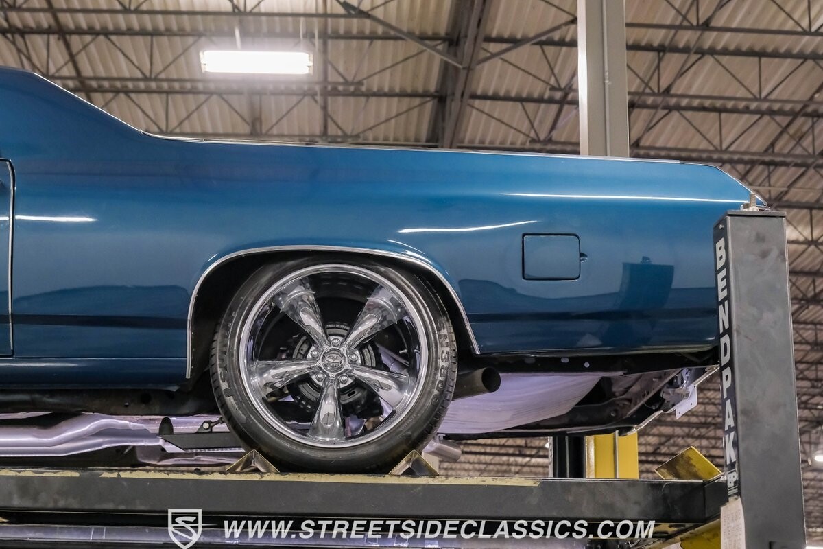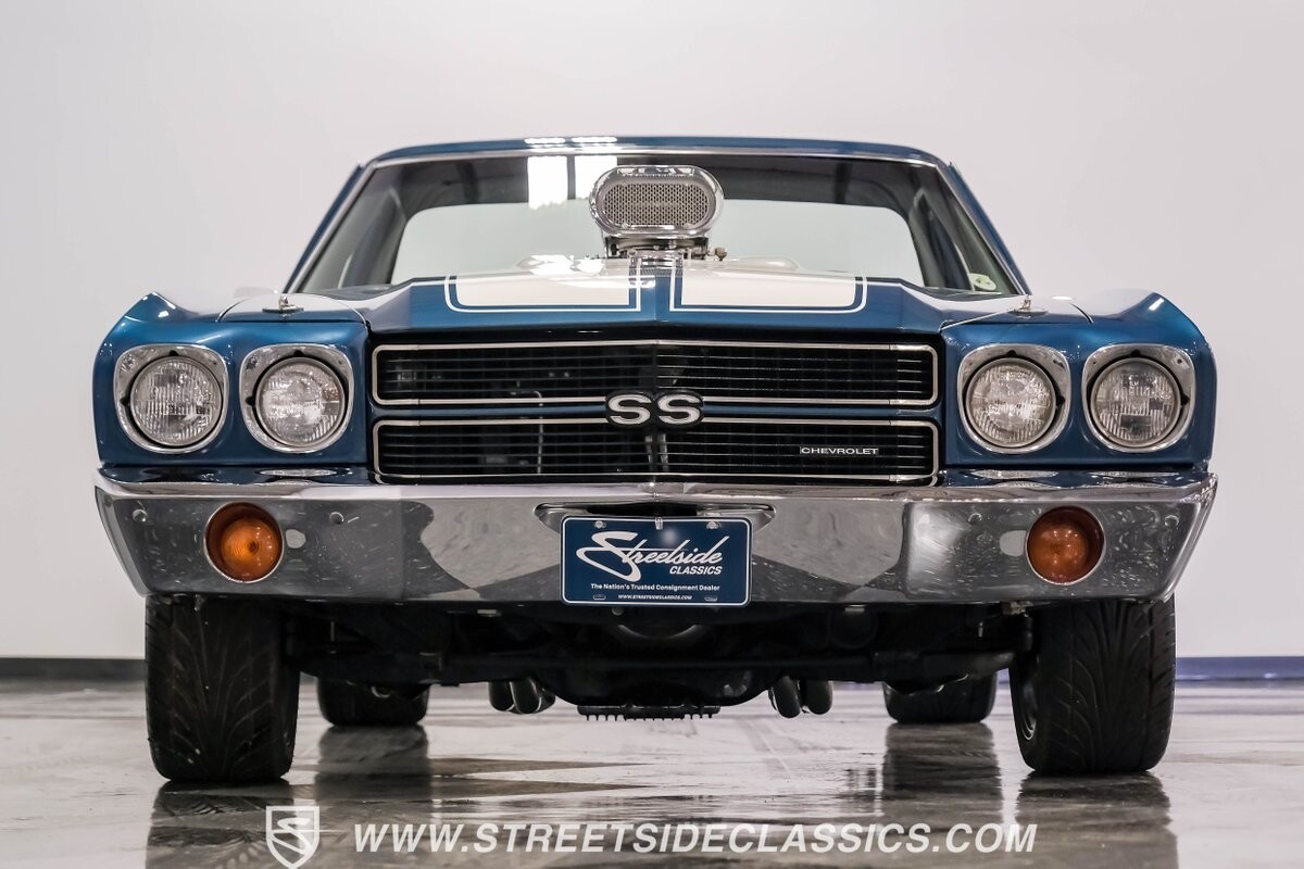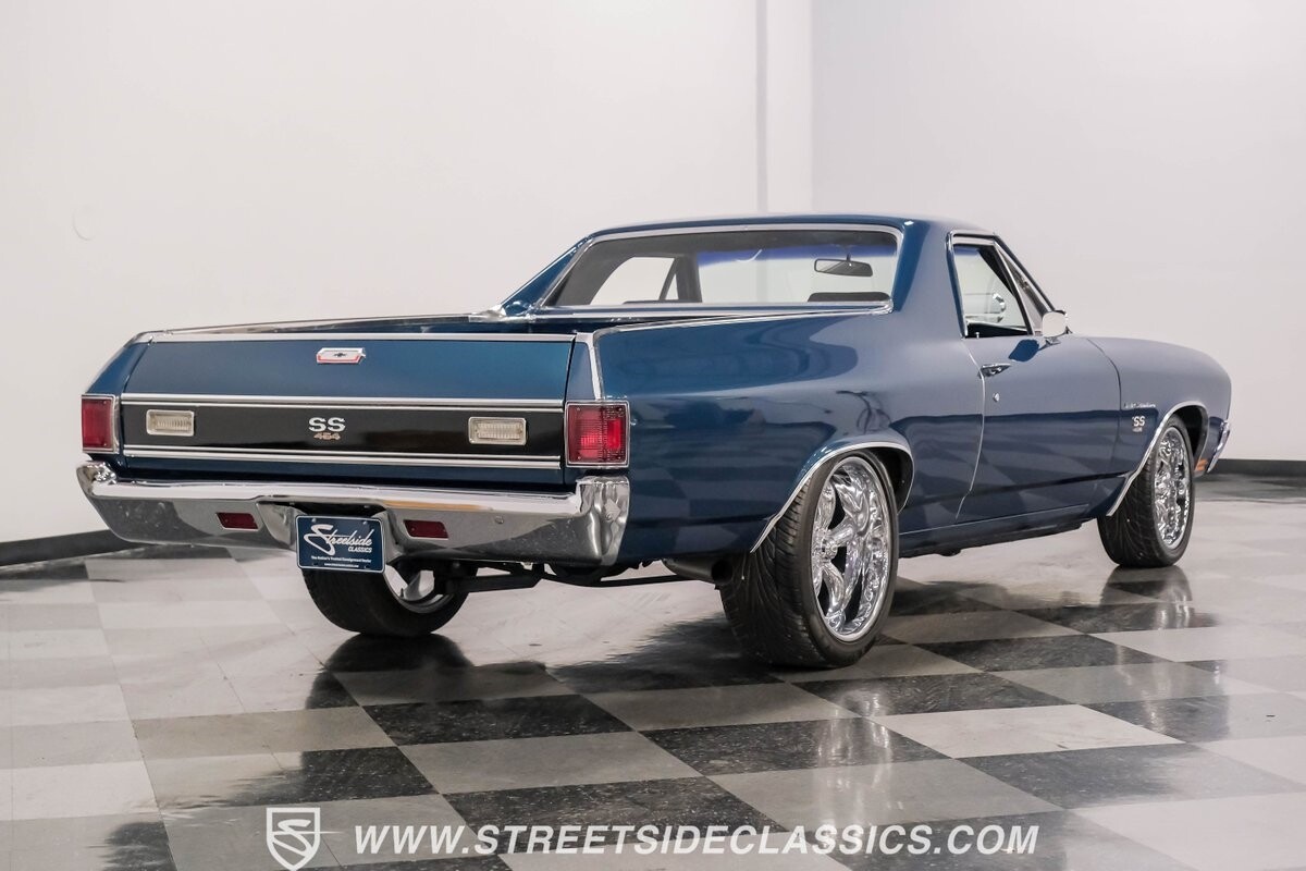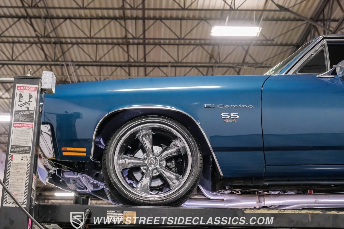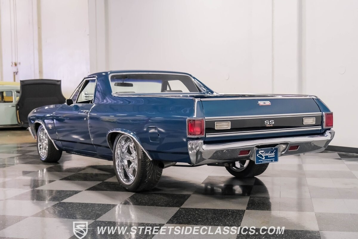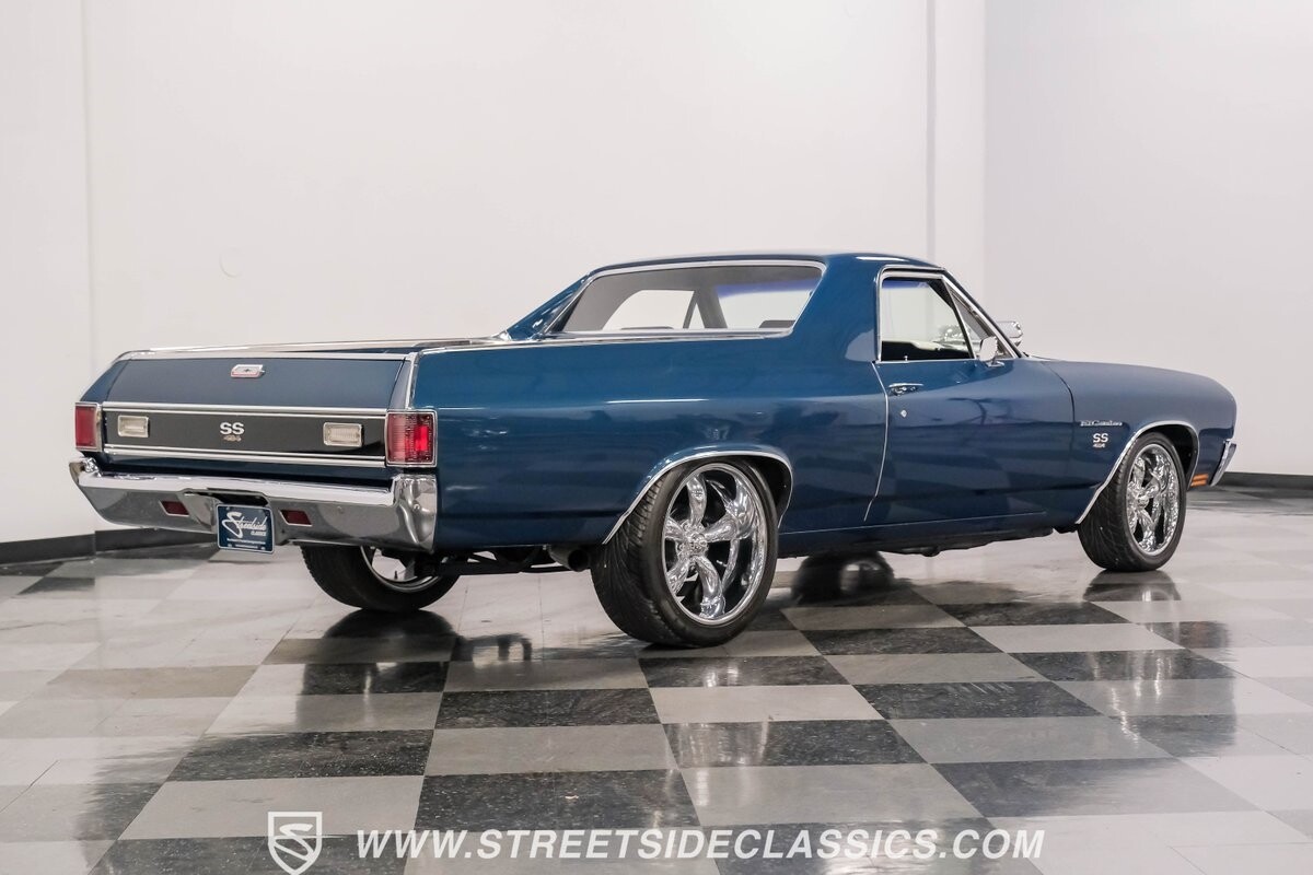 This 1970 Chevrolet El Camino SS 454 sports a Dark Blue Metallic finish accented by bold white stripes. A custom steel cowl hood amplifies its muscular profile, while chrome accents complement the paint, creating a blend of classic muscle car aesthetics and modern style. Coys wheels, 18" front and 20" rear wrapped in 245/40ZR18 and 275/40ZR20 tires, give it a commanding road presence.
