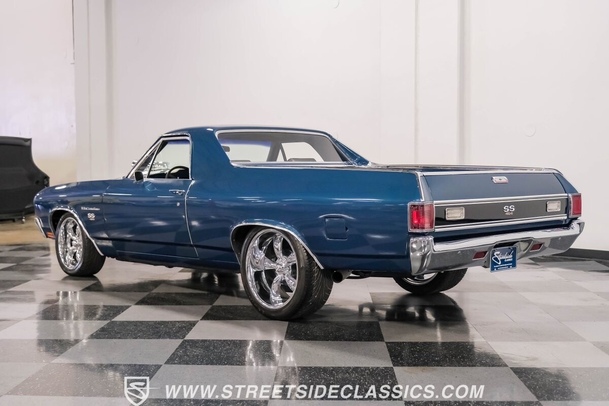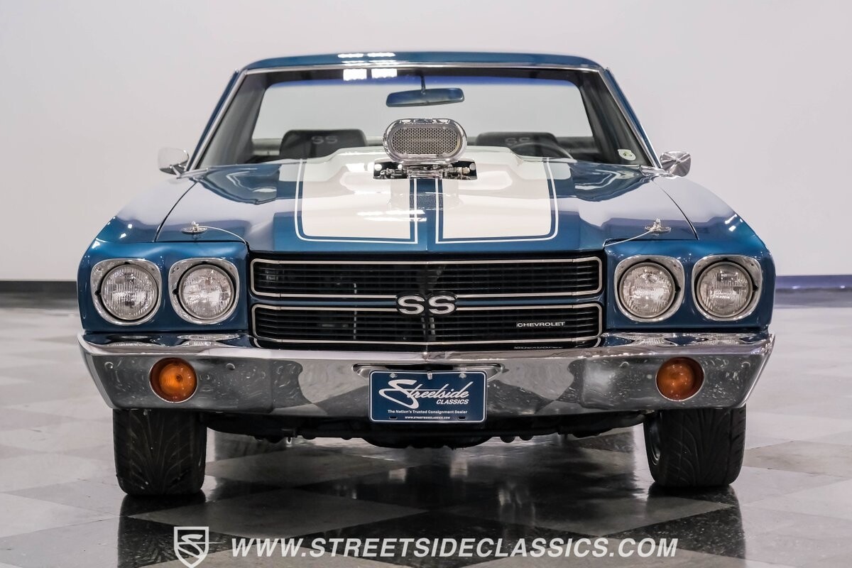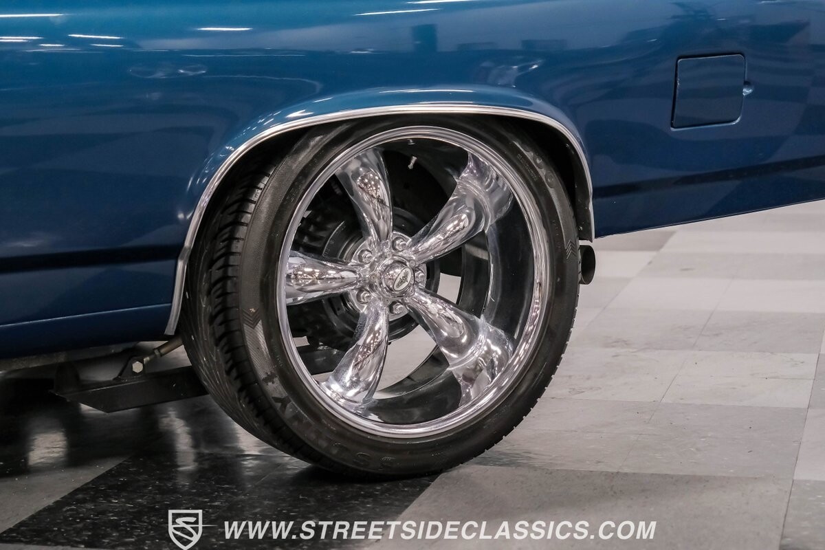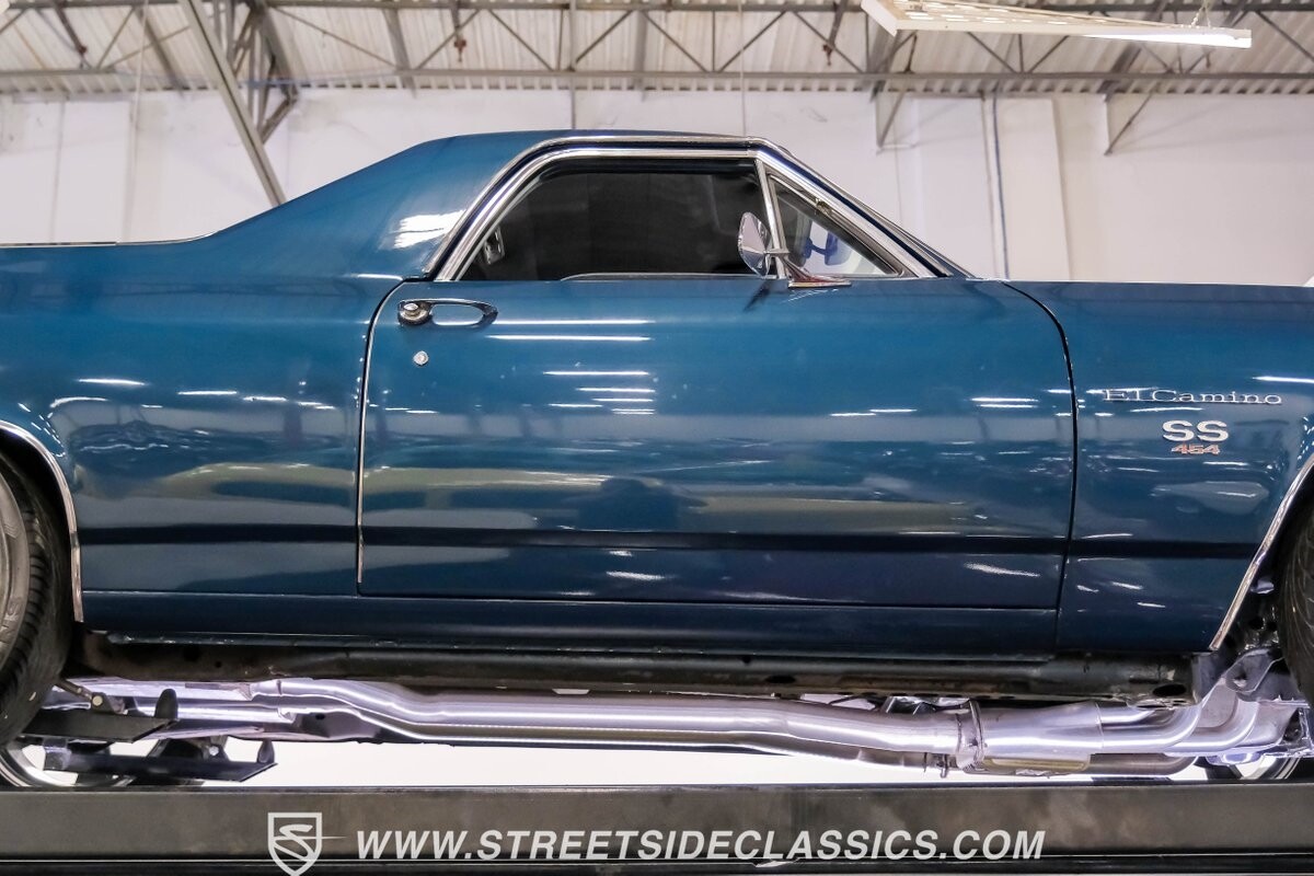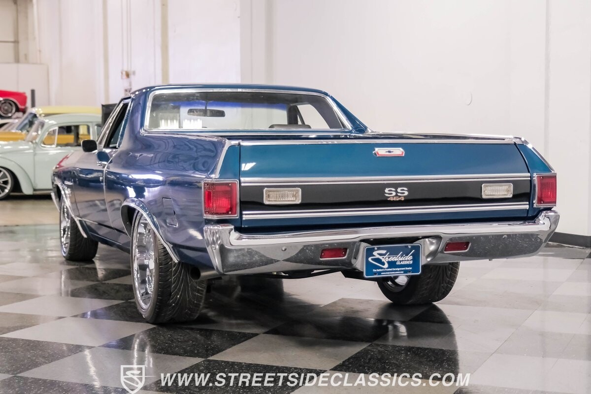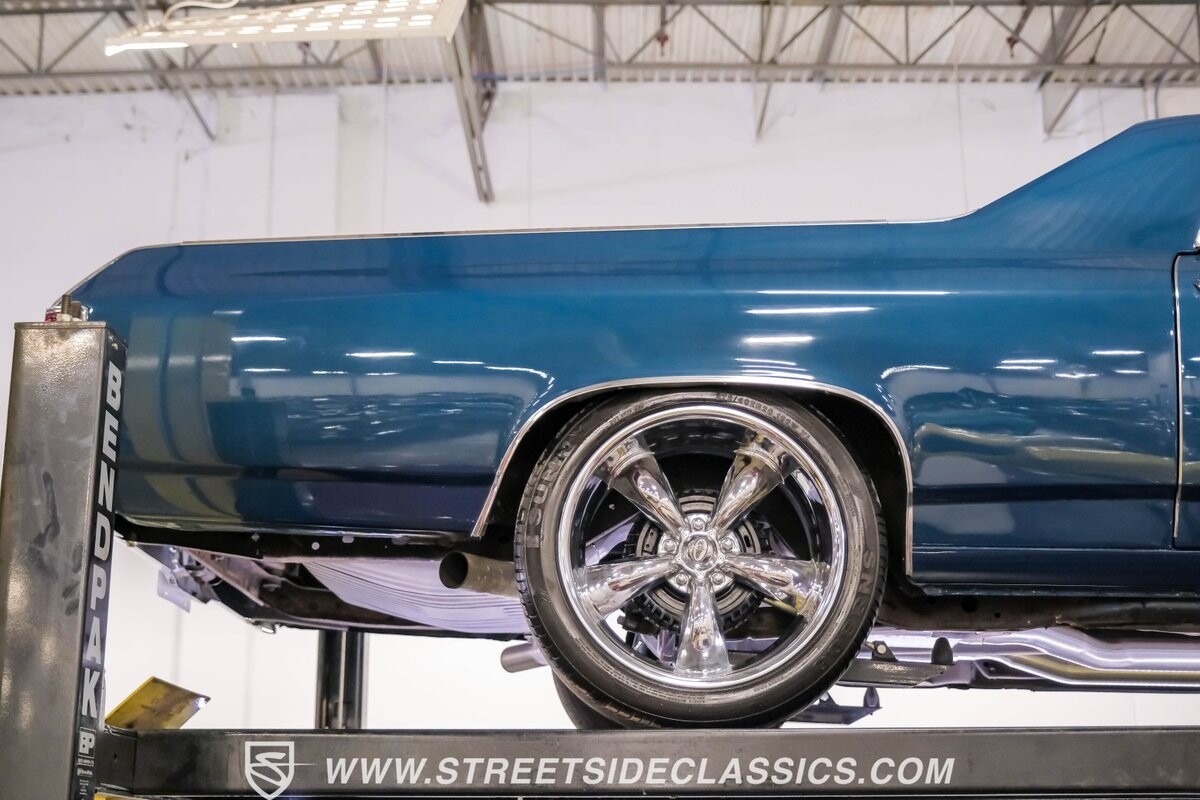 This 1970 Chevrolet El Camino SS 454 sports a Dark Blue Metallic finish accented by bold white stripes. A custom steel cowl hood amplifies its muscular profile, while chrome accents complement the paint, creating a blend of classic muscle car aesthetics and modern style. Coys wheels, 18" front and 20" rear wrapped in 245/40ZR18 and 275/40ZR20 tires, give it a commanding road presence.