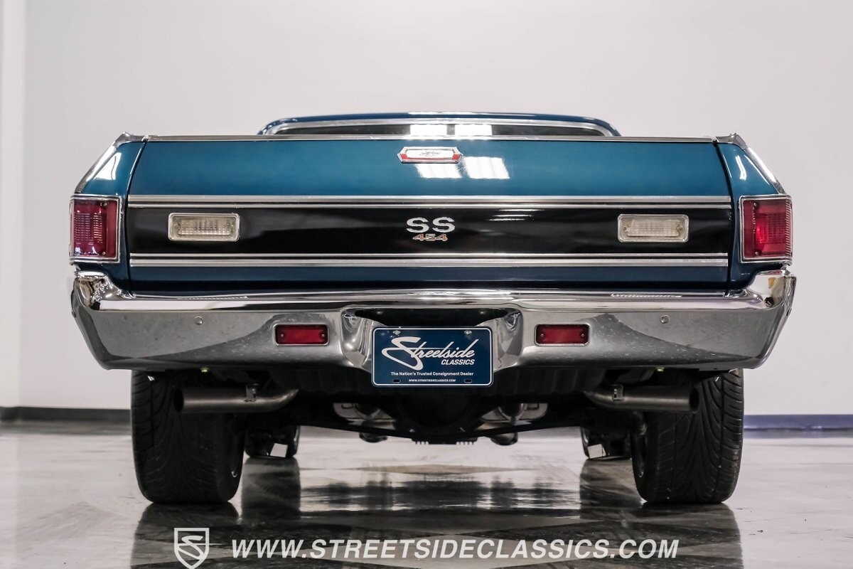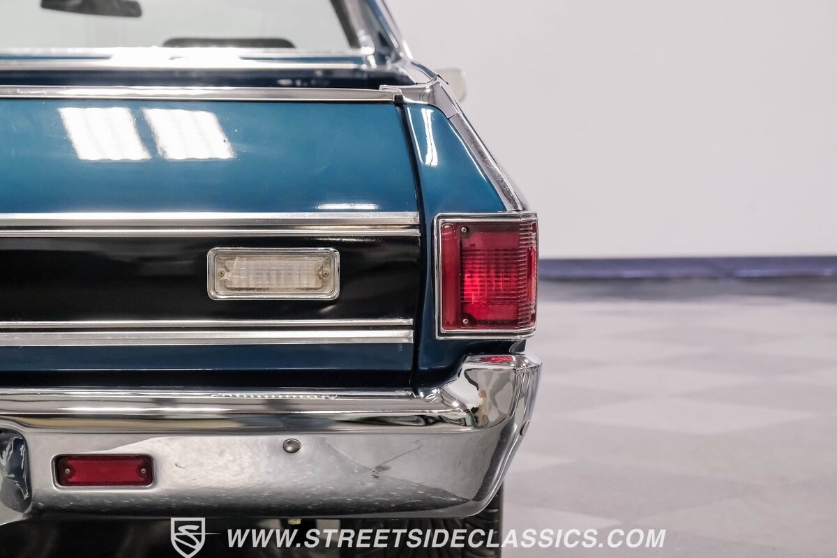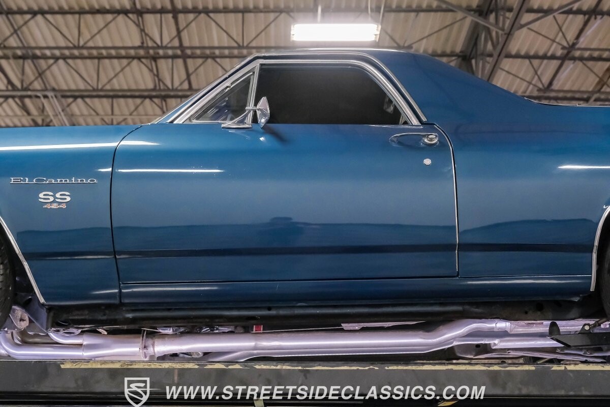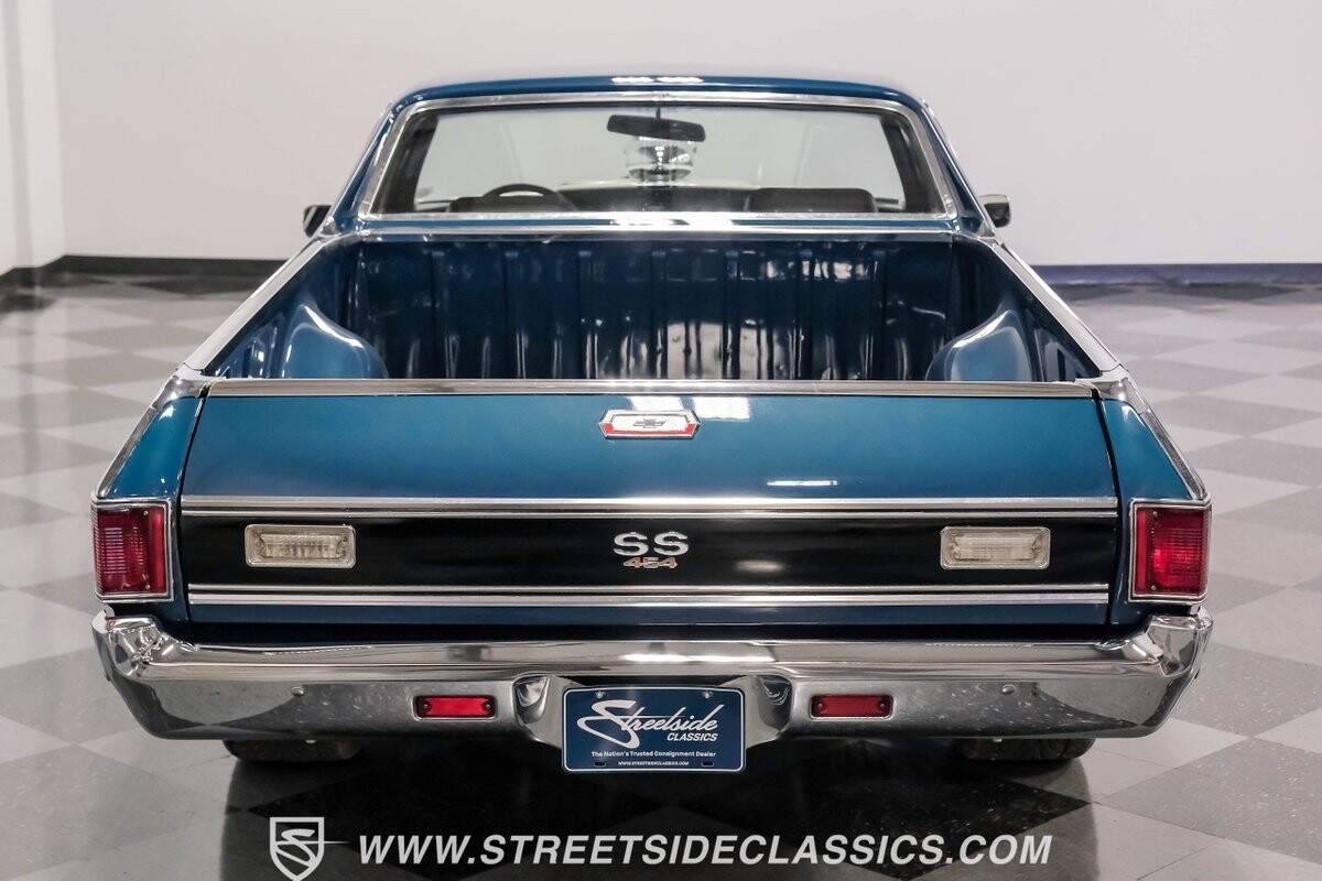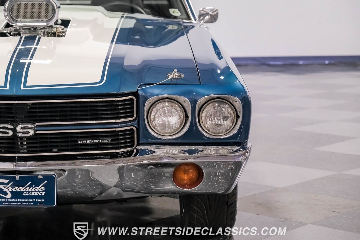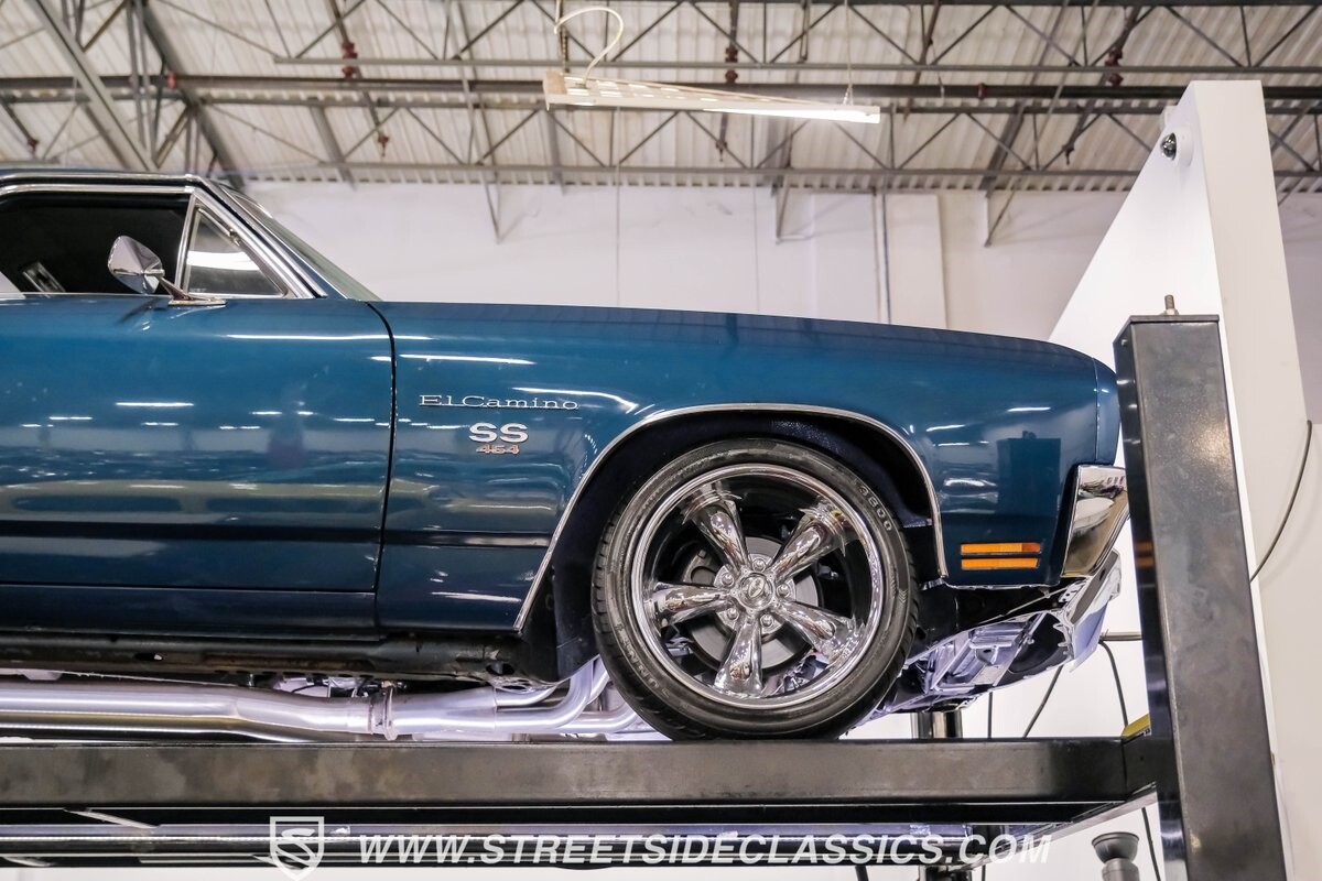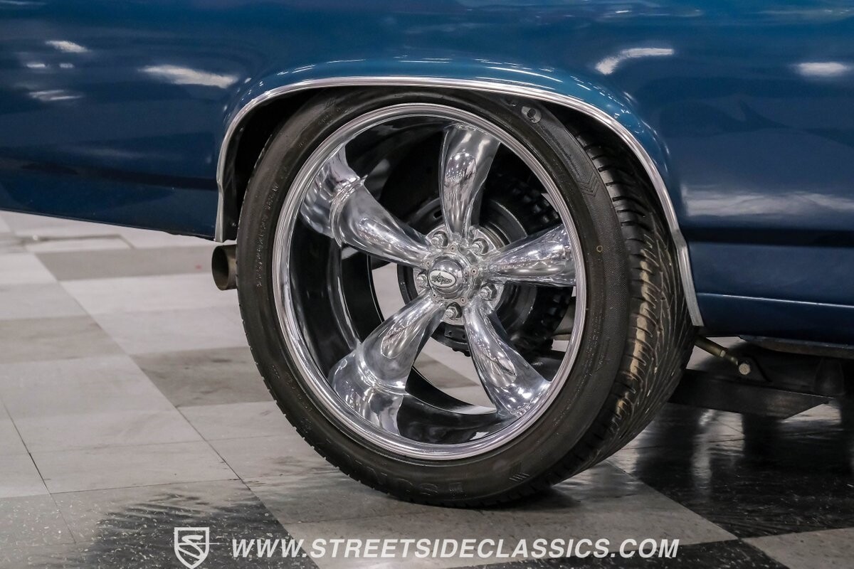 This 1970 Chevrolet El Camino SS 454 sports a Dark Blue Metallic finish accented by bold white stripes. A custom steel cowl hood amplifies its muscular profile, while chrome accents complement the paint, creating a blend of classic muscle car aesthetics and modern style. Coys wheels, 18" front and 20" rear wrapped in 245/40ZR18 and 275/40ZR20 tires, give it a commanding road presence.