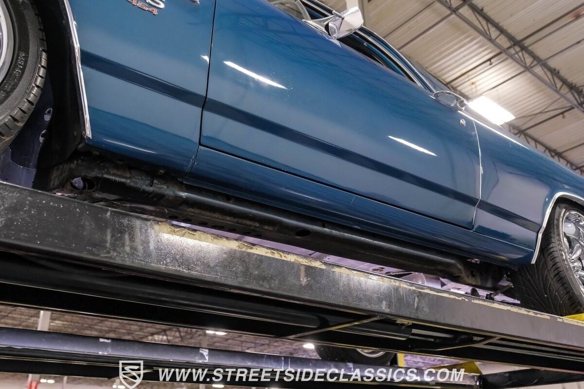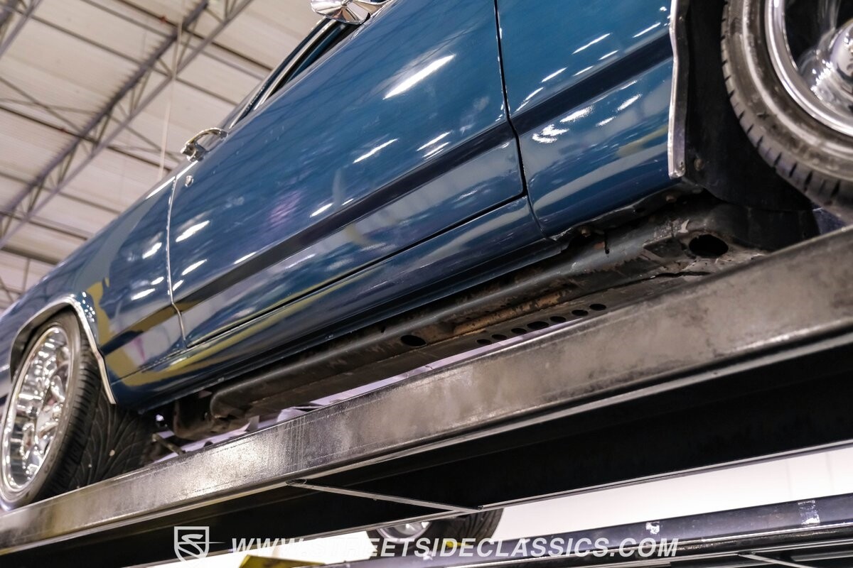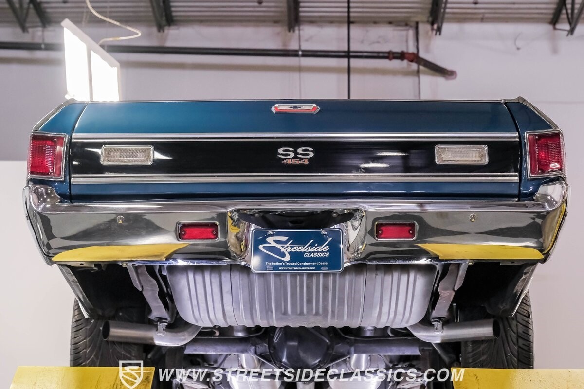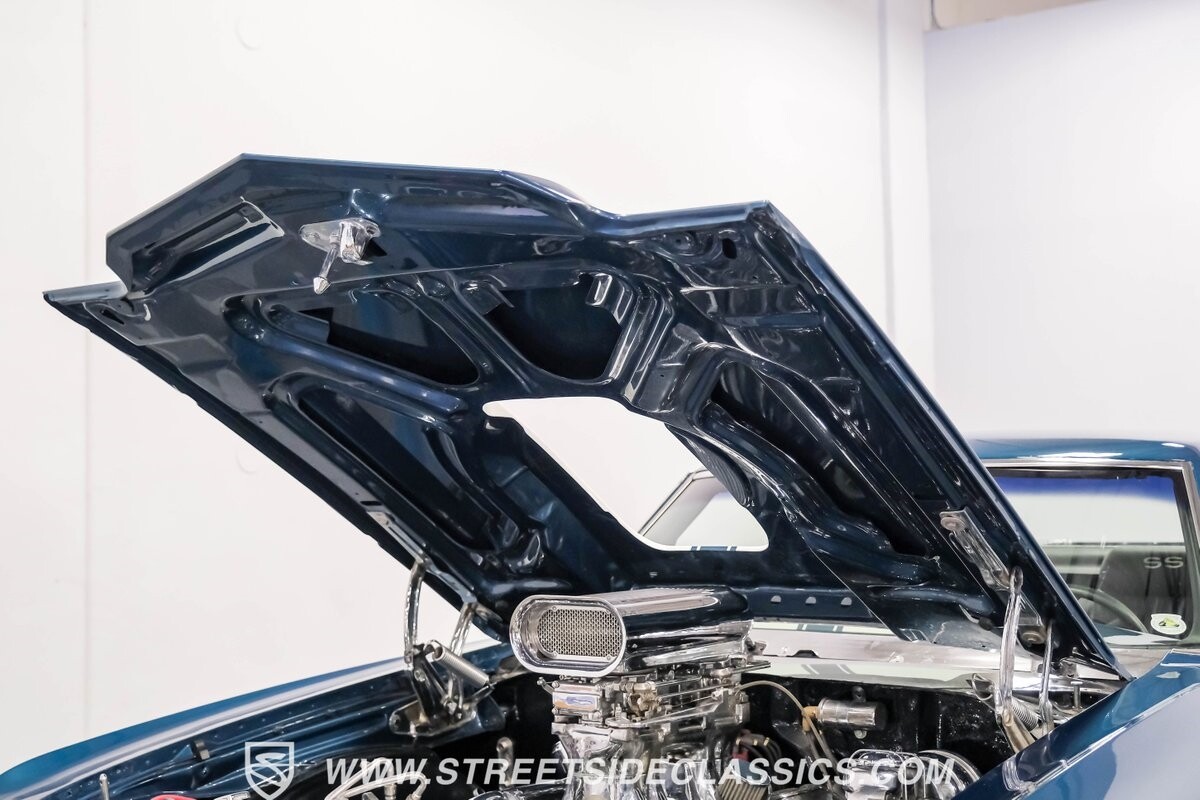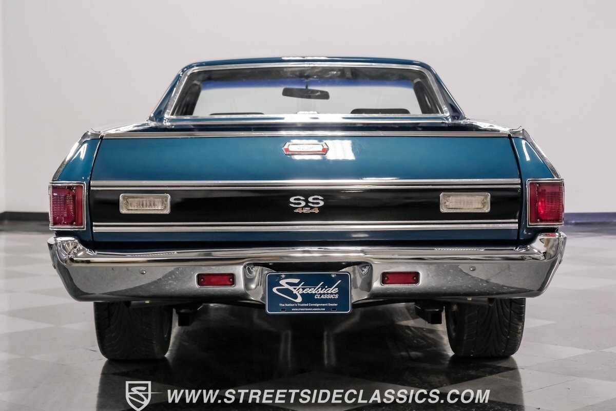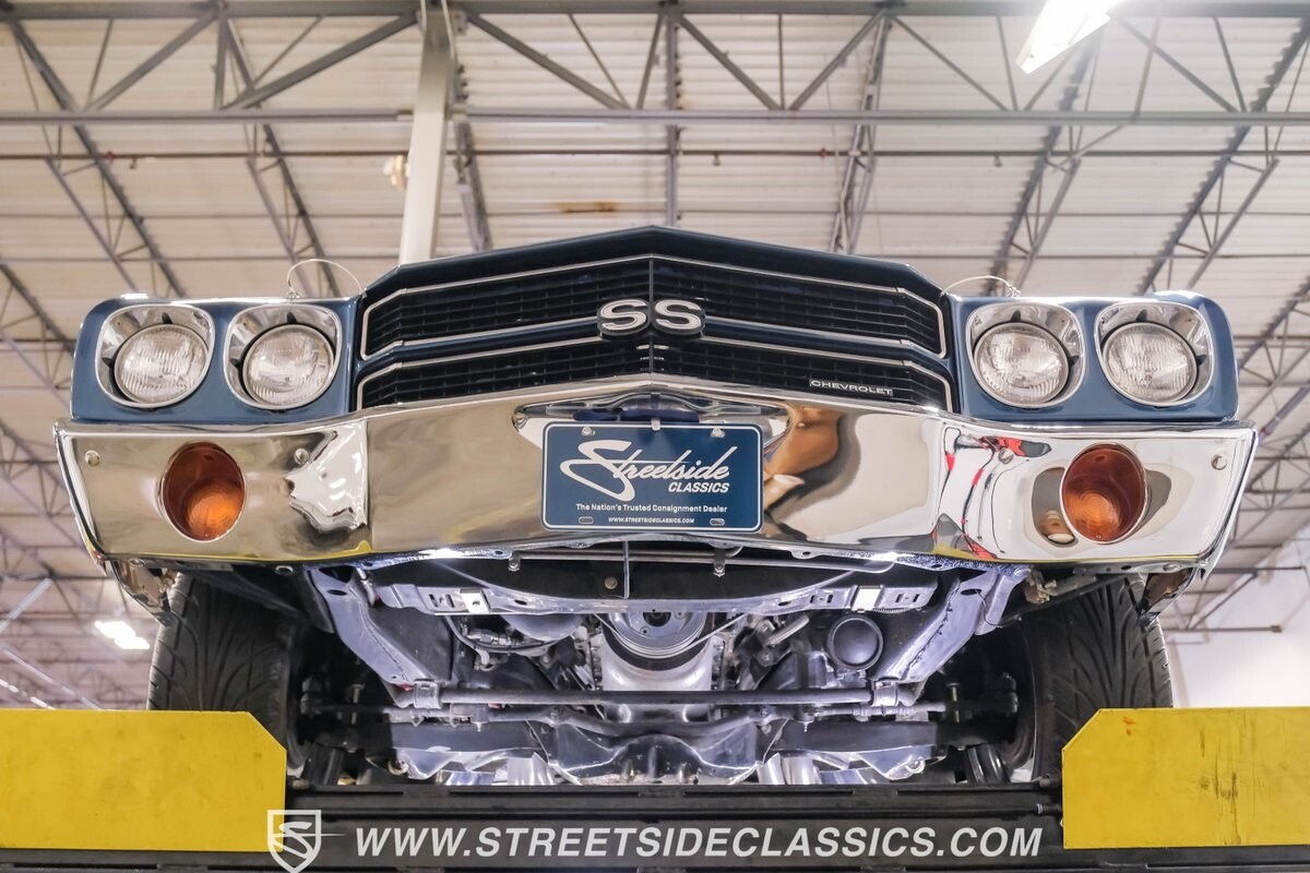 This 1970 Chevrolet El Camino SS 454 sports a Dark Blue Metallic finish accented by bold white stripes. A custom steel cowl hood amplifies its muscular profile, while chrome accents complement the paint, creating a blend of classic muscle car aesthetics and modern style. Coys wheels, 18" front and 20" rear wrapped in 245/40ZR18 and 275/40ZR20 tires, give it a commanding road presence.