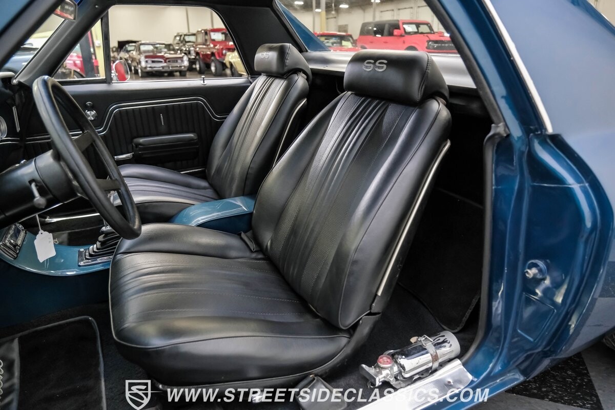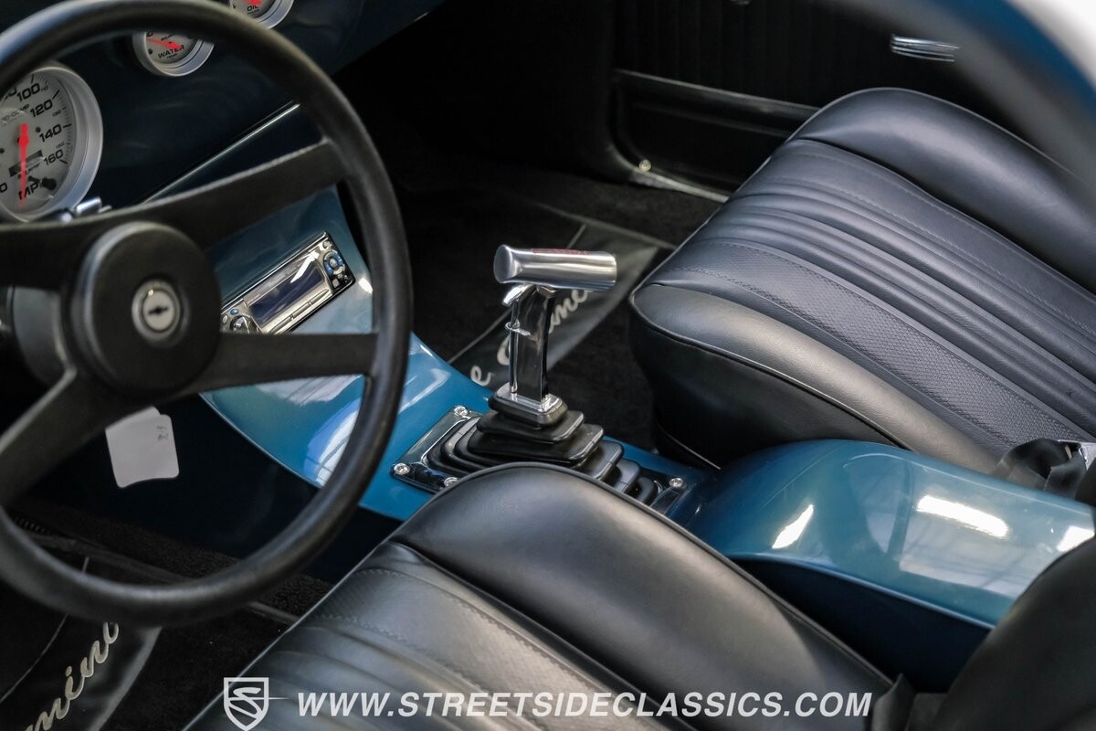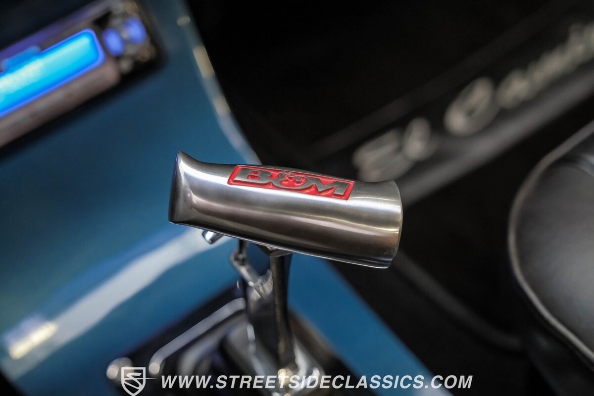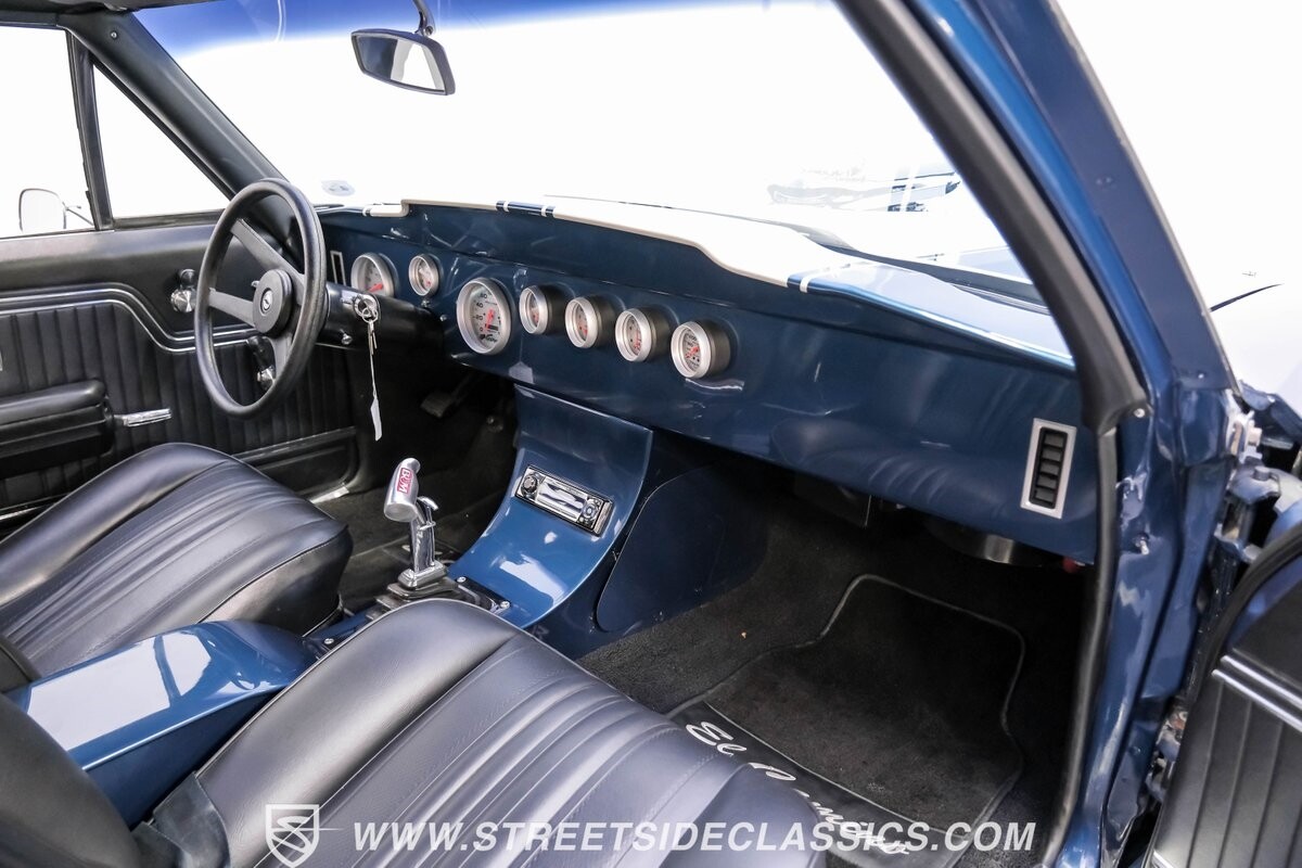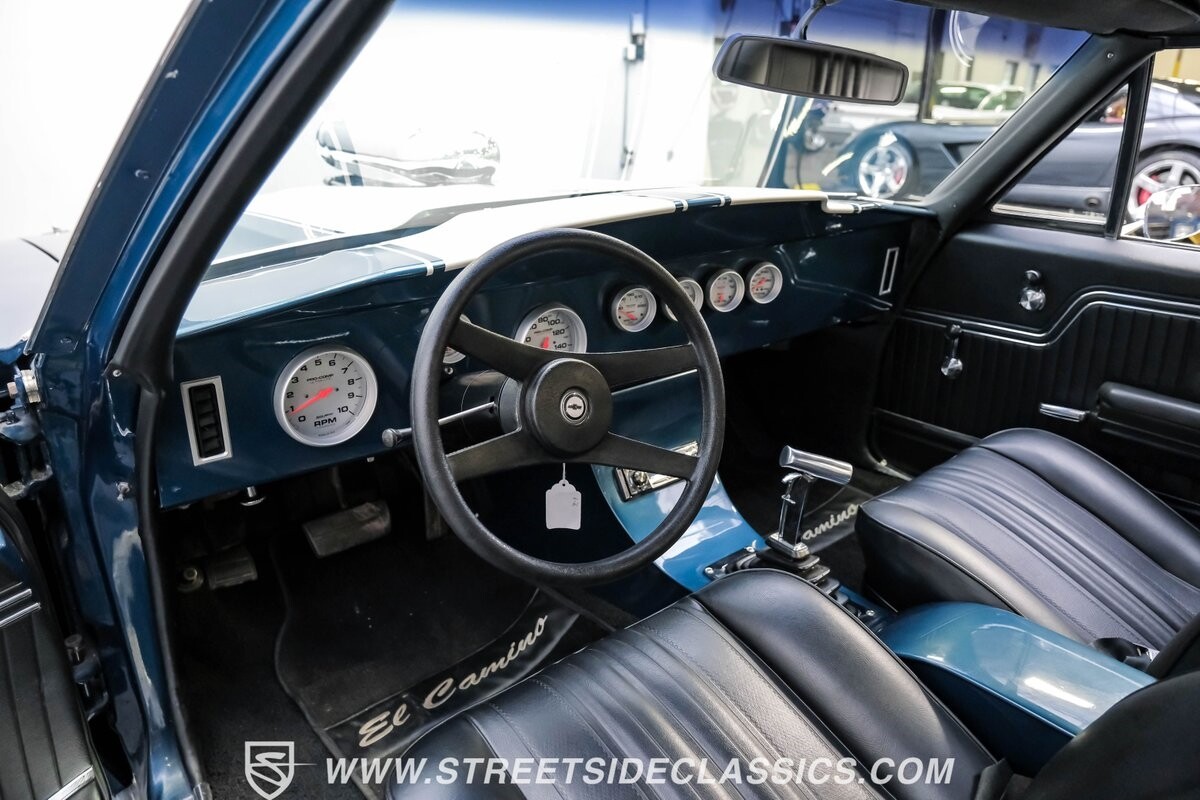 The El Camino's black vinyl interior showcases performance-oriented design. A custom-fabricated dash mimics the cowl hood's lines, featuring Autometer gauges for engine monitoring. The bespoke center console houses a B&M Quicksilver shifter and stereo controls. High-backed bucket seats display embroidered SS logos on the headrests. Plush carpeting, a clean headliner, and an aftermarket steering wheel complete the cabin. This interior balances driver focus with visual appeal, reflecting the El Camino's muscle car heritage.