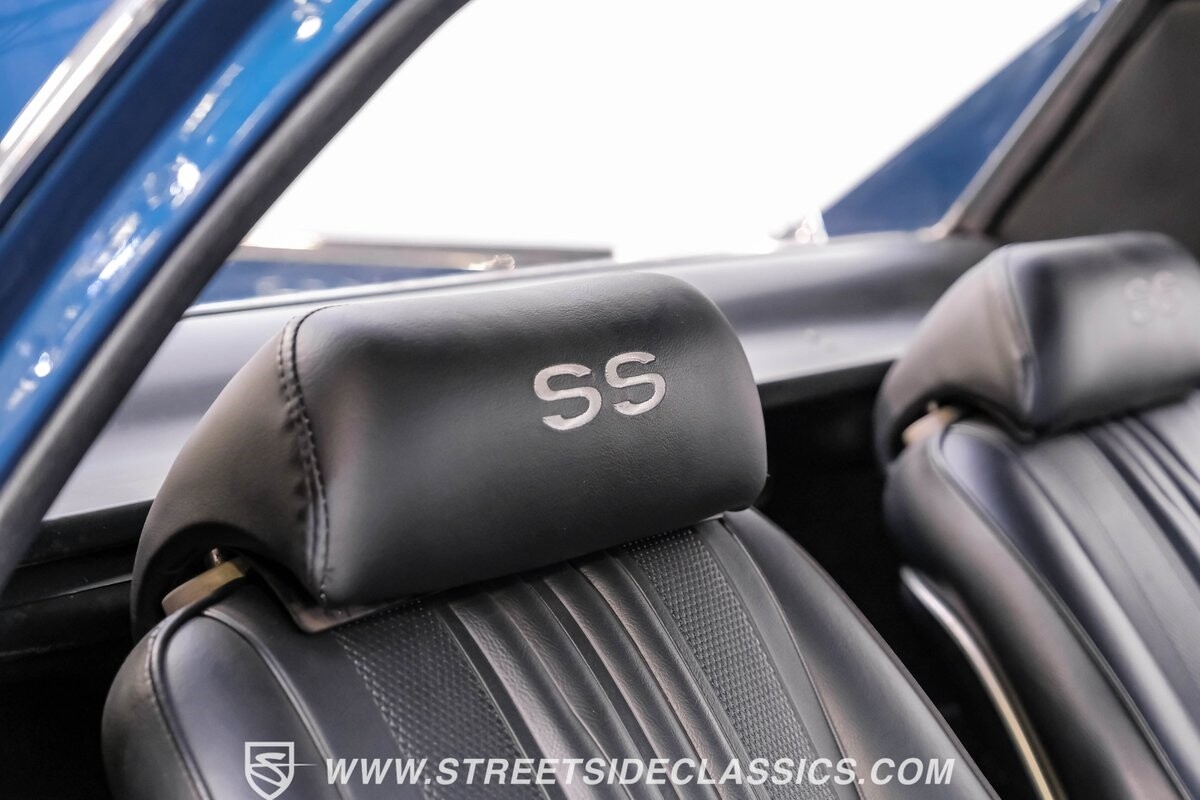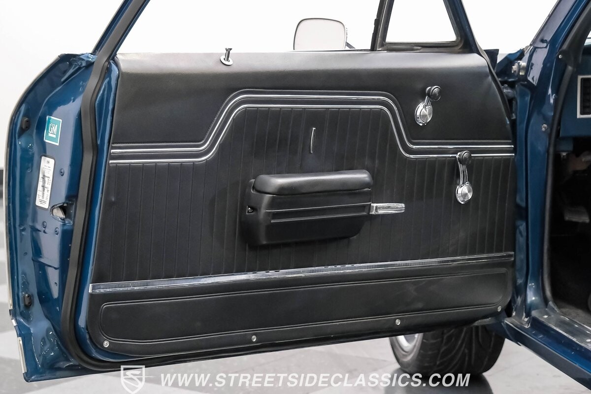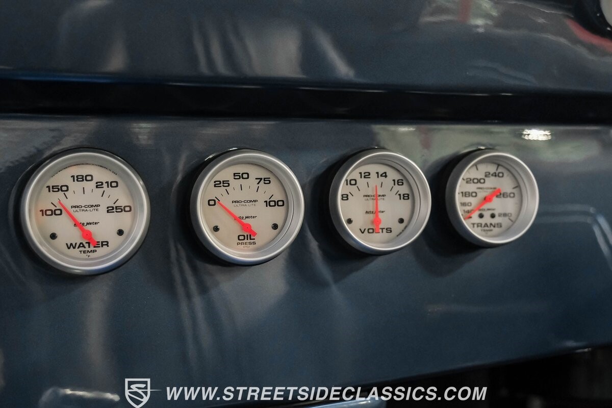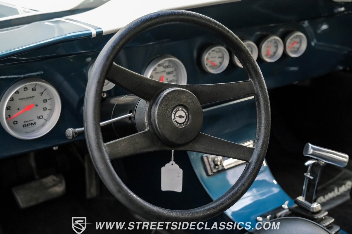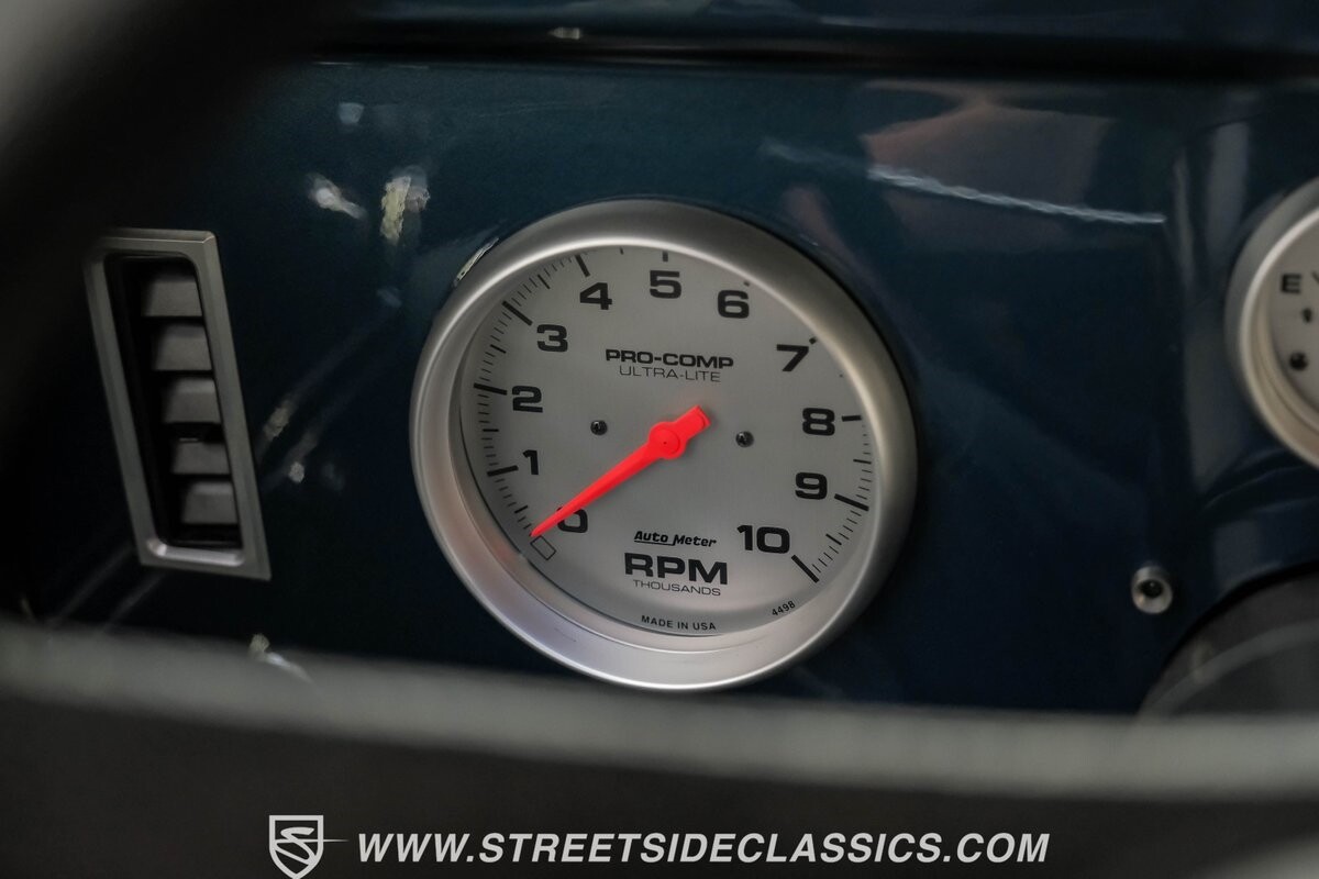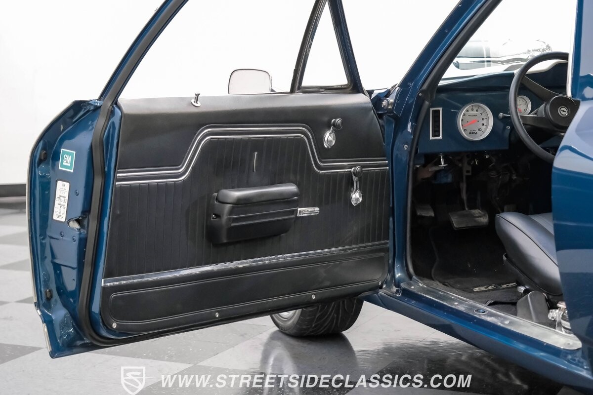 The El Camino's black vinyl interior showcases performance-oriented design. A custom-fabricated dash mimics the cowl hood's lines, featuring Autometer gauges for engine monitoring. The bespoke center console houses a B&M Quicksilver shifter and stereo controls. High-backed bucket seats display embroidered SS logos on the headrests. Plush carpeting, a clean headliner, and an aftermarket steering wheel complete the cabin. This interior balances driver focus with visual appeal, reflecting the El Camino's muscle car heritage.