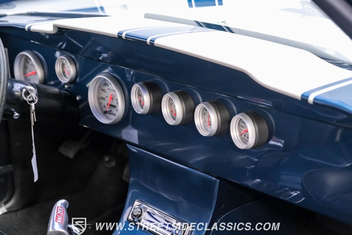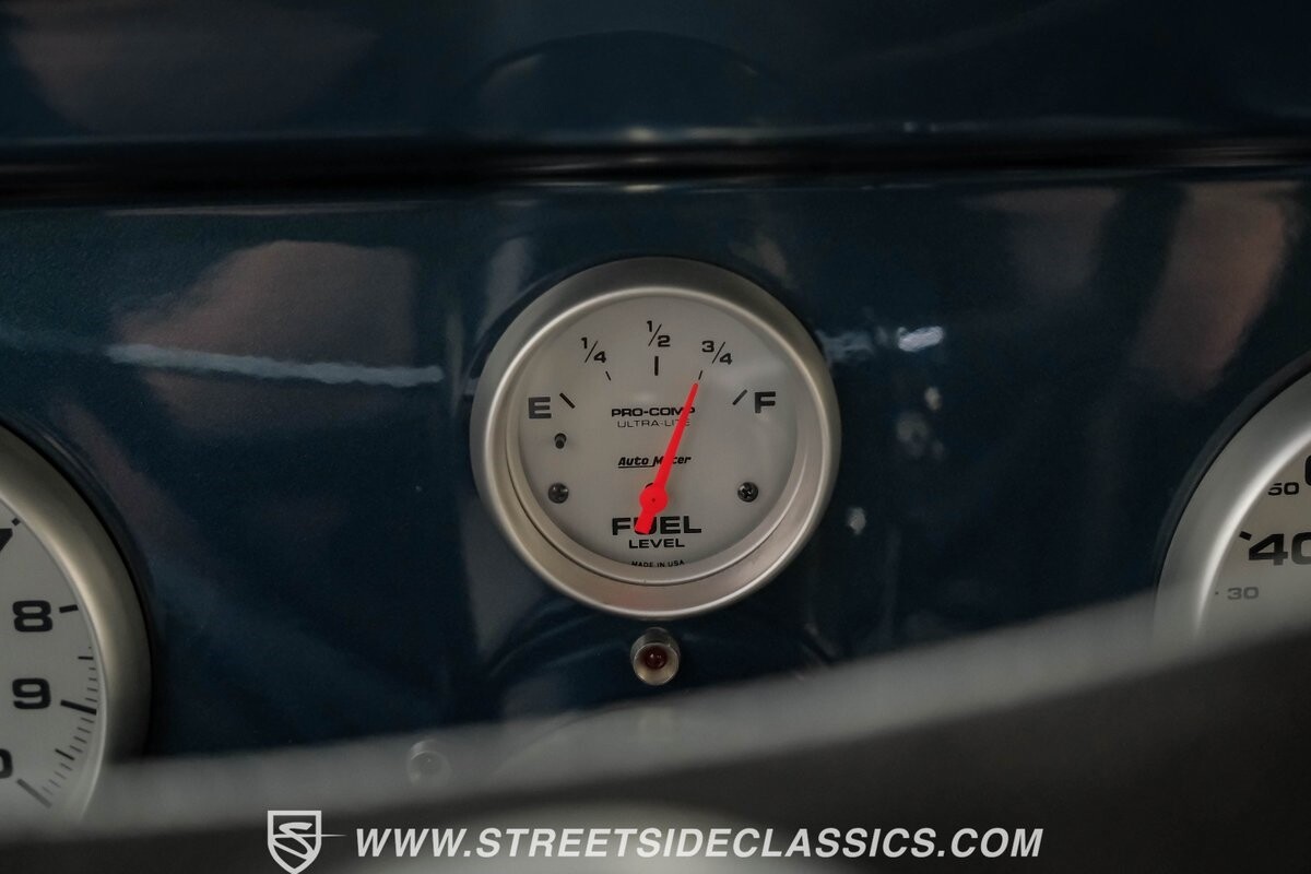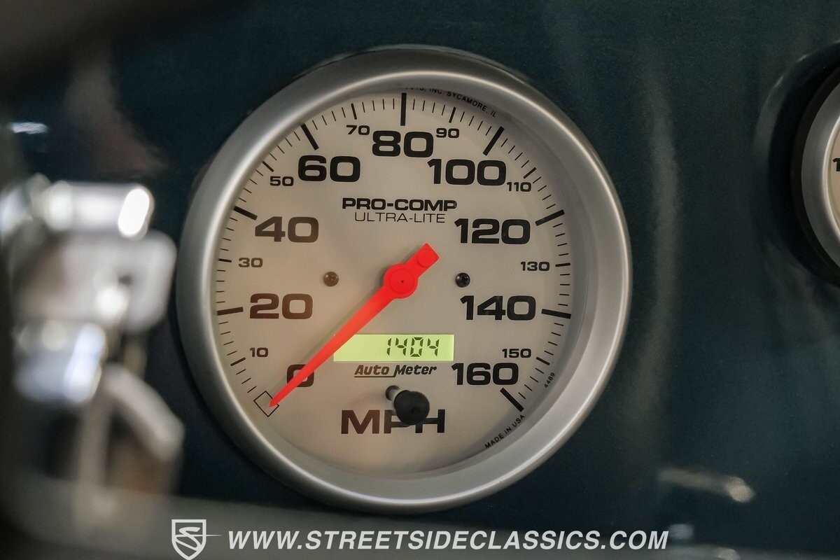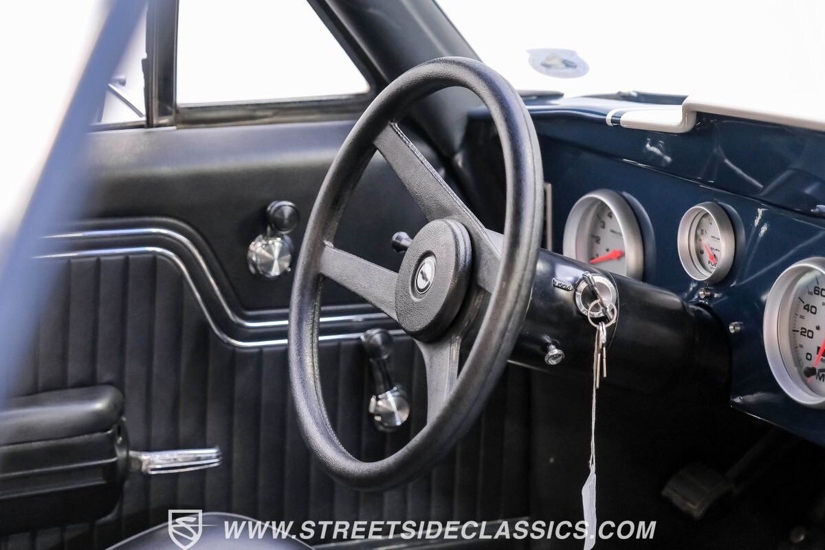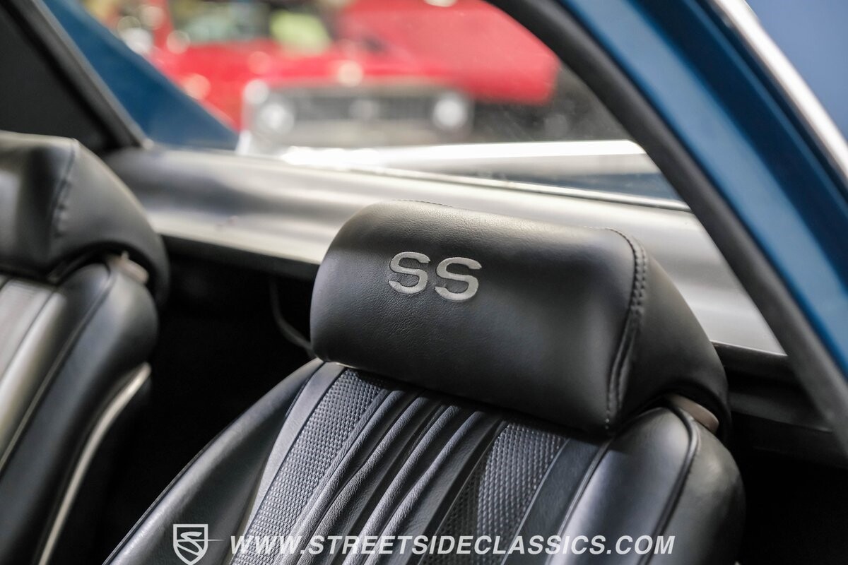 The El Camino's black vinyl interior showcases performance-oriented design. A custom-fabricated dash mimics the cowl hood's lines, featuring Autometer gauges for engine monitoring. The bespoke center console houses a B&M Quicksilver shifter and stereo controls. High-backed bucket seats display embroidered SS logos on the headrests. Plush carpeting, a clean headliner, and an aftermarket steering wheel complete the cabin. This interior balances driver focus with visual appeal, reflecting the El Camino's muscle car heritage.