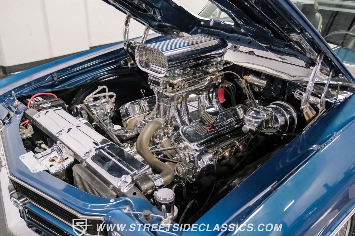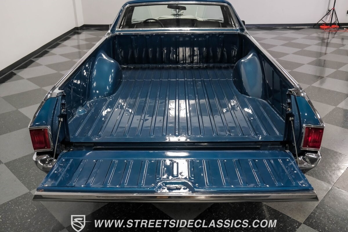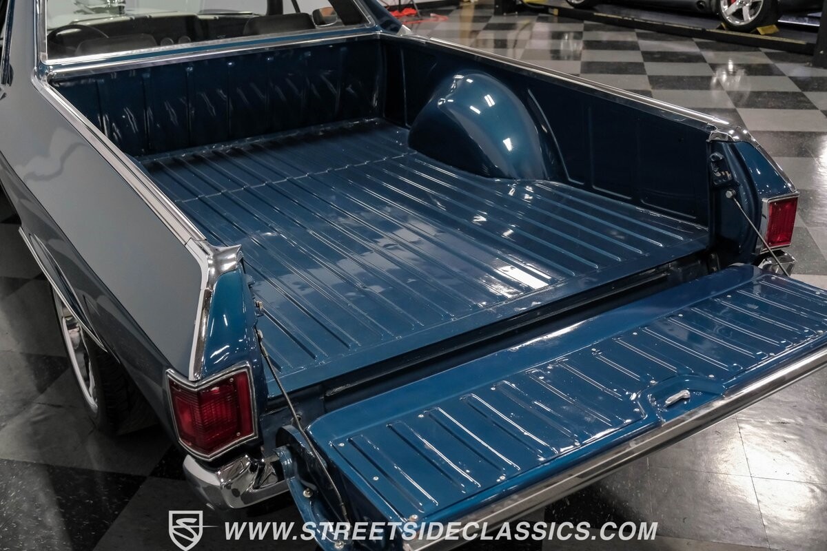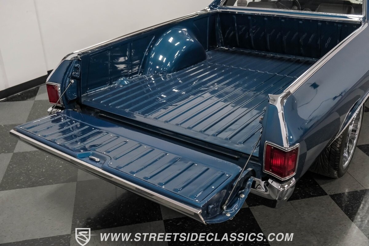 A formidable 496ci V8 stroker engine, producing 700 horsepower, powers this El Camino. Dual 4-barrel Holley carburetors sit atop a tunnel ram intake, while an MSD ignition system, Hooker headers, and FlowMaster dual exhaust enhance performance. A TH350 3-speed automatic transmission with a 3,000 stall converter efficiently transfers power to the 12-bolt rear end. The suspension setup features coil springs, shocks, and a sway bar up front, with traction bars and coil springs in the rear, delivering both straight-line performance and cornering ability.