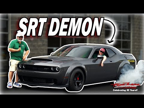 This 2018 Dodge Challenger SRT Demon for sale has a 6.2 Liter Supercharged Hemi - 808 HP (840 w/ Demon Crate), 8-Speed Automatic w/ Line Lock, Launch Assist & Transbrake, Granite Exterior Paint w/ Black Wheels, Drag Mode Suspension, 4-Piston Brembo Disc Brakes, Black Laguna Leather Interior w/ Optional Rear Seat, Optional Demon Crate w/ Narrow Drag Wheels, Instrument Panel, Floor Jack, Torque Wrench and more! Optional Trunk Carpet, Comfort Audio Group, 18x11 Aluminum Wheels with Drag Radials, 1,375 MILES-1-OWNER, BIG BAD BOY SRT DEMON W/ LOW MILES!!!
