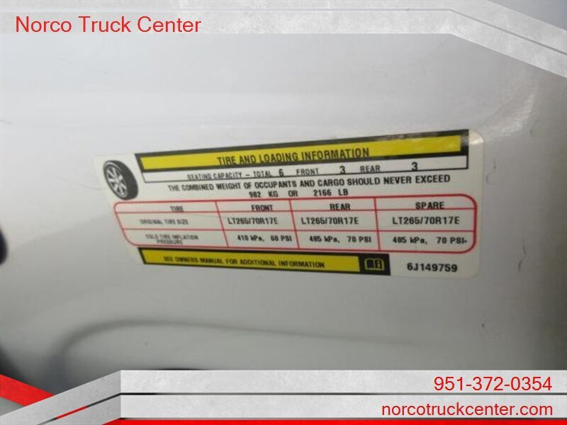 INSTALLED FEATURES: Front air conditioning, Airbag deactivation: occupant sensing passenger, Front airbags: dual, In-Dash CD: single disc, Radio: AM/FM, ABS: 4-wheel, Electronic brakeforce distribution, Front brake type: ventilated disc, Rear brake type: disc, Floor material: rubber/vinyl, Center console: front console with storage, Cupholders, Power outlet(s): front, Power steering, Steering wheel: tilt, Storage: door pockets / seatback / under seat, 4WD selector: manual hi-lo, 4WD type: part time, Axle ratio: 3.73, Front bumper color: chrome, Pickup bed light, Rear bumper color: chrome, Clock, Gauge: tachometer, Powertrain hour meter, Warnings and reminders: low fuel level, Side mirror adjustments: manual, Child safety door locks, Child seat anchors, Front seatbelts: center lap belt, Rear seatbelts: center 3-point, Seatbelt force limiters, Seatbelt pretensioners, Front headrests: adjustable, Front seat type: split-bench, Rear seat folding, Rear seat type: bench, Upholstery: vinyl, Anti-theft system: vehicle immobilizer, Front stabilizer bar, Front suspension classification: solid live axle, Rear suspension classification: solid live axle, Spare tire mount location: underbody, Spare tire size: full-size matching, Tire prefix: LT, Tire type: all season, Wheel covers: full, Wheel diameter: 17 inch, Wheels: steel, Trailer wiring, Front wipers: intermittent