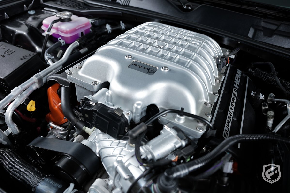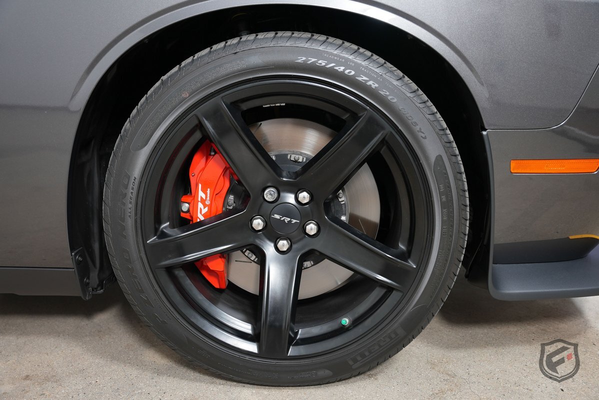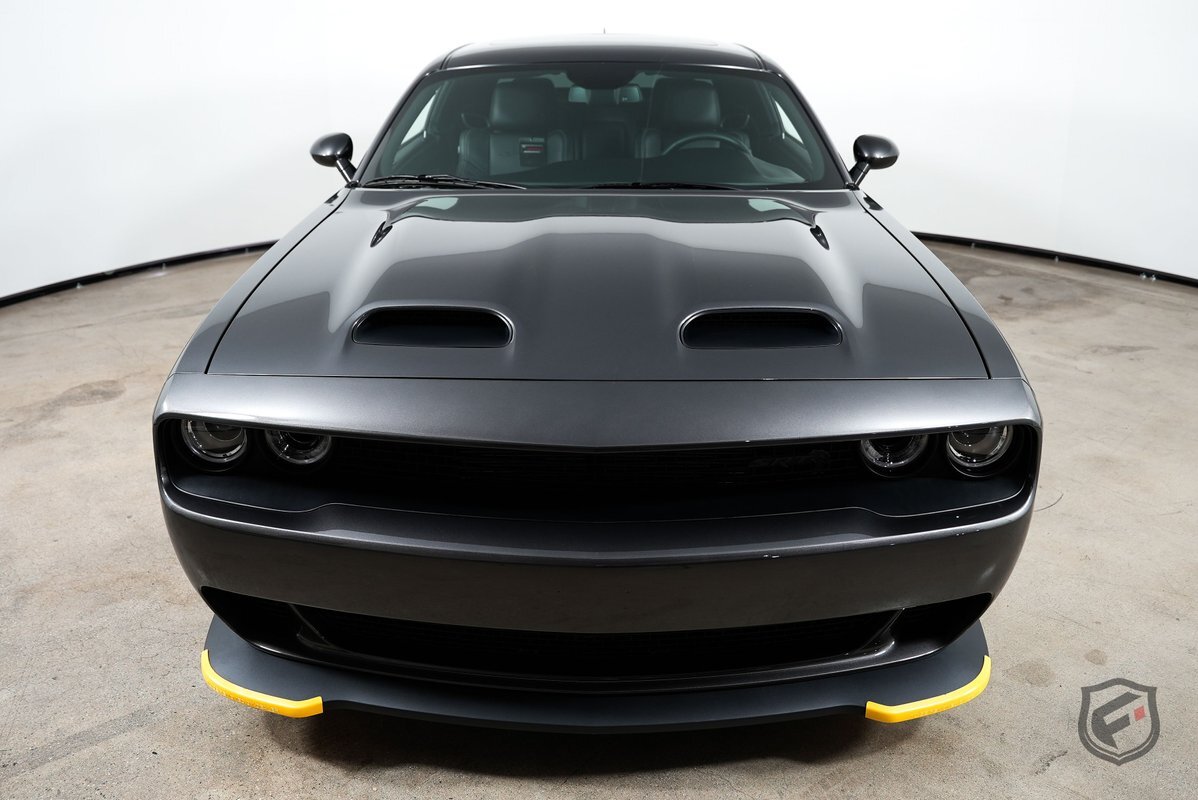 This version of the 2015 Dodge Challenger with a supercharged 6.2-liter HEMI engine is rated at 707HP and 650 lb·ft of torque. The inner driving light on the left front has been removed to allow air to get into the engine resulting in more torque, and the wheel wells are different from the standard SRT to accommodate the 20-inch aluminum wheels.