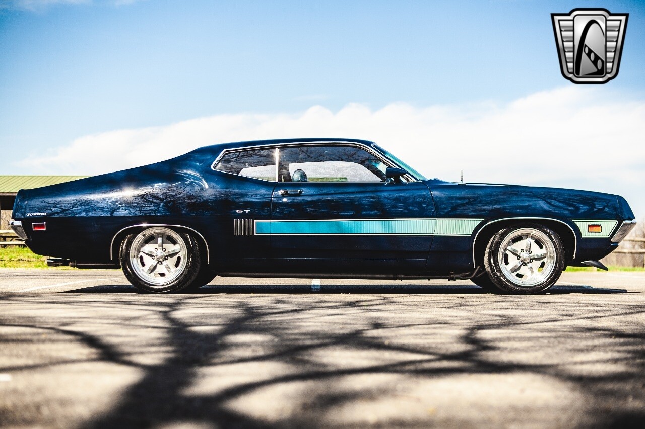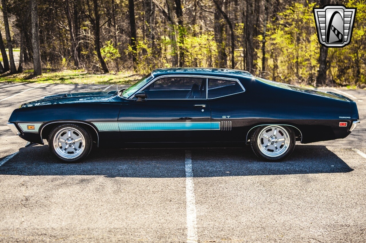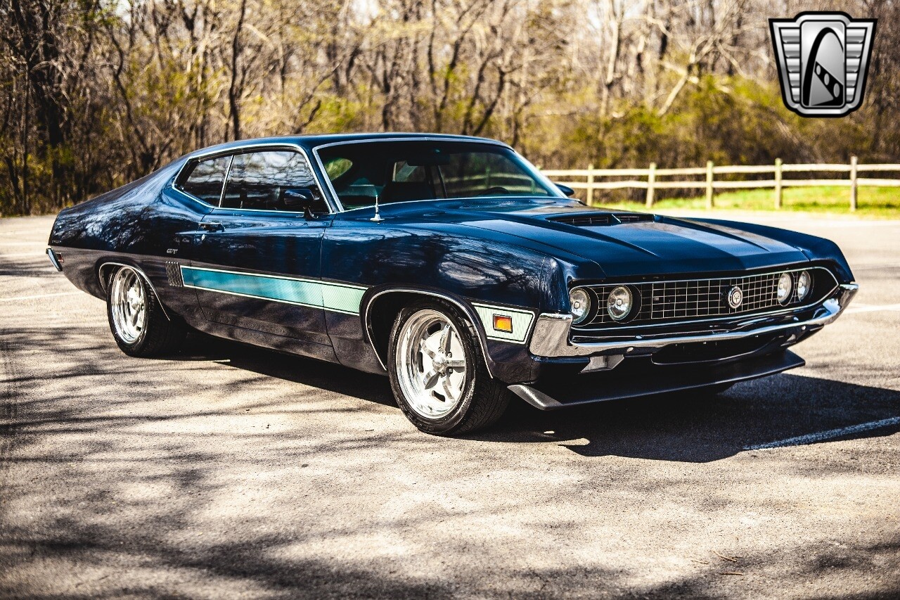 Gateway classic cars of Nashville is excited to digitally present to you this 1970 Ford Torino GT. Have you ever thought it would be great to find a car that is still owned by the original owner and the owner took this cool car and made it even cooler through the years with performance upgrades? Well here you go! This 1970 Ford Torino GT is in my opinion awesome! It looks sharp in it's deep blue paint and decals a lighter blue was used in the interior which looks stock but the notch for the shifter says otherwise. Under the hood is Blue print 347 cubic inch stroker that should be pumping out about 415 Horses. Long tube headers, Holley double pumper four barrel and H.E.I. as well as serpentine belt and aluminum radiator. This is one tight car! The trans of choice here is the Hughes performance AOD which is as new as the muscle in front of it and is controlled by a B&M shifter. To handle this power a Currie ford 9 inch rear axle holds up the rear and plants the muscle to the street and houses a set of 4.3:1 gears. Tubular control arms up front to handle the cornering and 4 wheel disc brakes because this much power requires them. This car is ready to hit the streets just to cruise or to let the boys know that grown men are here to play. Options for this 1970 Torino GT include: Air conditioning, ( needs recharge) CD player Power Rack and pinion steering and brakes, Tilt steering column, Seat belts, Posi traction and Centerline rallys . Cool Fords like this don't come along everyday!.