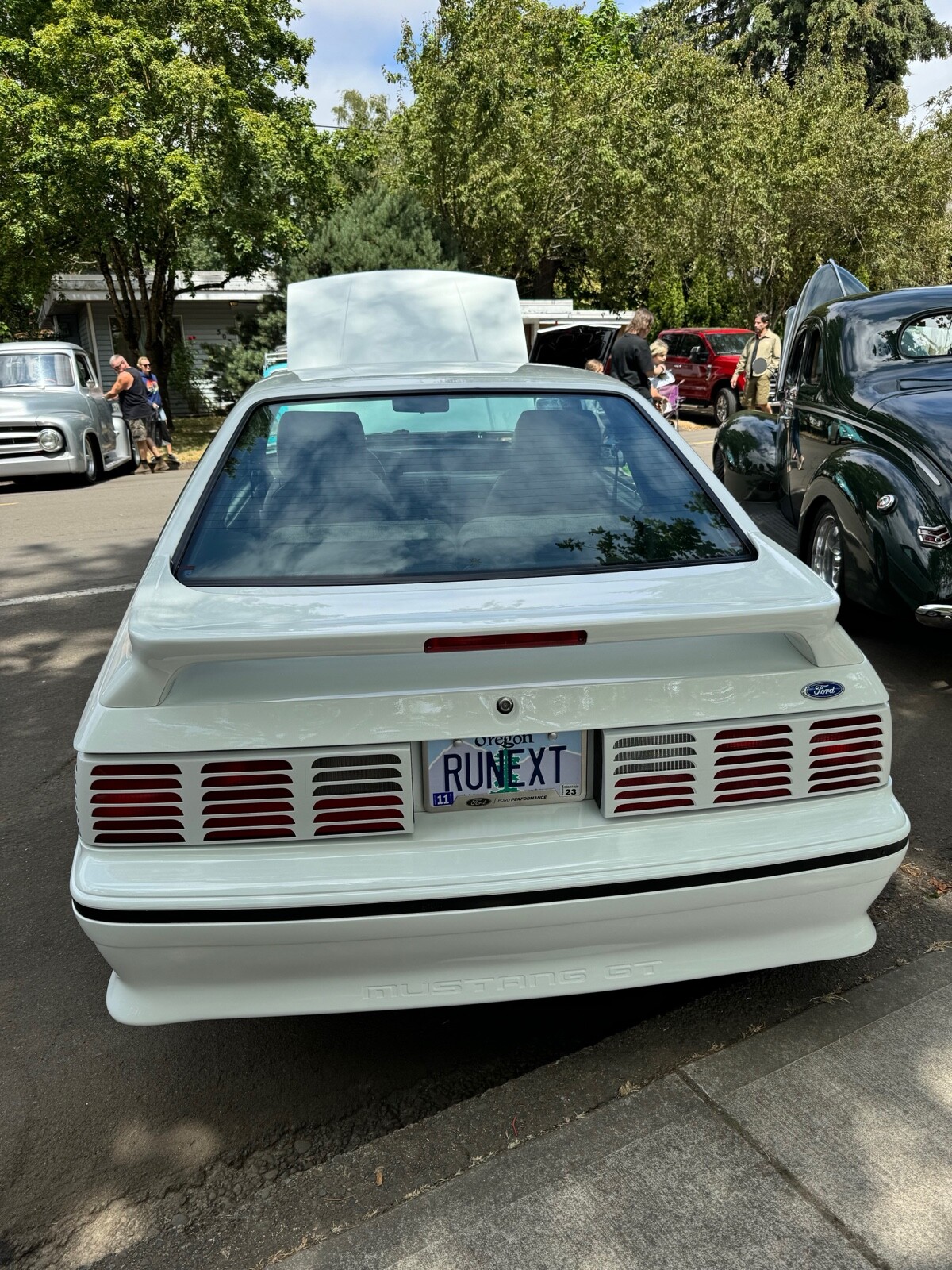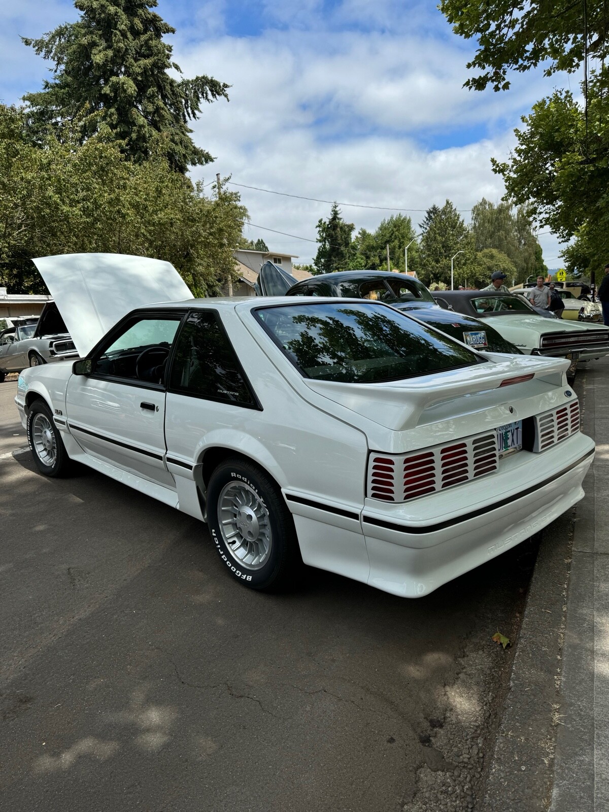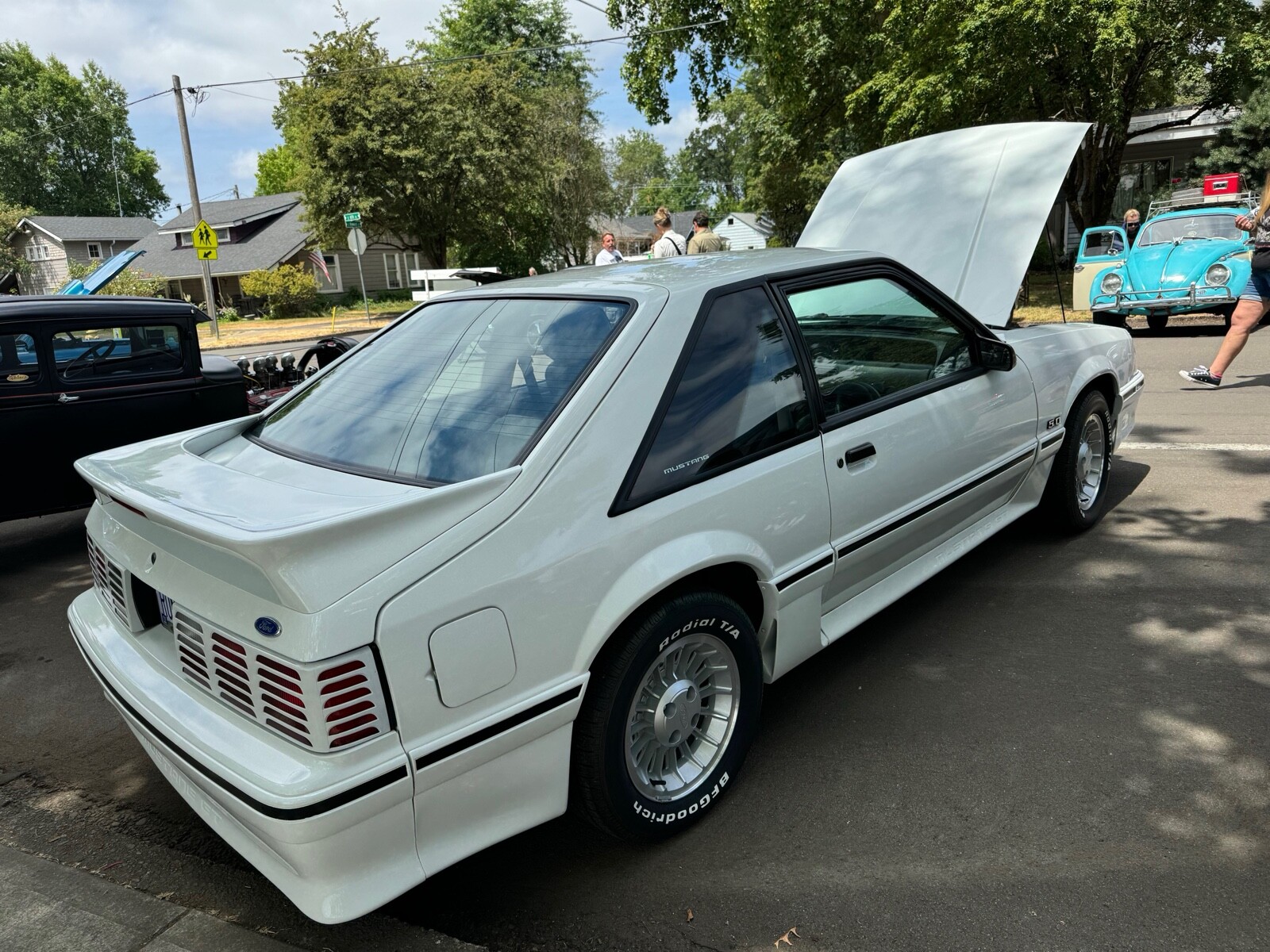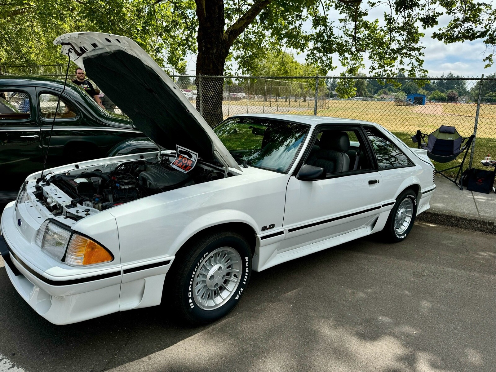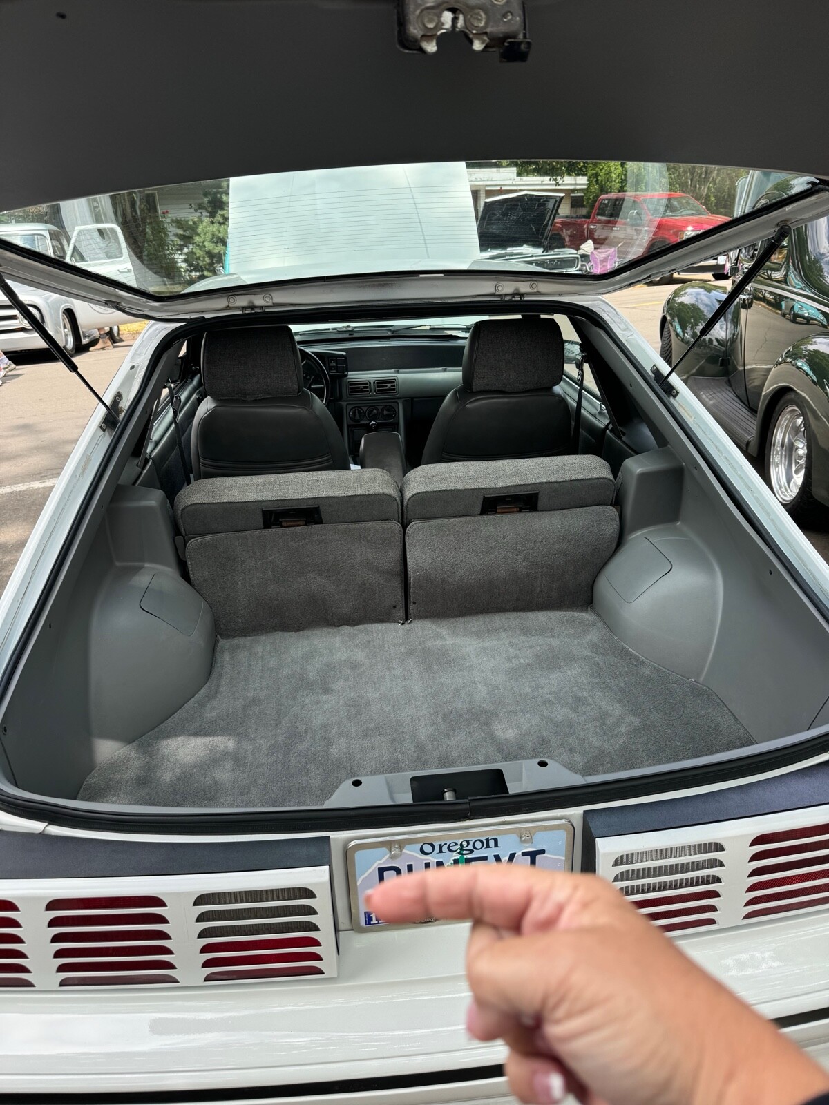 1987 Ford Mustang GT fastback. Automatic transmission, ac, ps, power locks, manual mirrors. I was told when I purchased three years ago , it is numbers matching. I can tell you all body panels , hood, rear hatch still have their original matching tags on them, but I have never checked the numbers on the engine or transmission. The underside of the car has never been painted or undercoated that I can tell. I bring this up as nothing is being “hidden “. The car still has the original rear end tag. The engine and engine compartment are , I believe, untouched. The interior is all original with the exception of the headliner was replaced as it was sagging and the carpeting was replaced as it was generally just worn out. The car has been repainted in the original color about two years ago. Tires were replaced about 2 years ago but the car is driven less than 100 miles a year so have little to no miles on them. That’s all I can think of but feel free to ask any questions.