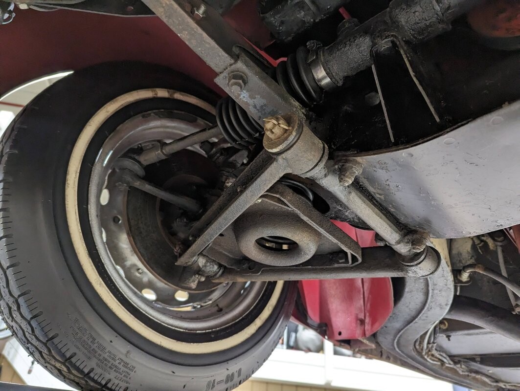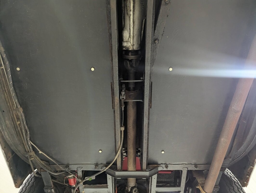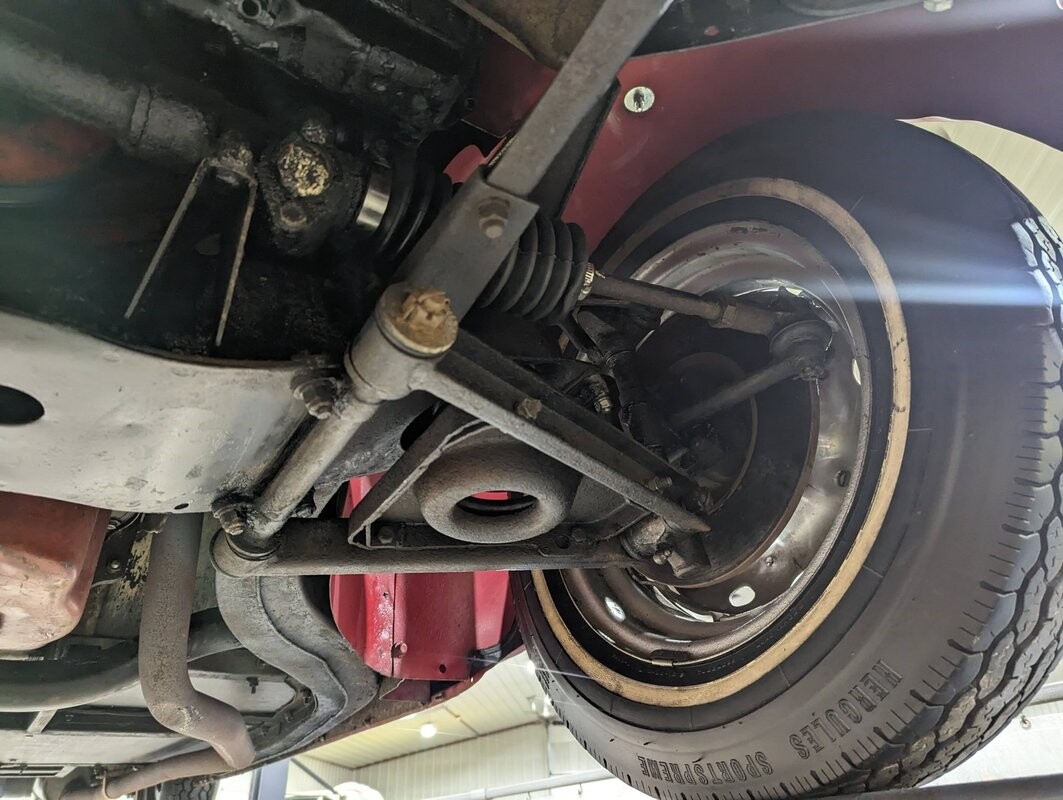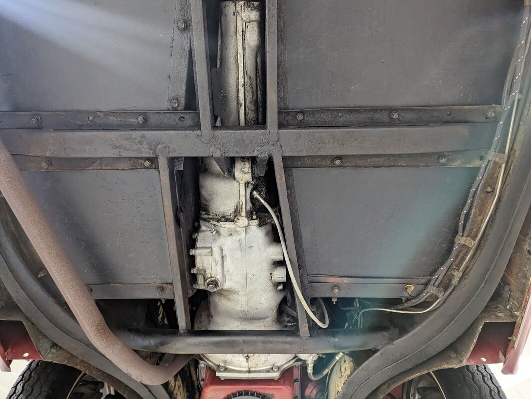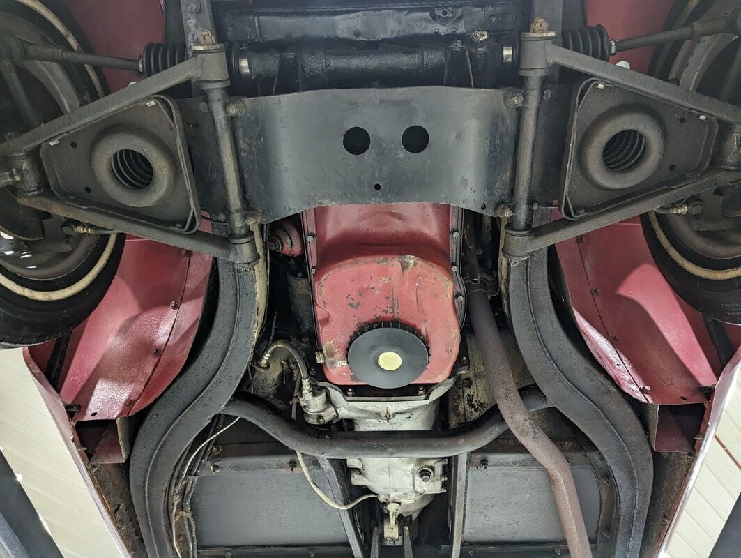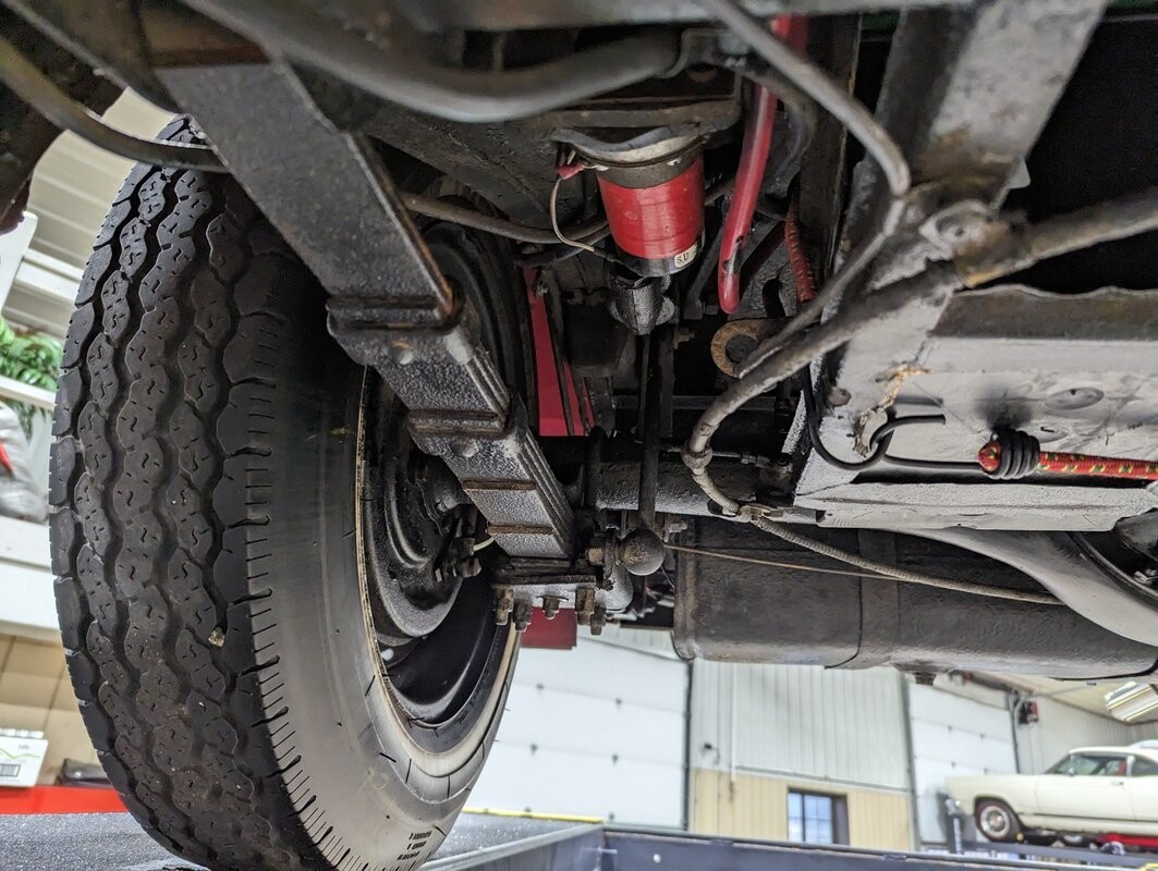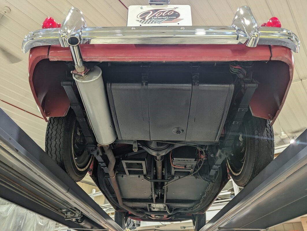 UNDERSIDE: Ground up restoration that's rust free. Everything was gone through. The independent front suspension looks to be in great shape. It features rack and pinion steering and front disc brakes. The rear leaf springs were replaced, and the rear drum brakes rebuilt. Braided fuel lines were installed, and the gas tank was cleaned, prepped, and painted black. The fuel tank was refurbished and painted a nice satin black. The correct exhaust is hung properly and has a newer coated Walker muffler. The engine is painted and looks clean. It's mated to its correct 4 speed manual transmission. The rear end has been prepped, painted, and refinished in satin black. The frame and floors were stripped, prepped, and undercoated in a black texture guard.