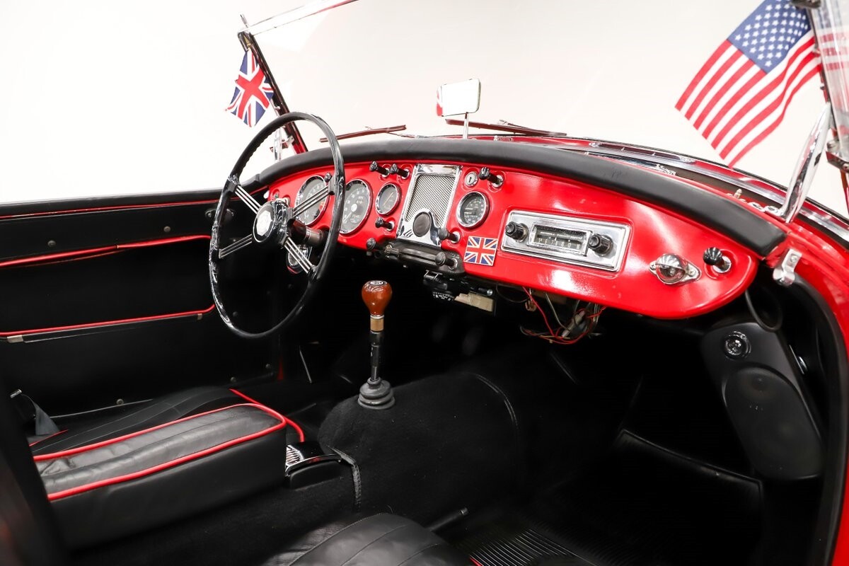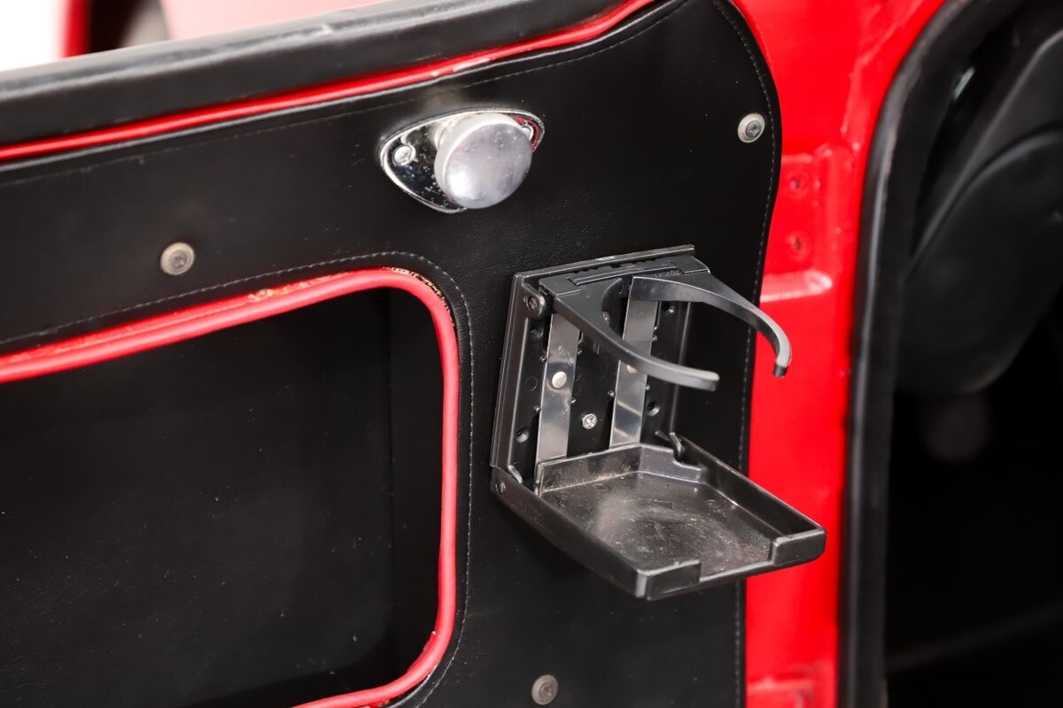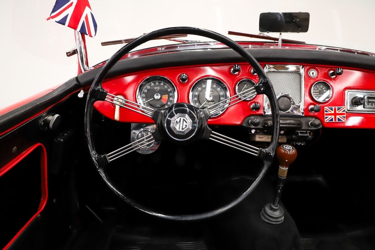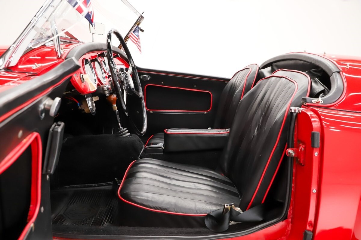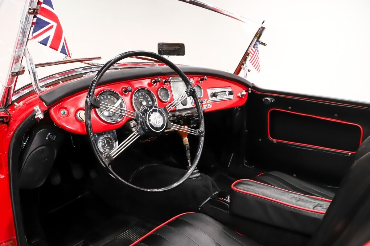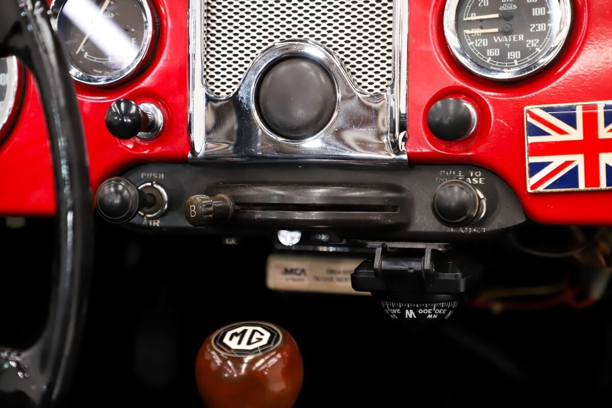 INTERIOR: The cabin is simplistic yet intriguing. The dash reminds you of an airplane cockpit. The gauges are stylish, matching, and complete with tachometer. It's even equipped with the factory AM radio and hidden under the dash is an 8-track player and speakers. Comfortable black with red piping bucket seats make driving this pleasurable. Other options include adjustable choke and throttle, and map lighting for your passenger to guide you on your road trip. Our favorite feature must be the original style 4 speed shifter coming up from the floor and completed with an authentic MG wood shift knob.