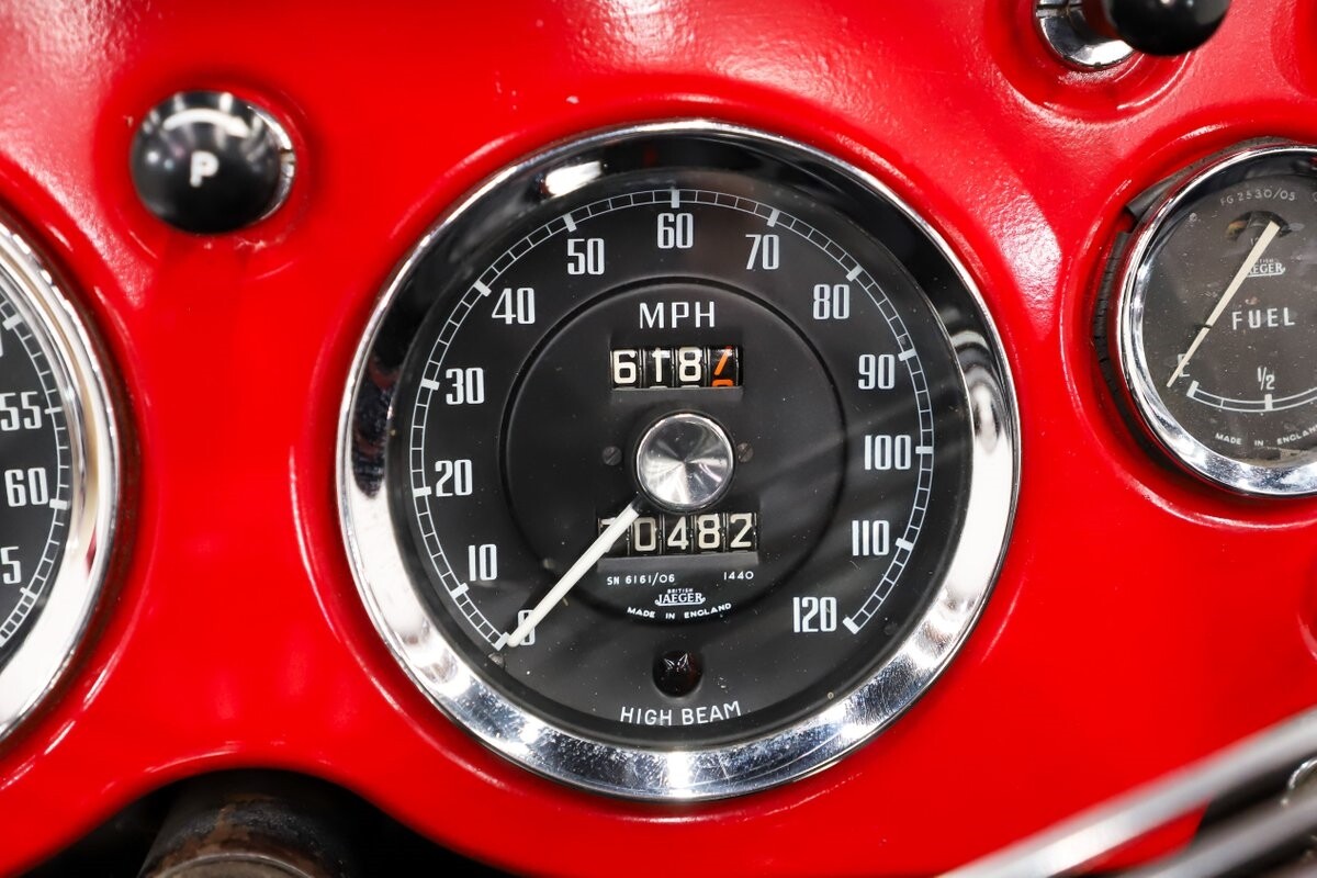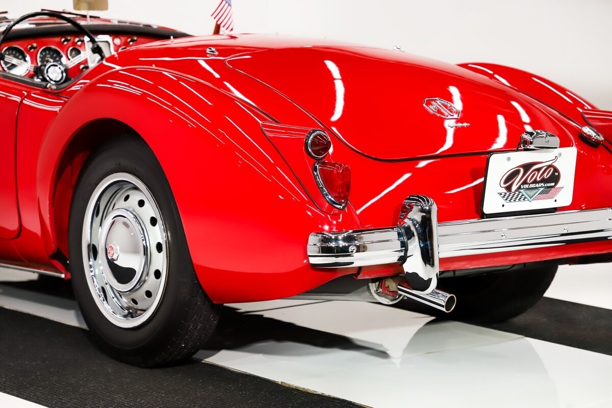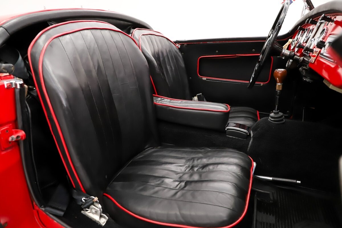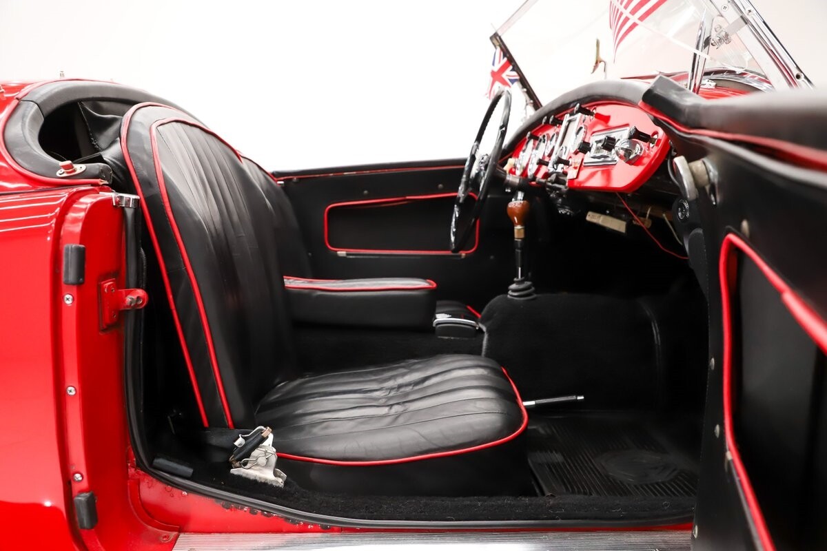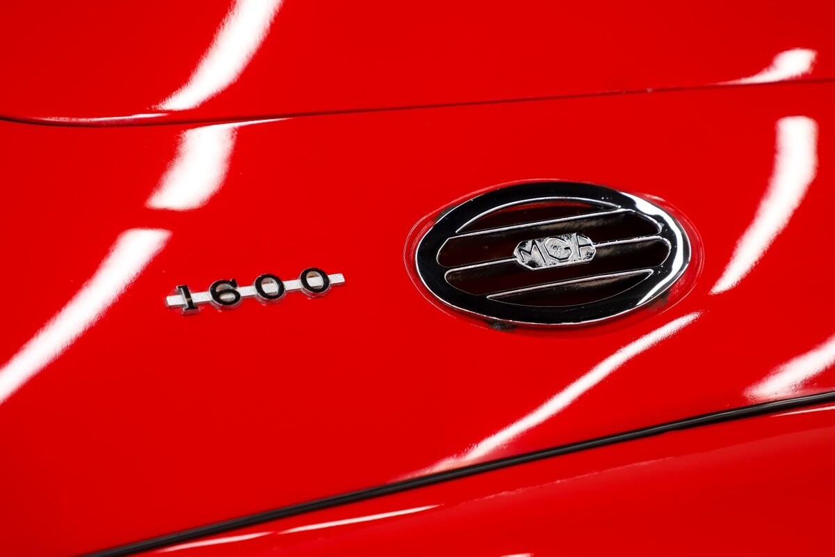 INTERIOR: The cabin is simplistic yet intriguing. The dash reminds you of an airplane cockpit. The gauges are stylish, matching, and complete with tachometer. It's even equipped with the factory AM radio and hidden under the dash is an 8-track player and speakers. Comfortable black with red piping bucket seats make driving this pleasurable. Other options include adjustable choke and throttle, and map lighting for your passenger to guide you on your road trip. Our favorite feature must be the original style 4 speed shifter coming up from the floor and completed with an authentic MG wood shift knob.