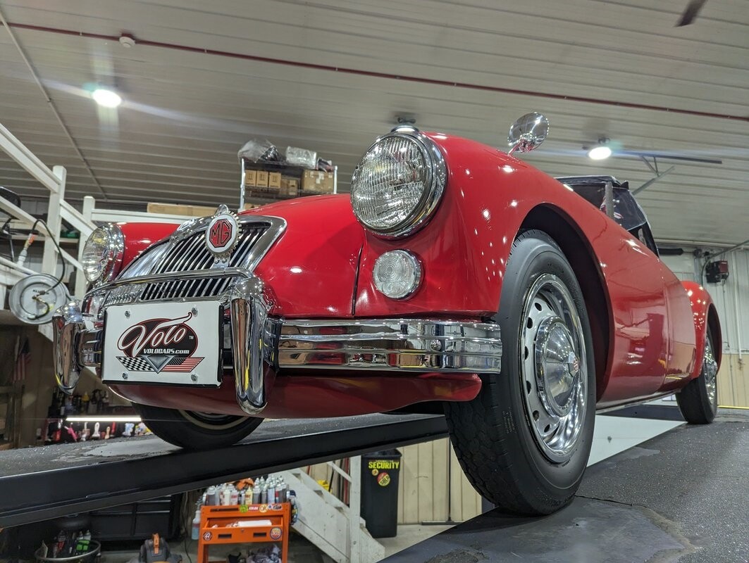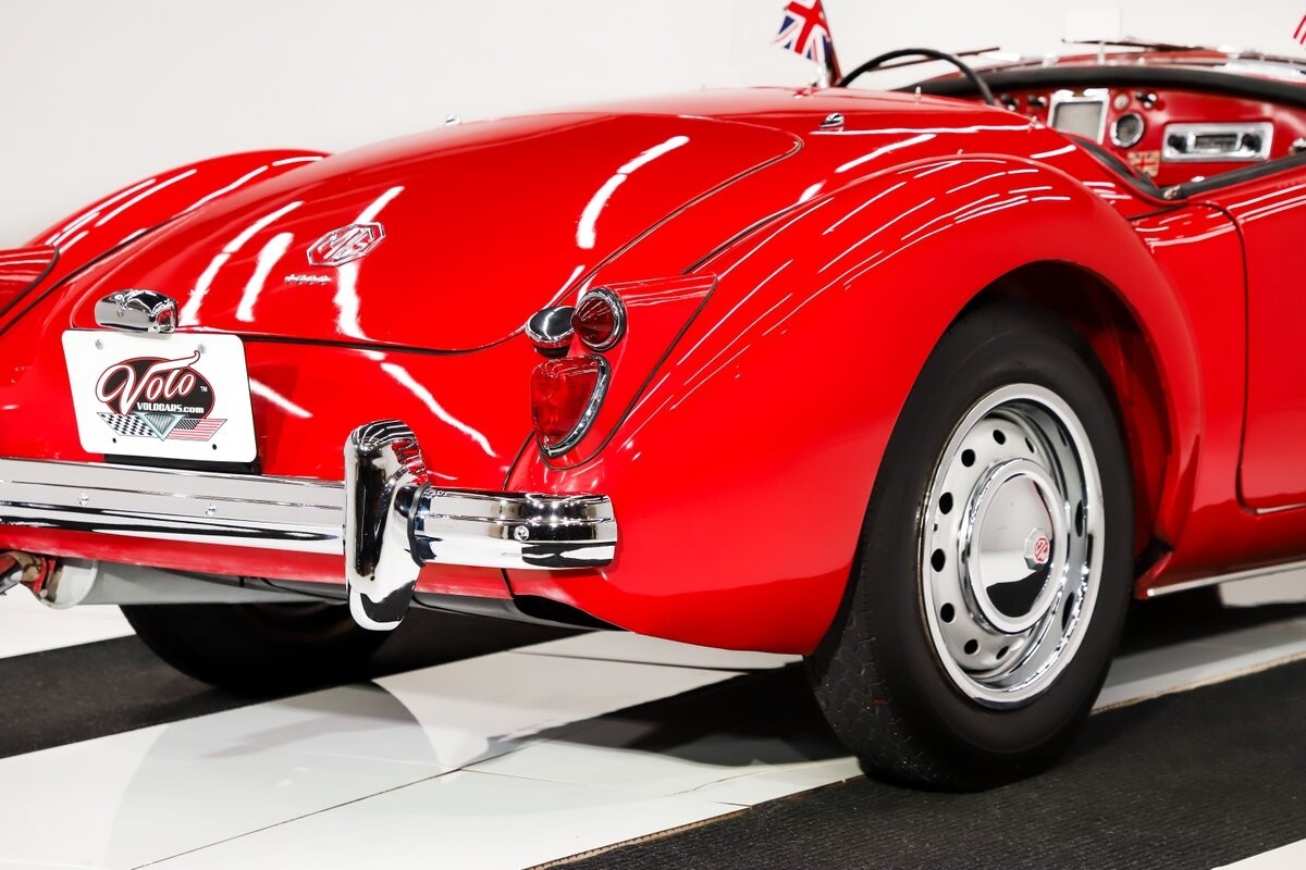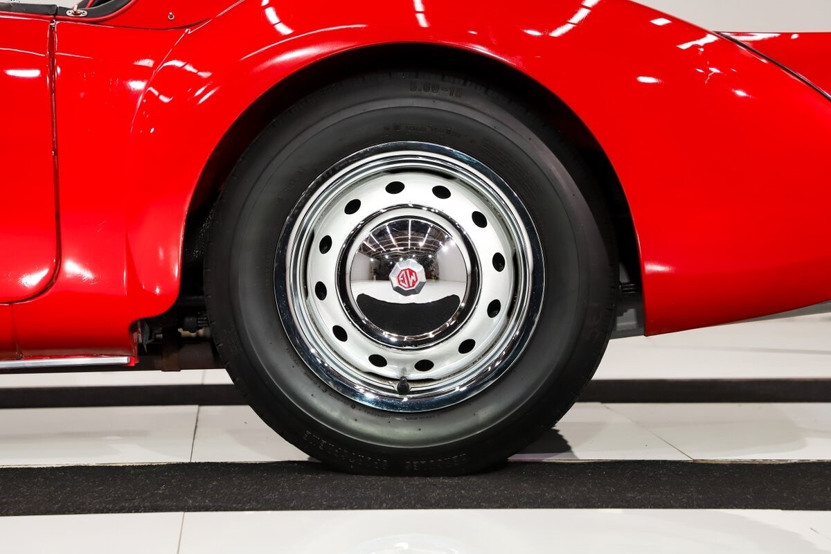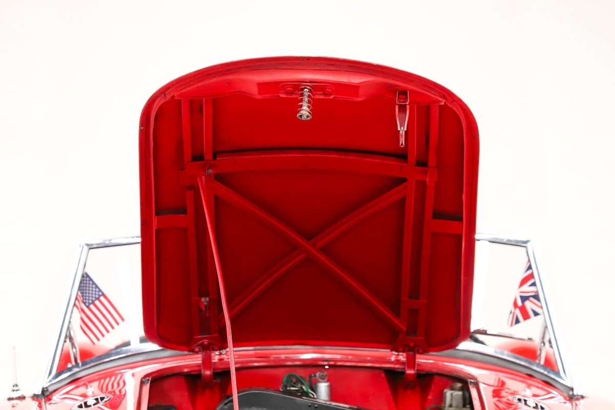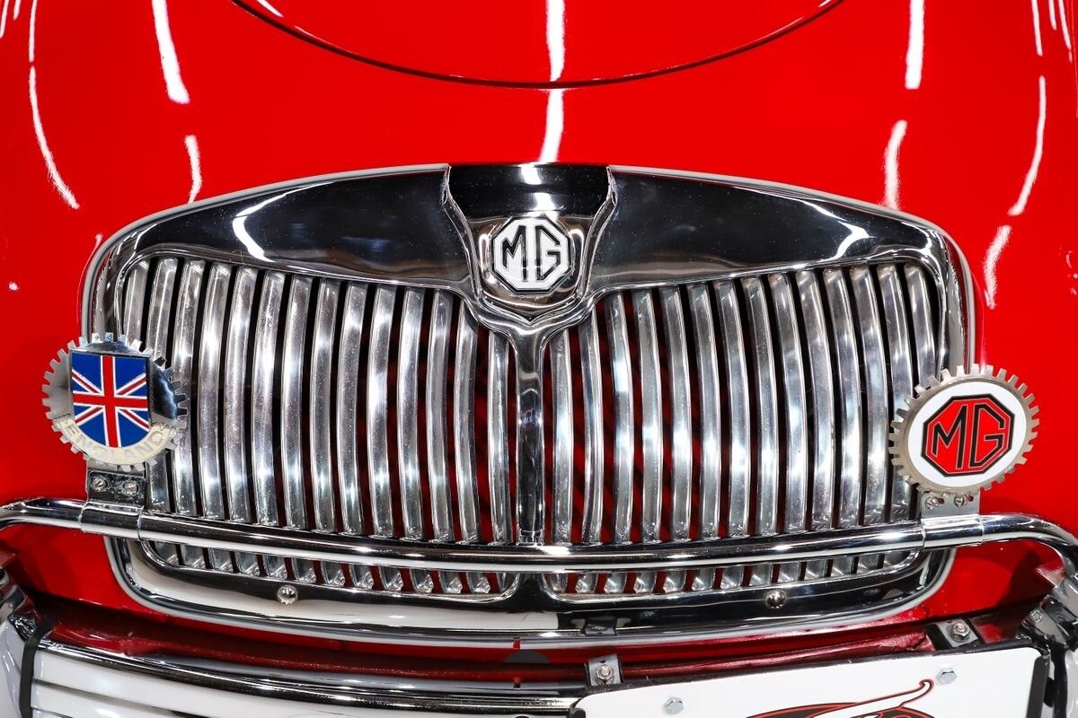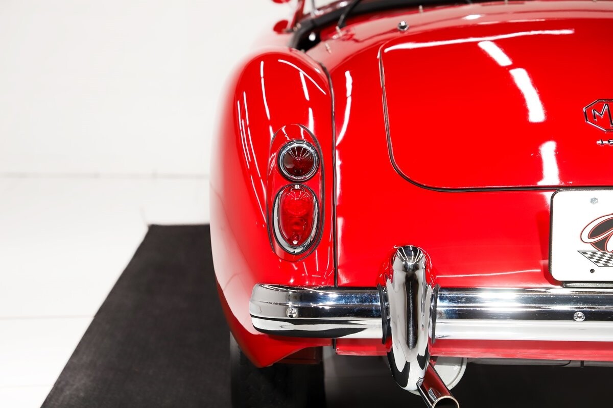 INTERIOR: The cabin is simplistic yet intriguing. The dash reminds you of an airplane cockpit. The gauges are stylish, matching, and complete with tachometer. It's even equipped with the factory AM radio and hidden under the dash is an 8-track player and speakers. Comfortable black with red piping bucket seats make driving this pleasurable. Other options include adjustable choke and throttle, and map lighting for your passenger to guide you on your road trip. Our favorite feature must be the original style 4 speed shifter coming up from the floor and completed with an authentic MG wood shift knob.