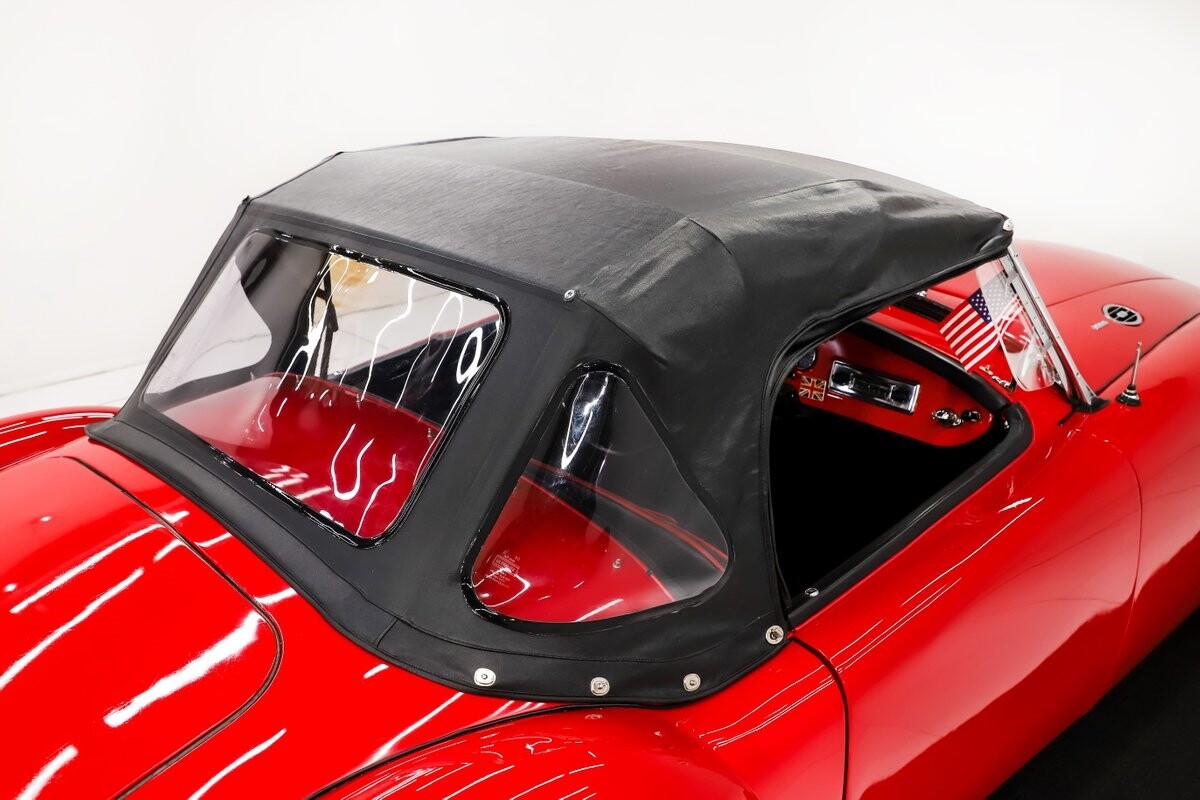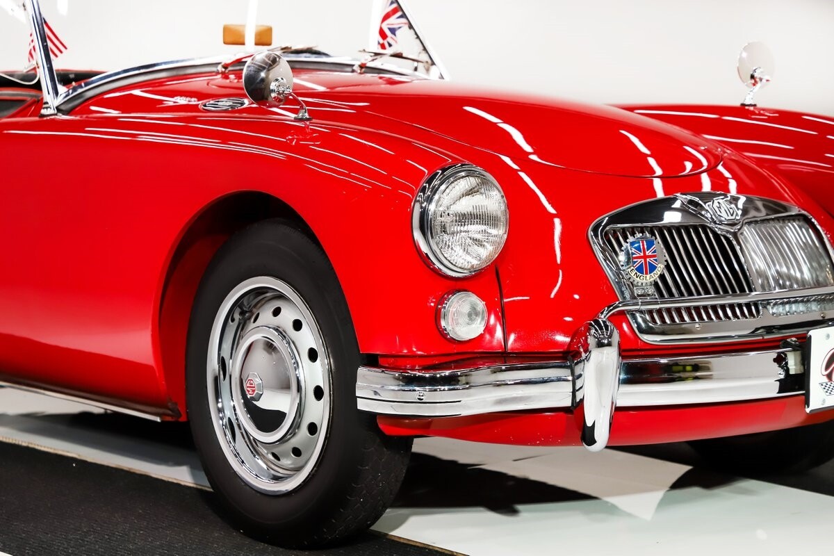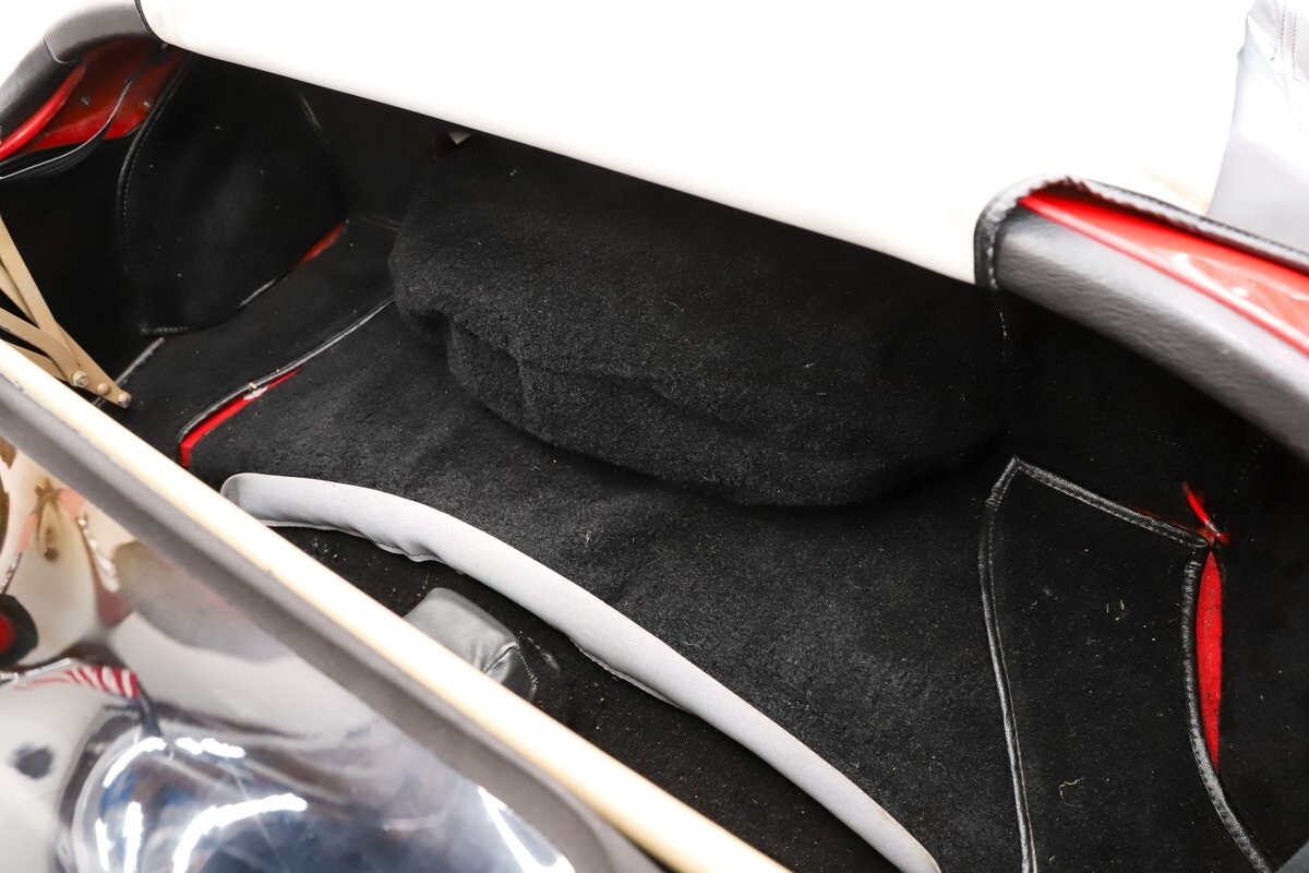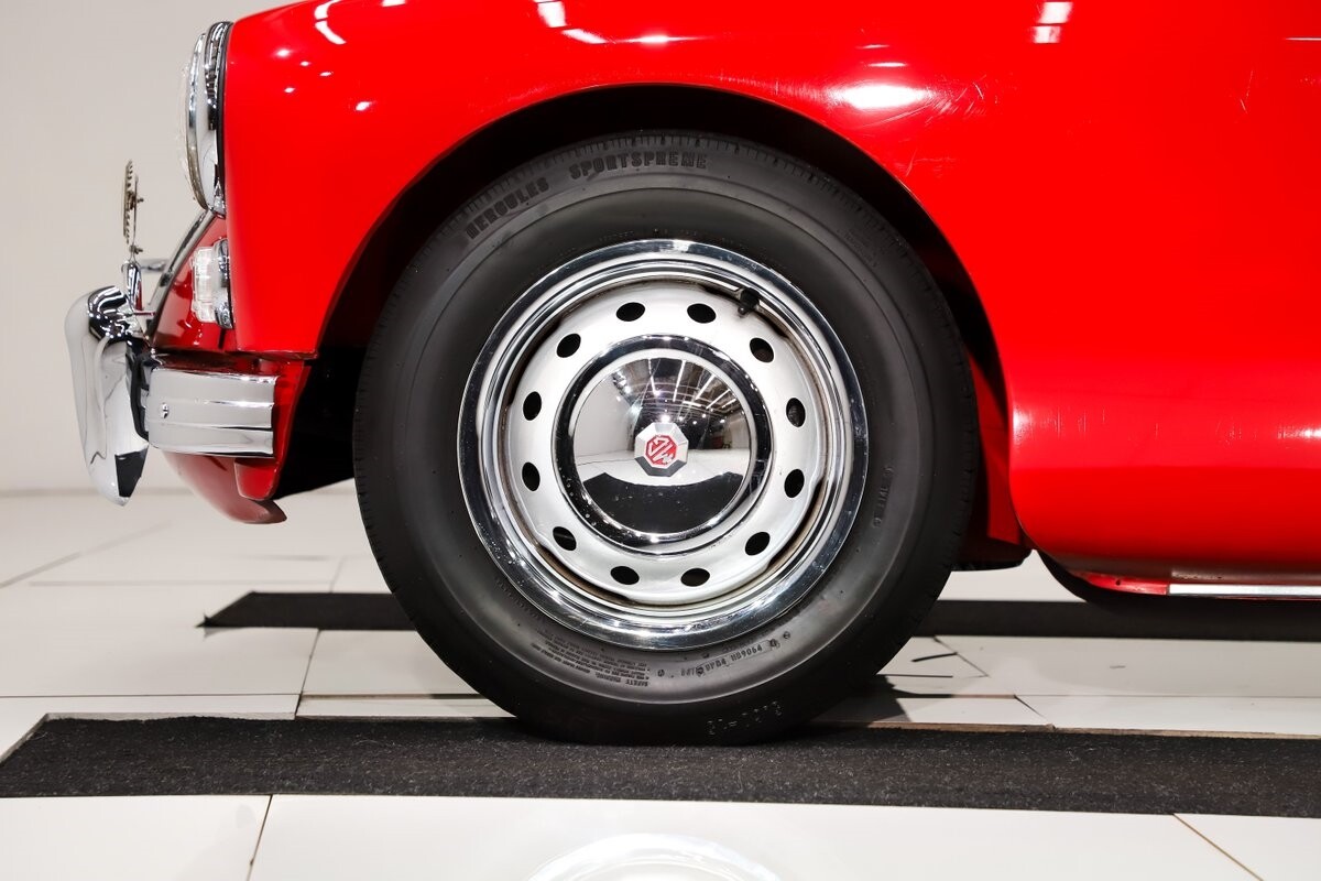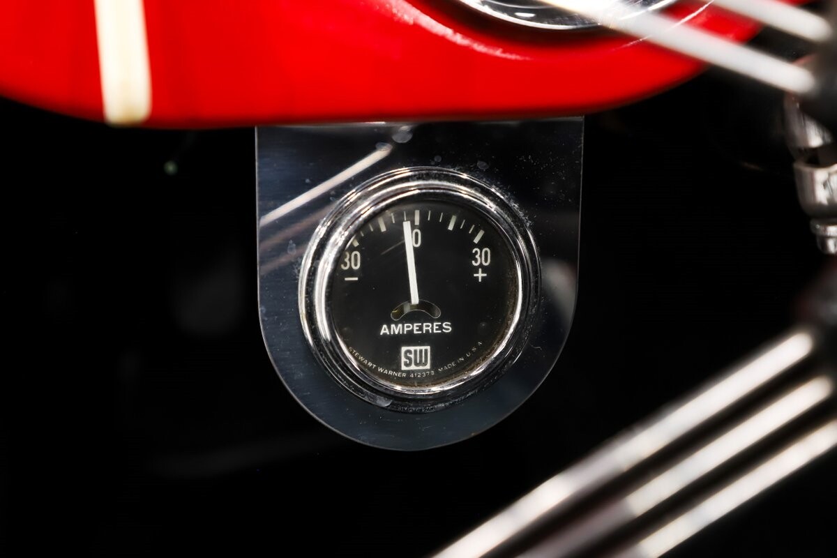 INTERIOR: The cabin is simplistic yet intriguing. The dash reminds you of an airplane cockpit. The gauges are stylish, matching, and complete with tachometer. It's even equipped with the factory AM radio and hidden under the dash is an 8-track player and speakers. Comfortable black with red piping bucket seats make driving this pleasurable. Other options include adjustable choke and throttle, and map lighting for your passenger to guide you on your road trip. Our favorite feature must be the original style 4 speed shifter coming up from the floor and completed with an authentic MG wood shift knob.