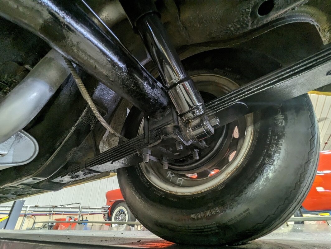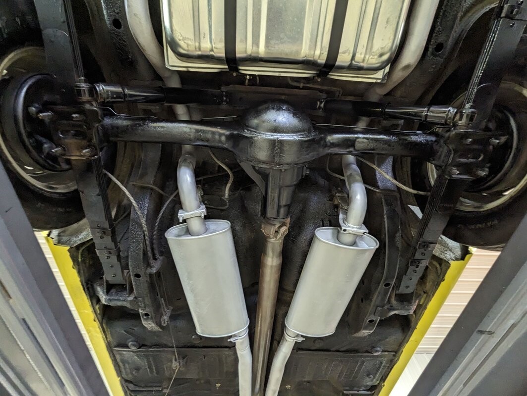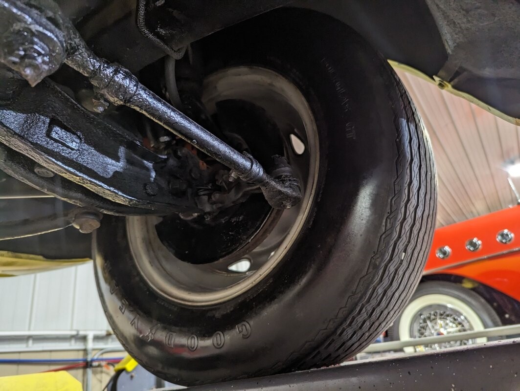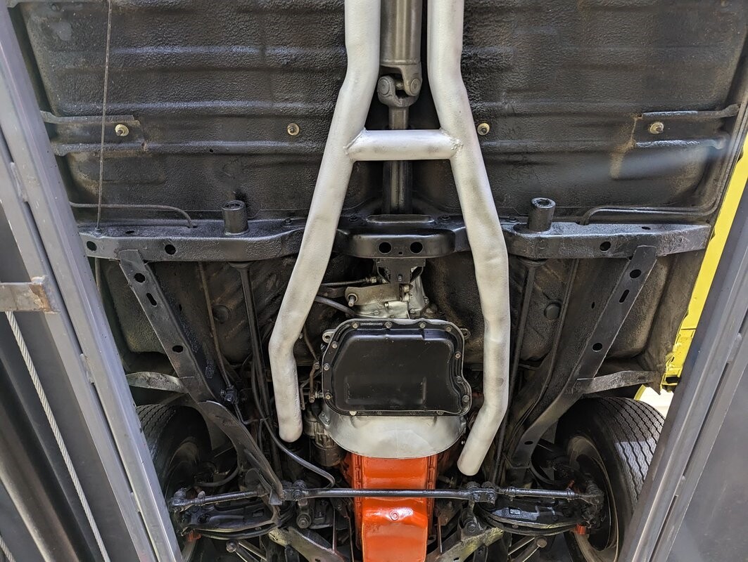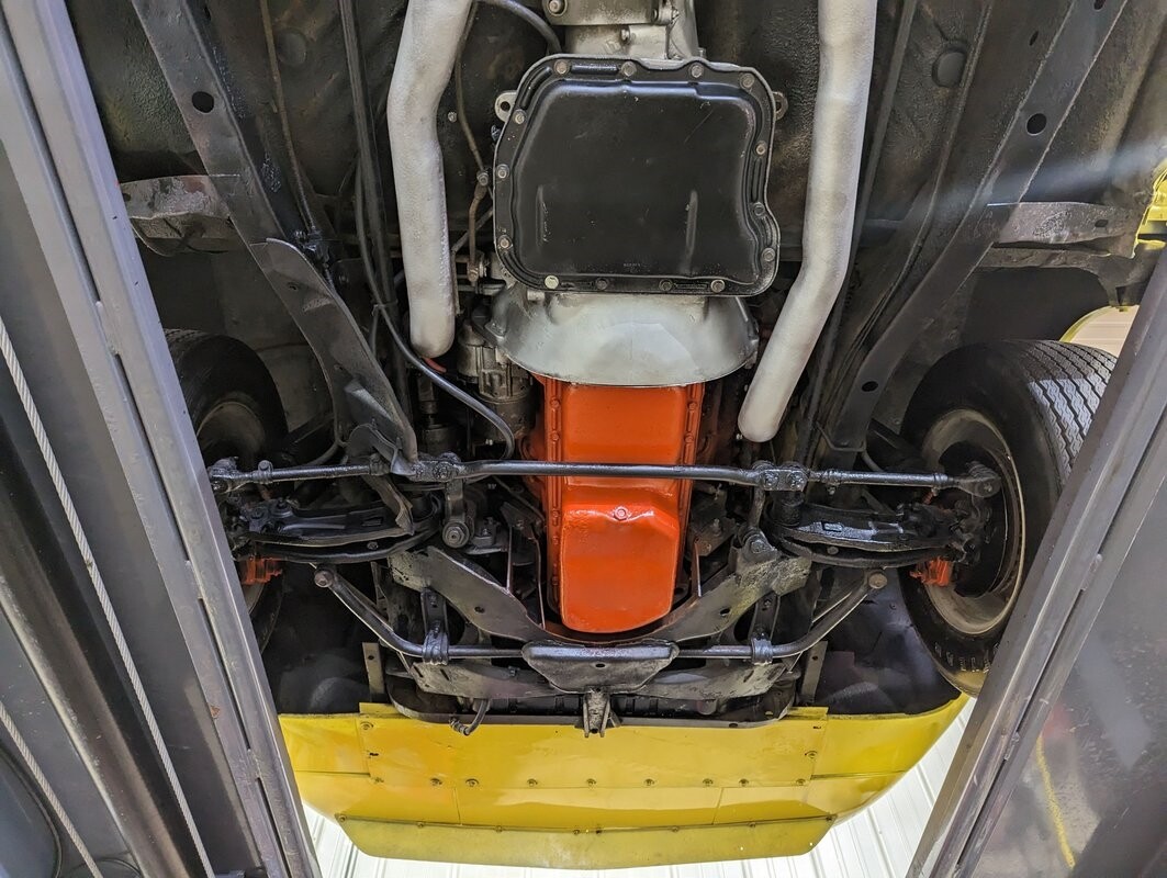 UNDERSIDE: Under this bird is rock solid original metal. The floors, frame rails, inner rockers all look uncut. Mechanics have been maintained as needed. We replaced the fuel tank and serviced the trans. Someone else replaced the shocks recently. The exhaust looks solid with correct tips. Brakes are functioning properly, and it has disc in front, e-brake is hooked up. Looking up at the motor we verified the correct casting code, date, and matching VIN. The 727 Torqueflite automatic is clean and was serviced. In back is the original rear end with 3.55 Sure Grip gears.