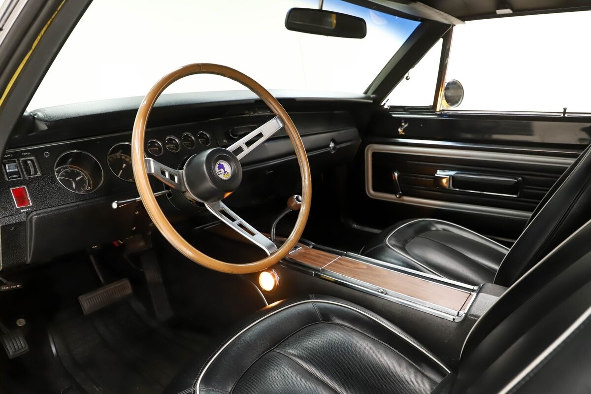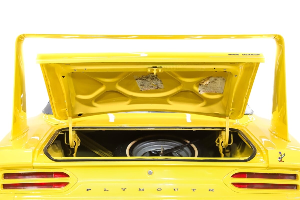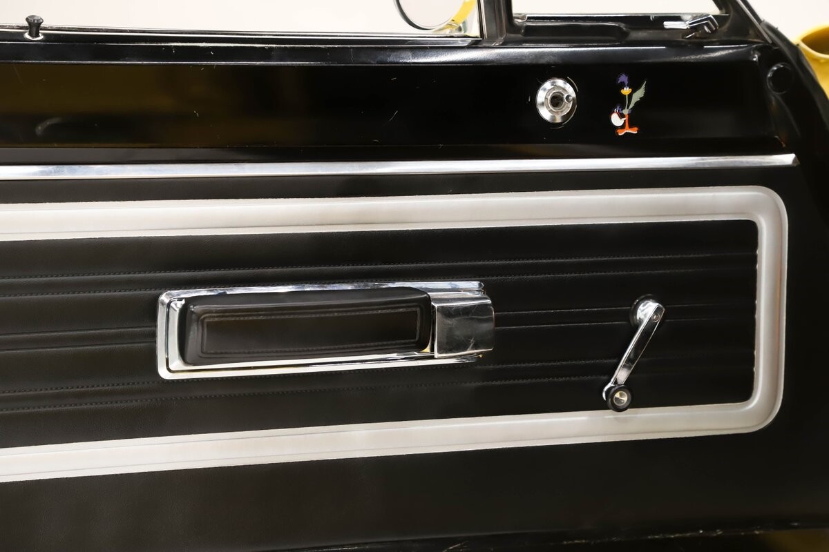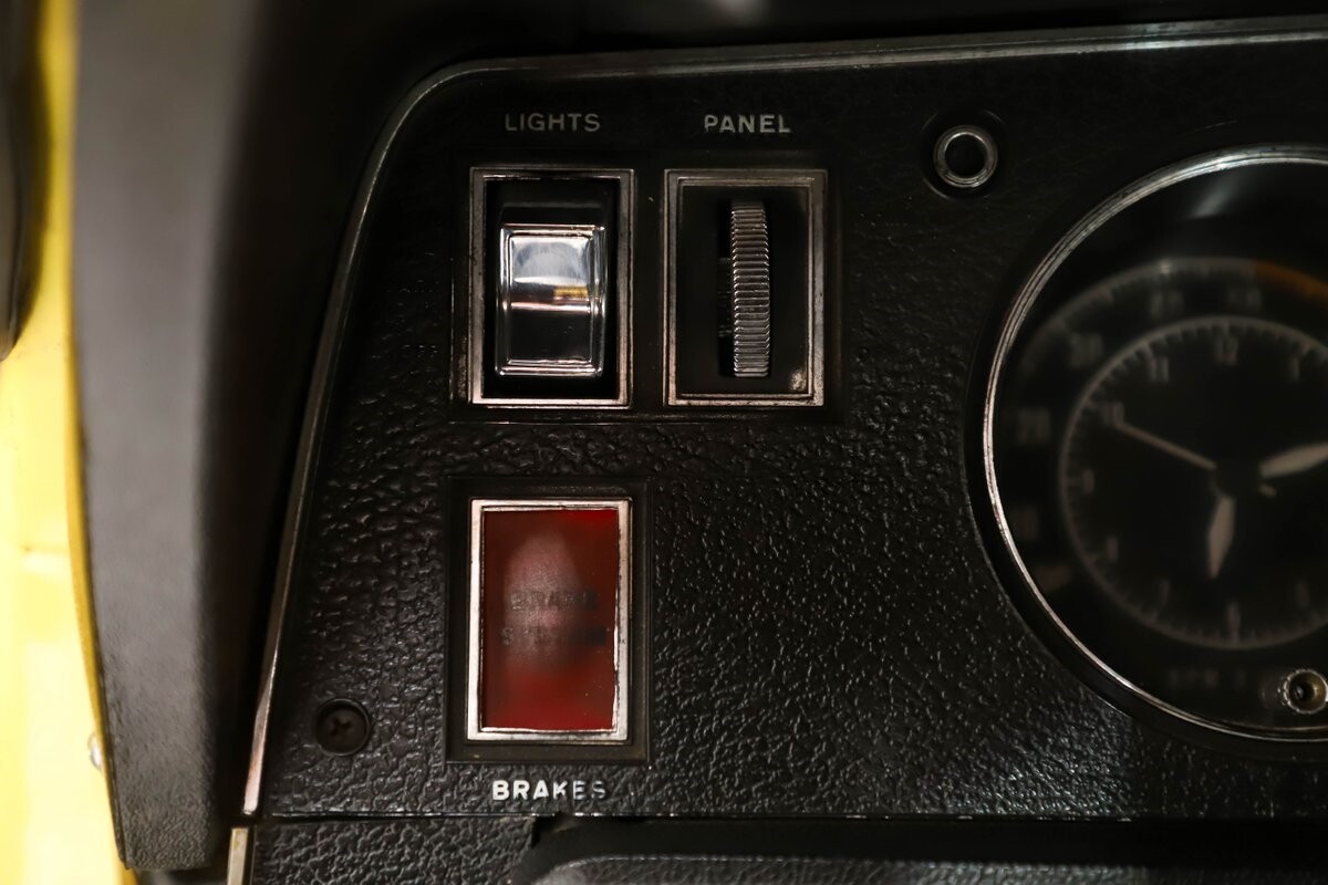 EXTERIOR: This car still has its original metal! The aerodynamic package included the nose cone with flip up headlights and a chin spoiler, racing pins to hold the hood shut, scoops on top of the front fenders, windshield pilar covers, a flush mount rear window and of course the tallest wing put on a production car. Repainted its original Lemon Twist Yellow. Overall, the paint shows very well with a glossy finish. New bold reproduction decals too. The original vinyl top was recently replaced for the first time. The headlights open and close properly. 15 inch Rallye wheels look great and are wearing Goodyear Polyglass reproduction tires.
