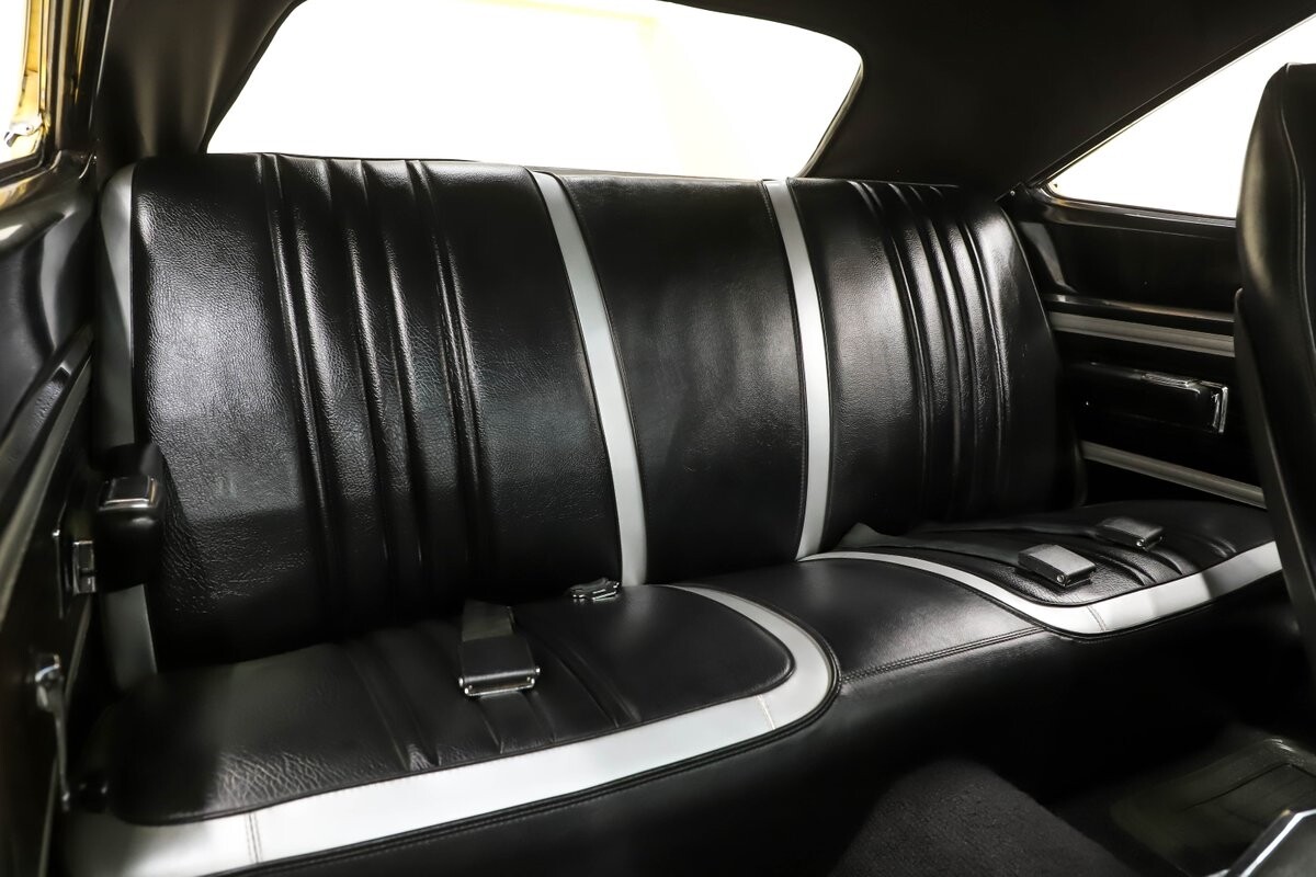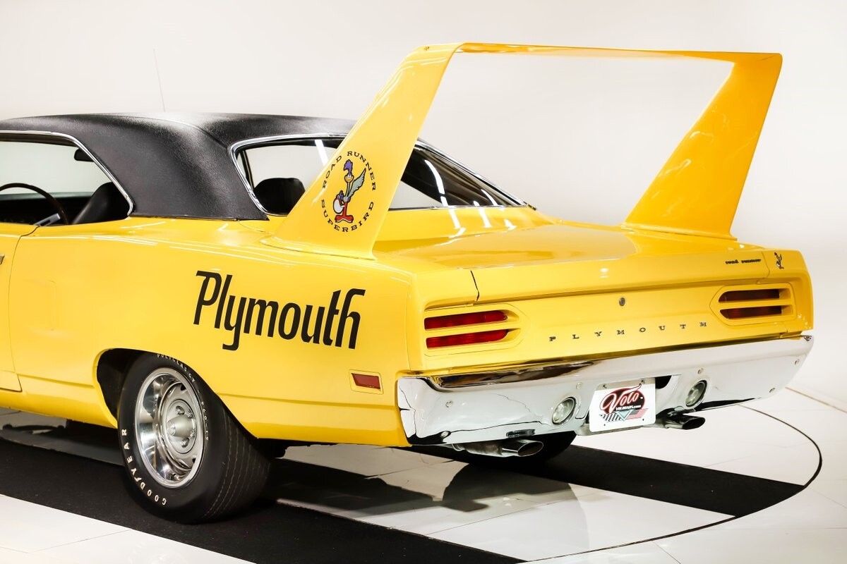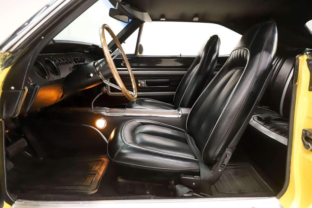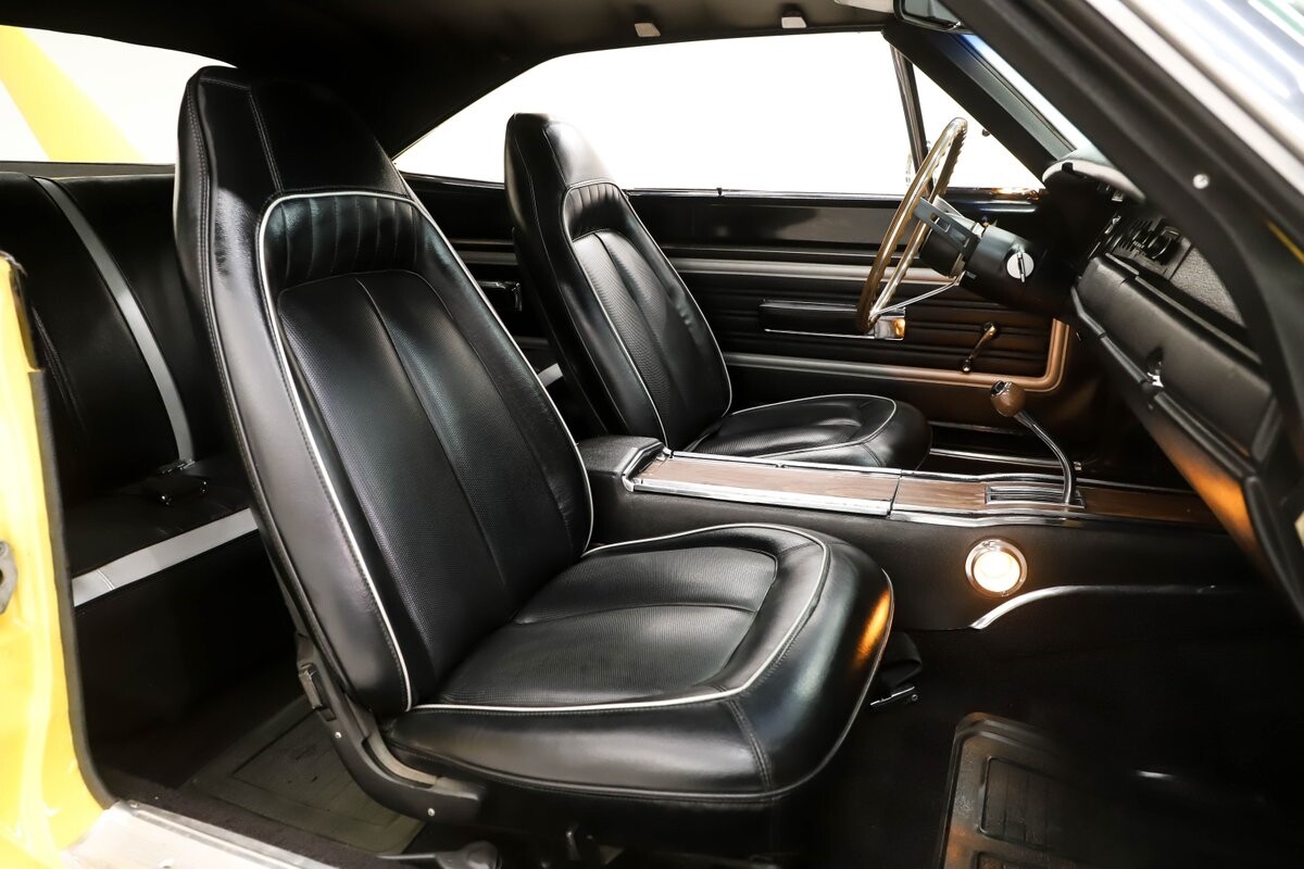 EXTERIOR: This car still has its original metal! The aerodynamic package included the nose cone with flip up headlights and a chin spoiler, racing pins to hold the hood shut, scoops on top of the front fenders, windshield pilar covers, a flush mount rear window and of course the tallest wing put on a production car. Repainted its original Lemon Twist Yellow. Overall, the paint shows very well with a glossy finish. New bold reproduction decals too. The original vinyl top was recently replaced for the first time. The headlights open and close properly. 15 inch Rallye wheels look great and are wearing Goodyear Polyglass reproduction tires.