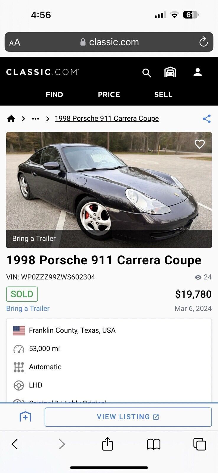 Manufactured in June'98 this Porsche 911 Carrera 996 was imported to the United States in 2023 from Japan with only 53,000 miles and it now has 54200 miles and is my daily driver. The miles will increase slightly. This 996 first generation water cooled 911 Carrera features iron coated pistons and dual-row IMSB. Buy with confidence. Deposit is refundable if the vehicle is inspected within 24 hours of auction. It has new set of tires and upgraded two-parts bolted R18 rims painted in black. The original rims with used set of none-matching tires will be included in the sale (that's how it arrived from Japan)Seller's Notes