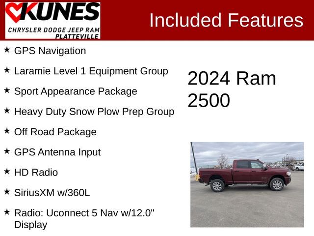 2024 Ram 2500 Laramie Laramie 4WD Dealer Discount of $8,175 off MSRP Delmonico Red Pearlcoat 12 Touchscreen Display, 20 x 8.0 Polished Aluminum Wheels, 220 Amp Alternator, 2nd Row In Floor Storage Bins, 4G LTE Wi-Fi Hot Spot, Alexa Built-In, Apple CarPlay, Auto Adjust In Reverse Exterior Mirrors, Auto Dim Exterior Mirror, Auto High Beam Headlamp Control, Auto Power-Folding Mirrors, Auto-Dimming Exterior Passenger Mirror, Black Interior Accents, Blind Spot & Cross Path Detection, Body Color Grille Surround, Center Hub, Chrome Exterior Mirrors, Connected Travel & Traffic Services, Connectivity - US/Canada, Disassociated Touchscreen Display, Exterior Mirrors Courtesy Lamps, Exterior Mirrors w/Heating Element, Exterior Mirrors w/Memory, Exterior Mirrors w/Supplemental Signals, Foam Bottle Insert (Door Trim Panel), For Details, Visit , For More Info, Call844-372-6782, Forward & Reverse Utility Lights, Front LED Fog Lamps, Front Performance Tuned Shock Absorbers, Global Telematics Box Module (TBM), Google Android Auto, GPS Antenna Input, GPS Navigation, HD Radio, Heavy Duty Snow Plow Prep Group, Hill Descent Control, Integrated Voice Command w/Bluetooth, Laramie Level 1 Equipment Group, LED Reflector Headlamps, LED Tail Lamps, Mirror Running Lights, Off Road Package, Off-Road Information Pages, ParkSense Front/Rear Park Assist System, Power Adjust Mirrors, Power Adjustable Convex Aux Mirrors, Power Adjustable Pedals w/Memory, Power Heated Fold Telescopic Mirrors w/Memory, Power Telescoping Mirrors, Radio: Uconnect 5 Nav w/12.0 Display, Rain Sensitive Windshield Wipers, Rear Performance Tuned Shock Absorbers, Rear Power Sliding Window, Rear Window Defroster, Remote Tailgate Release, Selectable Tire Fill Alert, SiriusXM Radio Service, SiriusXM w/360L, Sport Appearance Package, Sport Decal, Sport Performance Hood, Tow Hooks, Trailer Tow Pages, Wheels: 18 x 8.0 Polished Aluminum. 8-Speed Automatic 6.4L V8