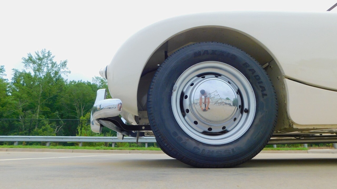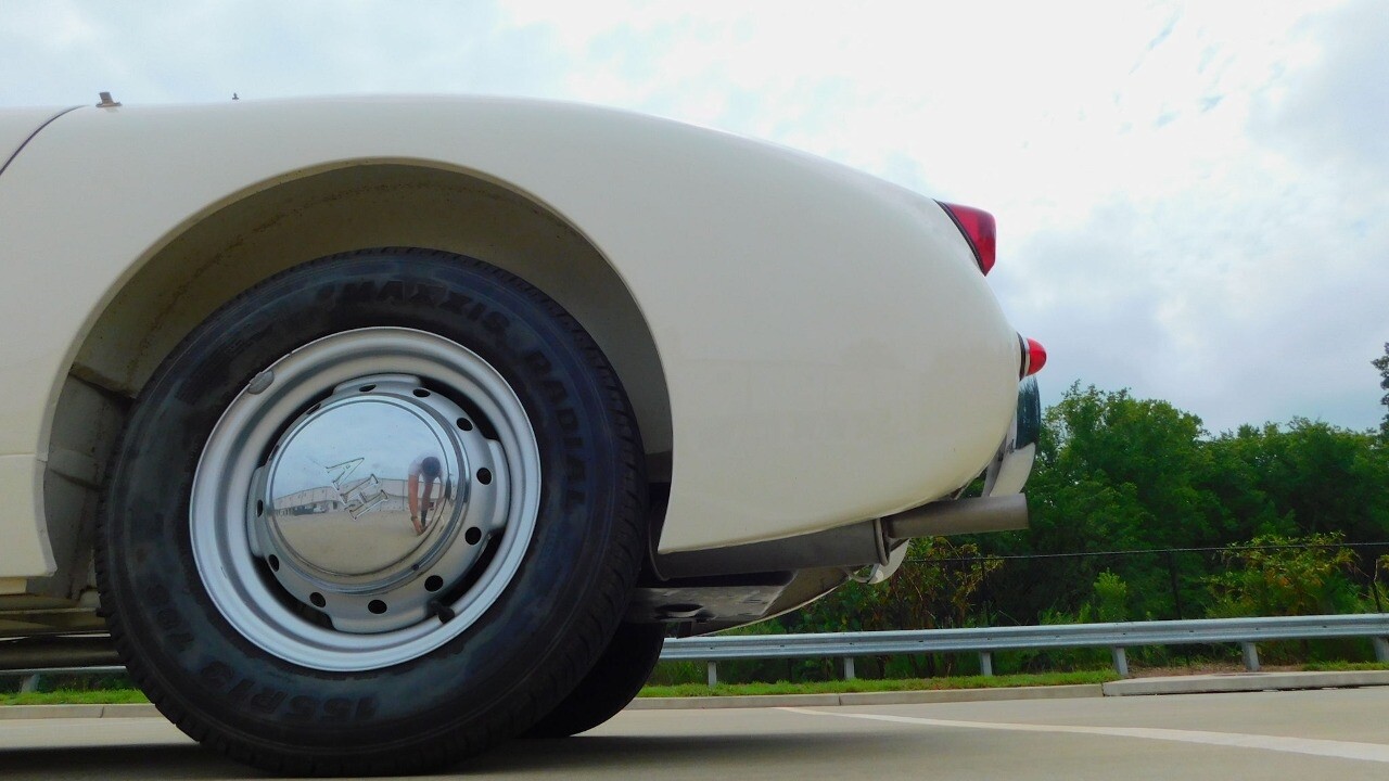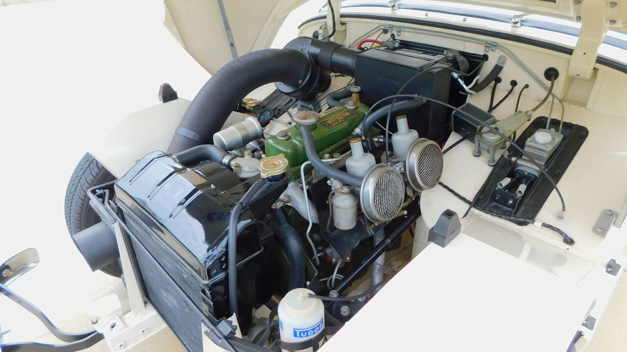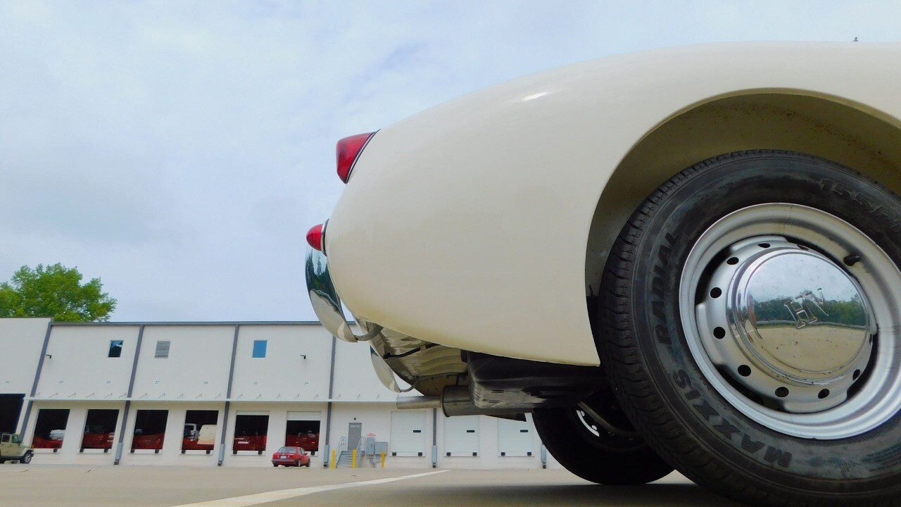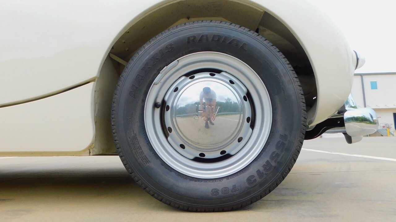 The exterior looks beautiful with its glossy white paint, chrome bumpers and a like new convertible top. It is equipped with 13inch wheels and 155 R13 tires.
