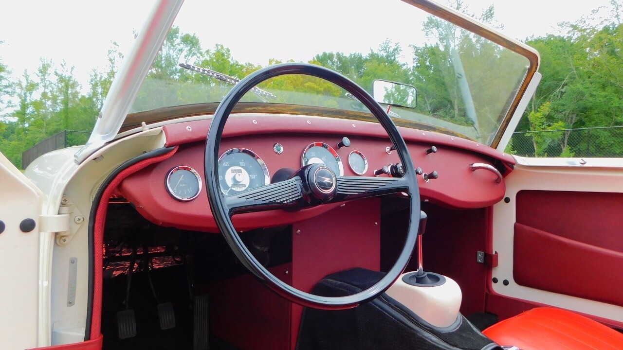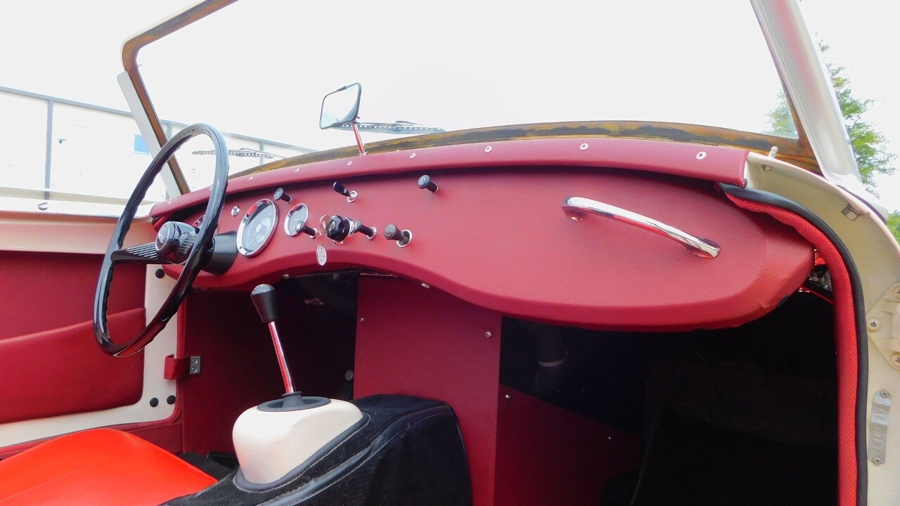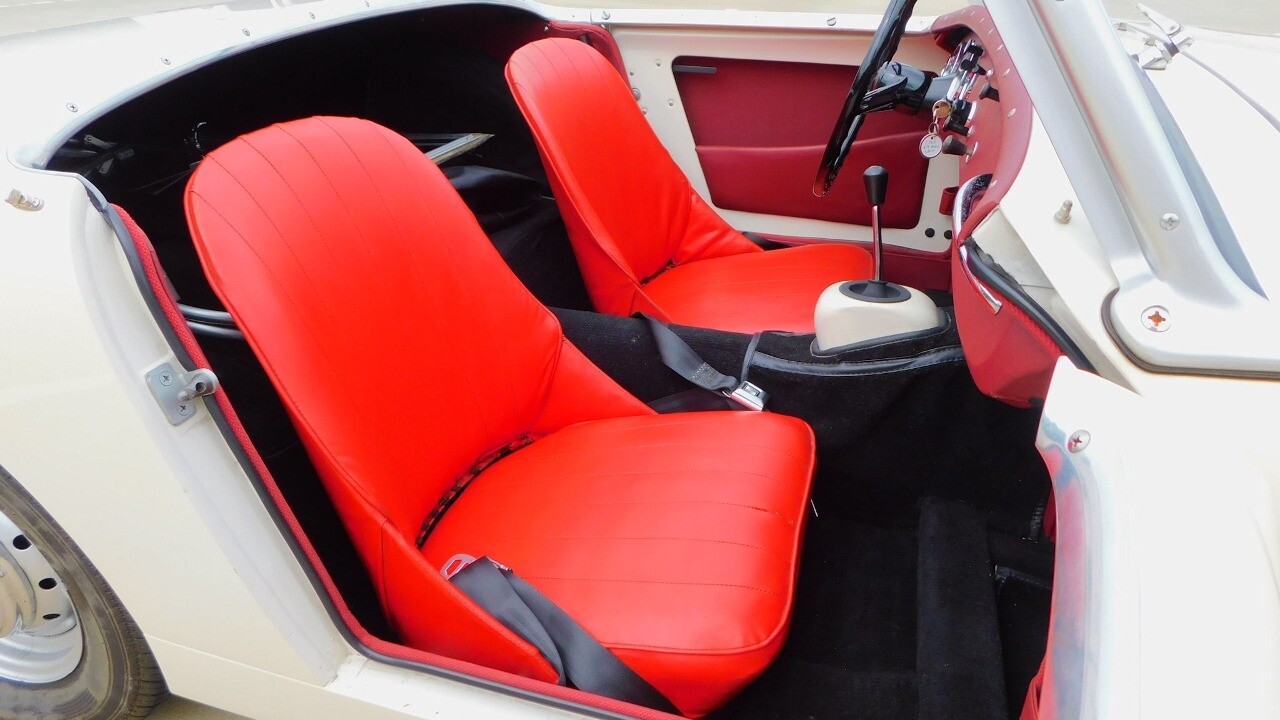 The interior looks as good as the exterior with the red seats, red dash and the timeless Smith gauges. The car comes with seat belts for the driver and passenger side for safety.