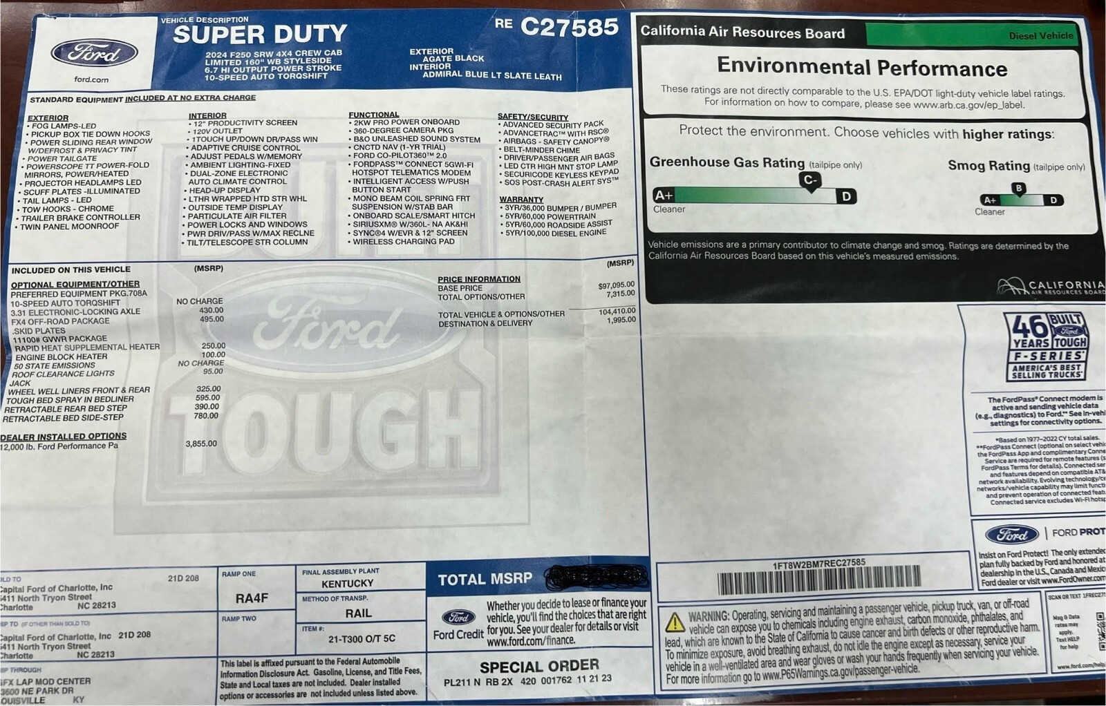 2024 F250 Ford Super Duty Limited. Loaded with every option avaiable. 3" BDS suspension lift with 2.5" Fox Coil-Over conversion. Toyo 37x12.5x20 Open Country RT Tires. Retrax auto open/close bed cover. Factory installed amber warning strobe lights. Professional ceramic coating. Warn factory installed winch.