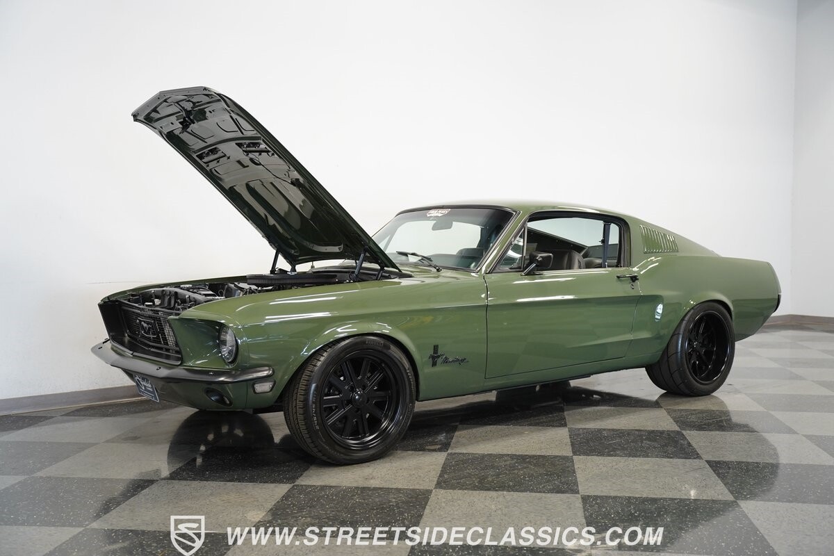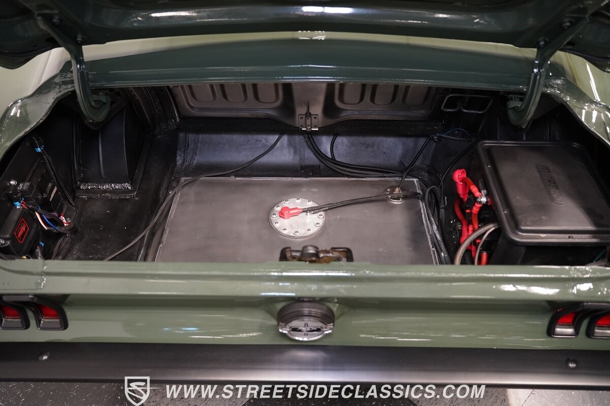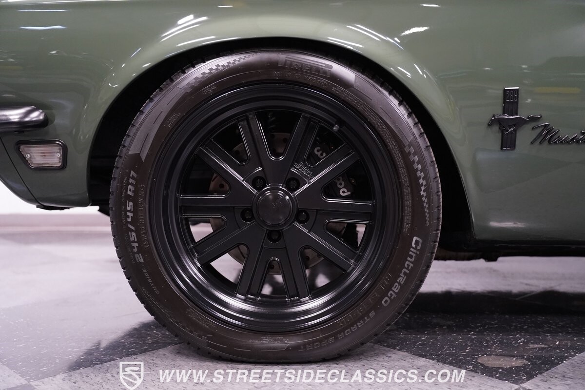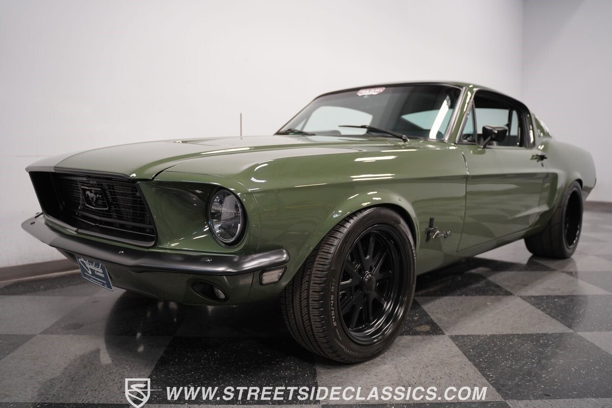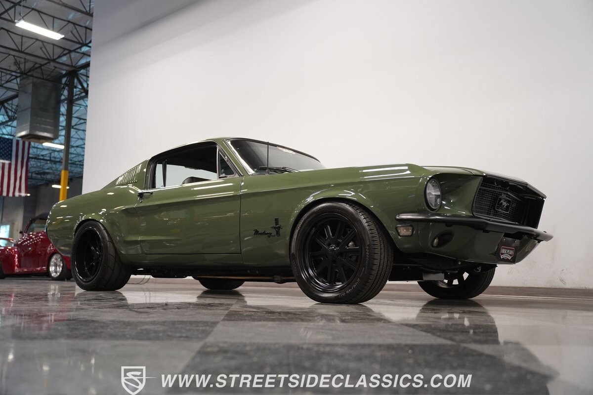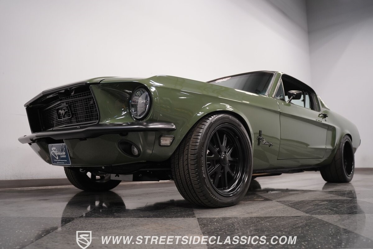 Wrapped in a coat of Army Green that whispers of covert operations and stealth maneuvers, this 1968 Ford Mustang Fastback Restomod is no ordinary beast on the road. Its transformation into a restomod masterpiece is marked by a comprehensive repaint, enhancing its aggressive stance. Staggered American Racing wheels, 17" at the front and 18" at the rear, clad in 245/45R17 and 305/35/ZR18 tires, respectively, hint at the power and poise contained within. Blacked-out chrome trim and a bespoke Mustang logo gas cap add to its mystique, while custom fog lights lurking beneath the bumper ready this Mustang for any mission, day or night.