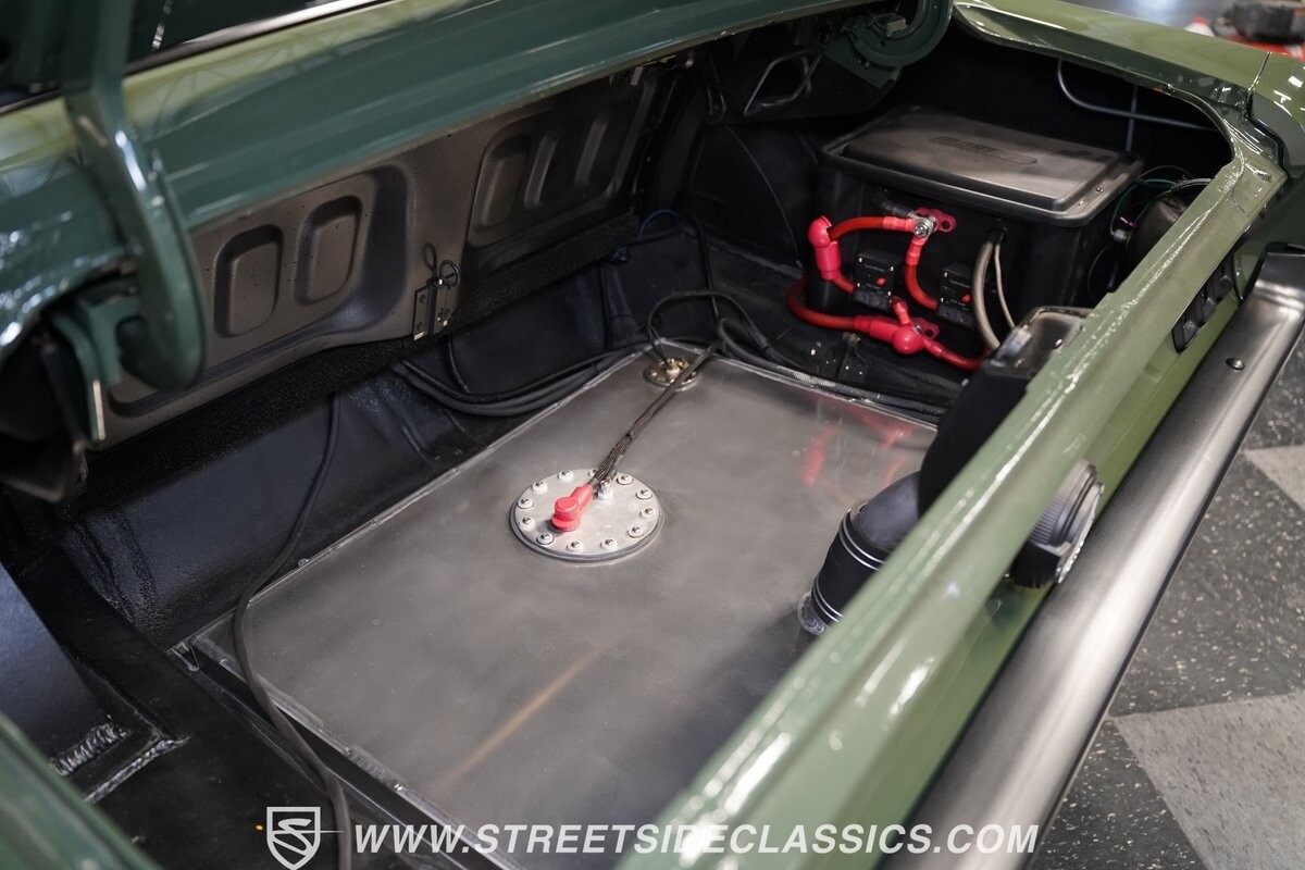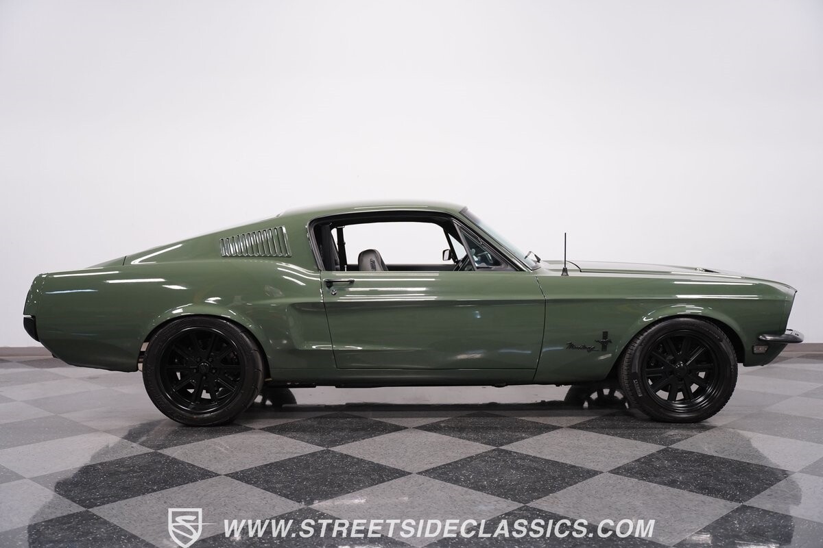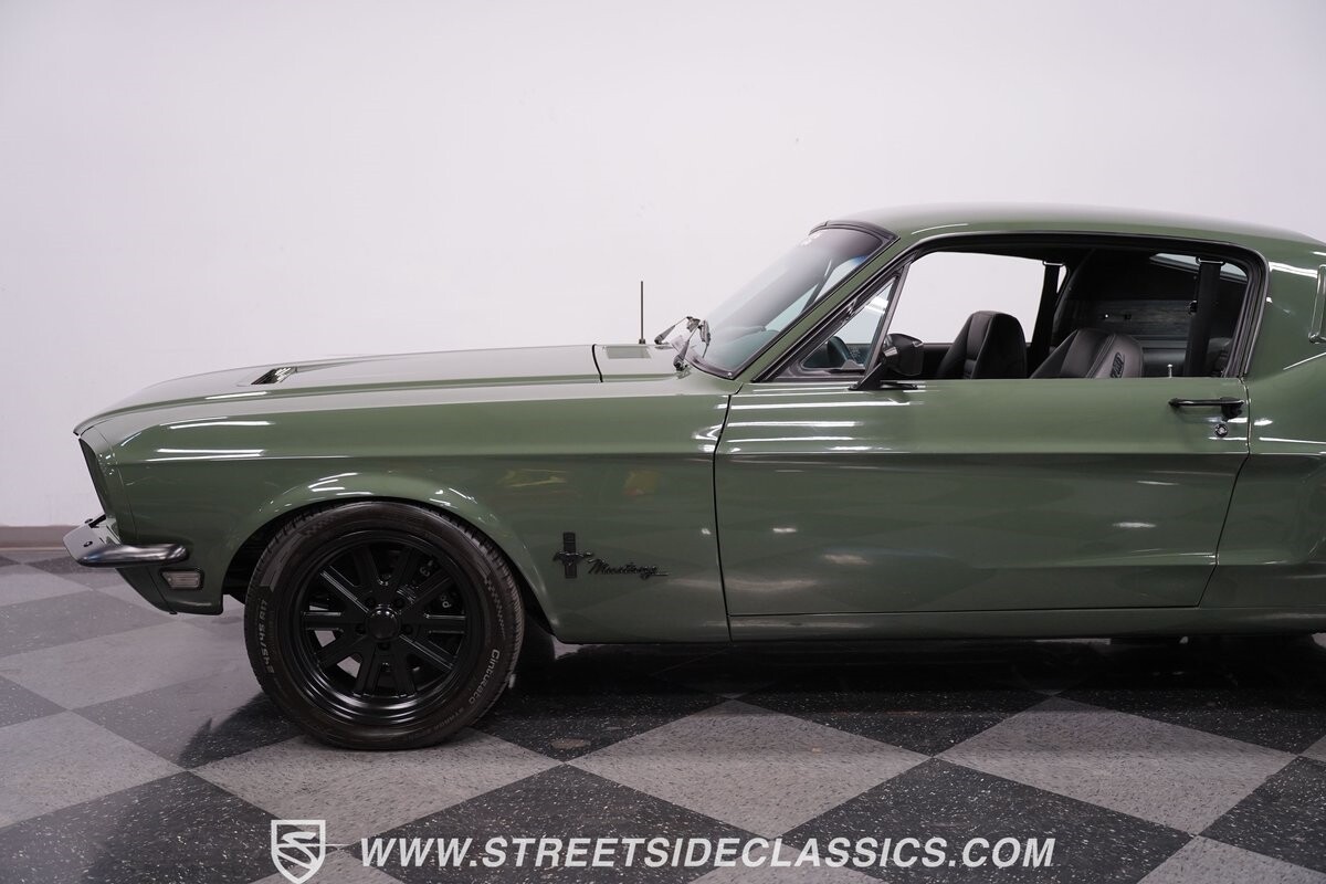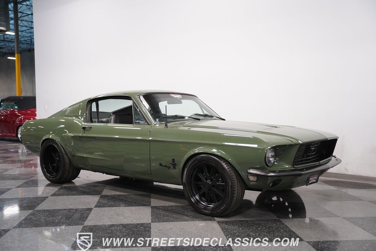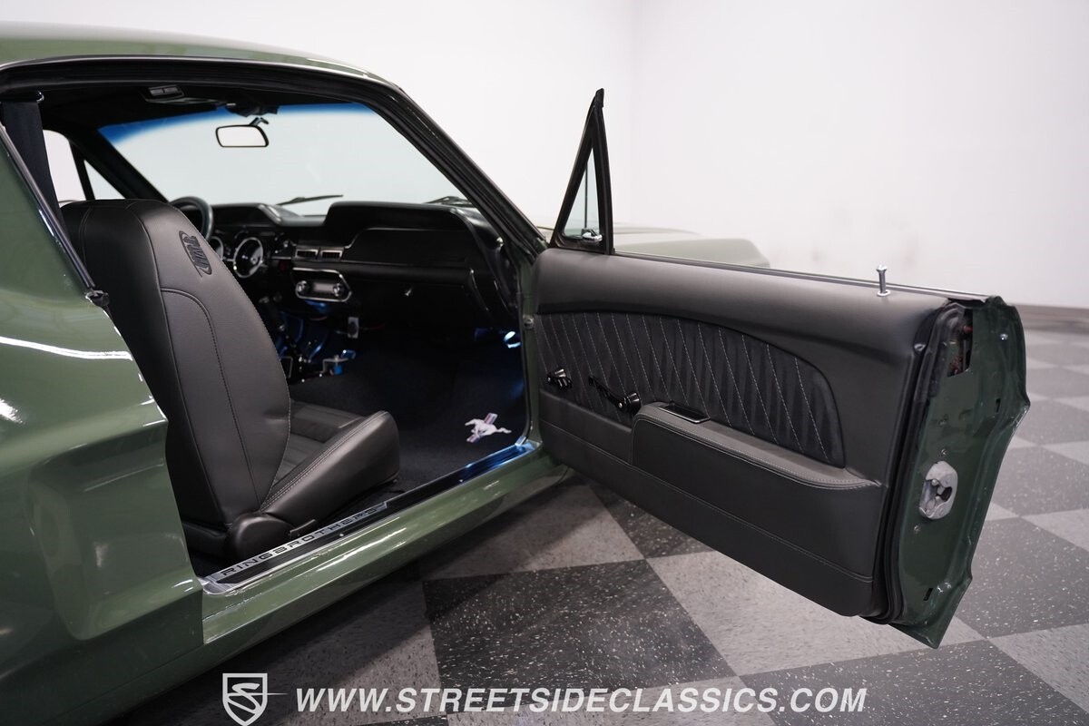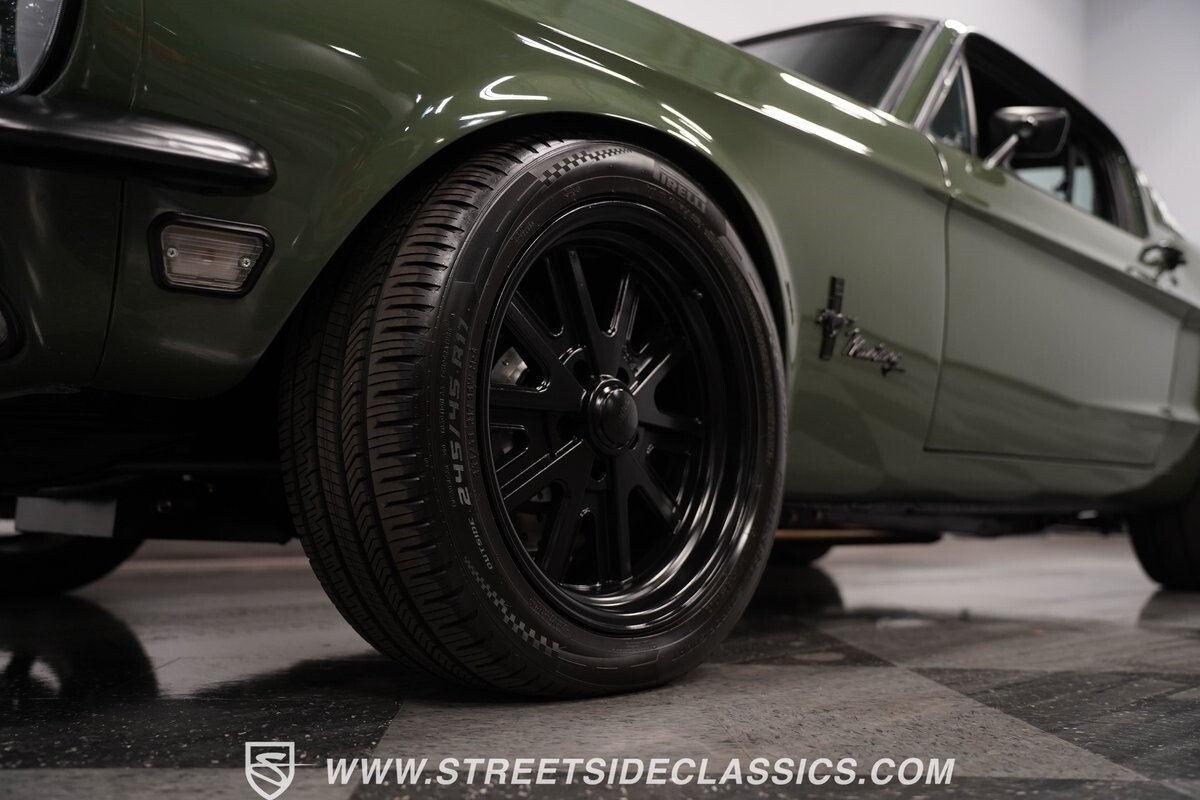 Wrapped in a coat of Army Green that whispers of covert operations and stealth maneuvers, this 1968 Ford Mustang Fastback Restomod is no ordinary beast on the road. Its transformation into a restomod masterpiece is marked by a comprehensive repaint, enhancing its aggressive stance. Staggered American Racing wheels, 17" at the front and 18" at the rear, clad in 245/45R17 and 305/35/ZR18 tires, respectively, hint at the power and poise contained within. Blacked-out chrome trim and a bespoke Mustang logo gas cap add to its mystique, while custom fog lights lurking beneath the bumper ready this Mustang for any mission, day or night.