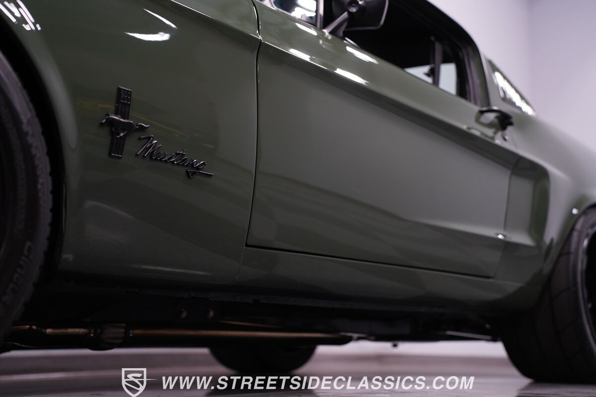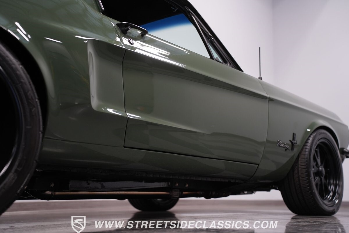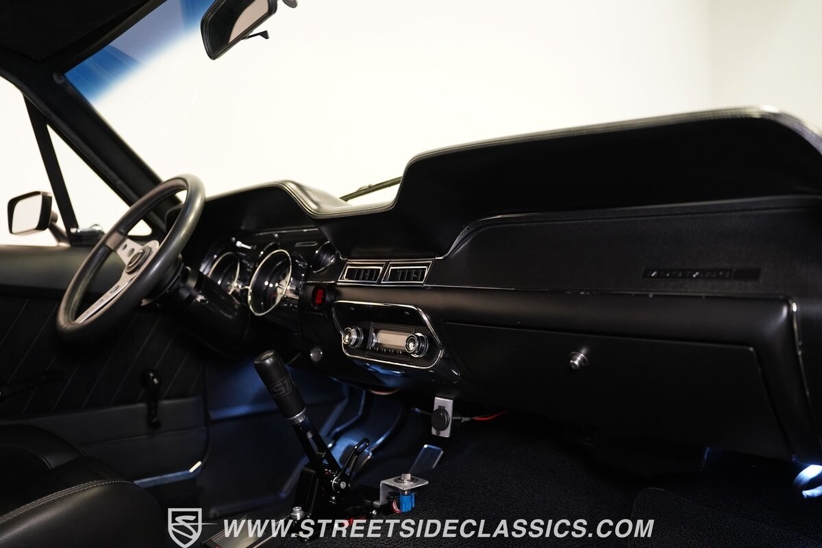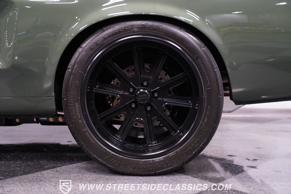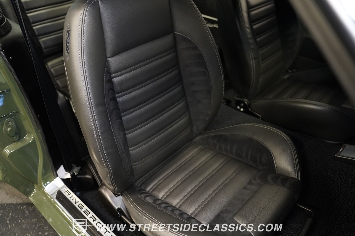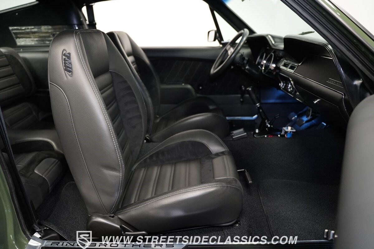 Wrapped in a coat of Army Green that whispers of covert operations and stealth maneuvers, this 1968 Ford Mustang Fastback Restomod is no ordinary beast on the road. Its transformation into a restomod masterpiece is marked by a comprehensive repaint, enhancing its aggressive stance. Staggered American Racing wheels, 17" at the front and 18" at the rear, clad in 245/45R17 and 305/35/ZR18 tires, respectively, hint at the power and poise contained within. Blacked-out chrome trim and a bespoke Mustang logo gas cap add to its mystique, while custom fog lights lurking beneath the bumper ready this Mustang for any mission, day or night.