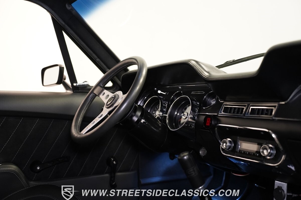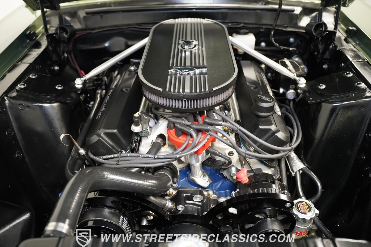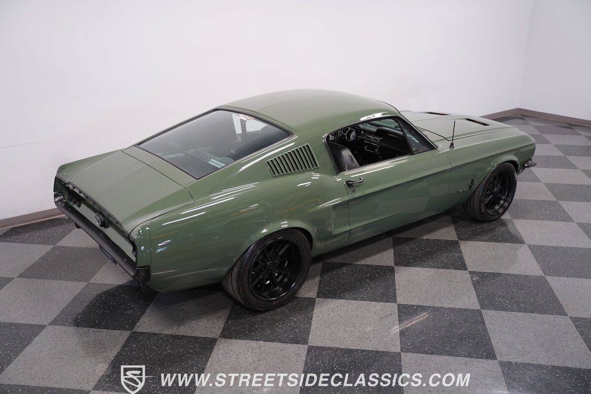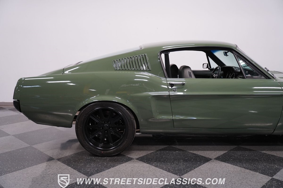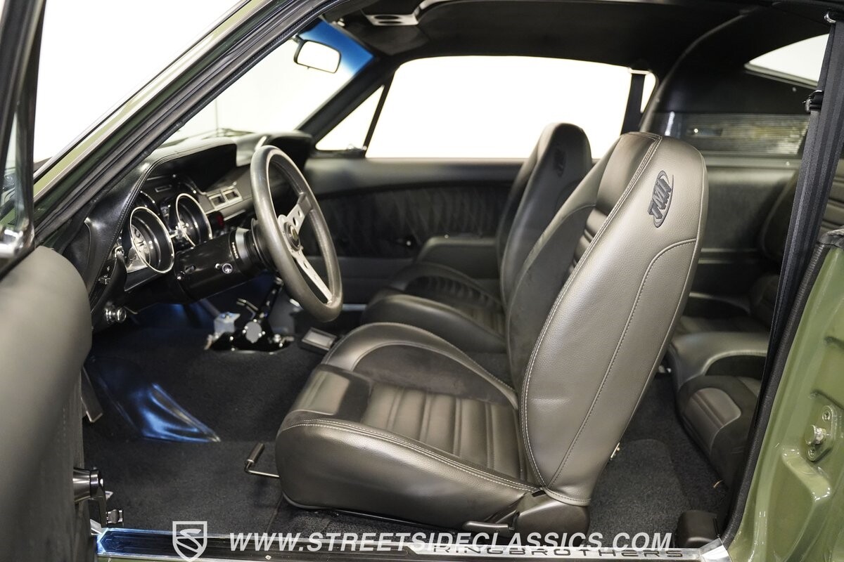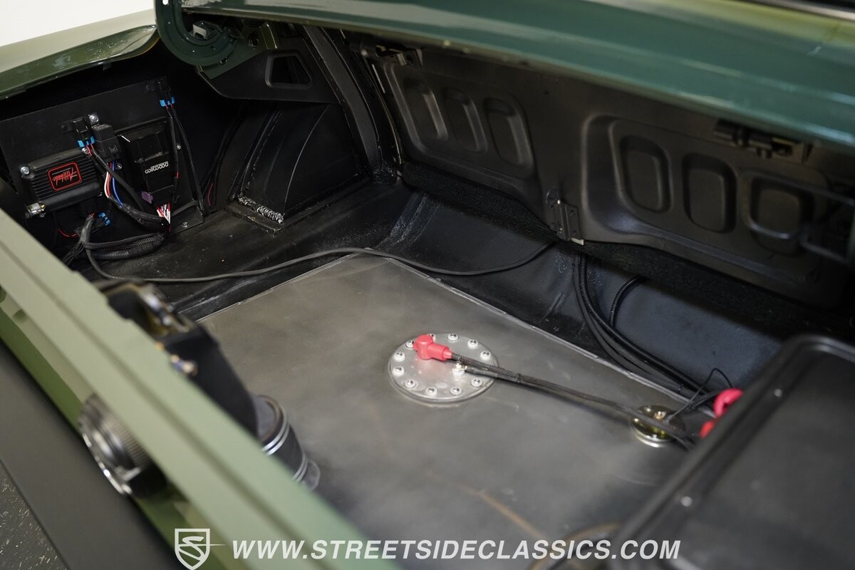 Wrapped in a coat of Army Green that whispers of covert operations and stealth maneuvers, this 1968 Ford Mustang Fastback Restomod is no ordinary beast on the road. Its transformation into a restomod masterpiece is marked by a comprehensive repaint, enhancing its aggressive stance. Staggered American Racing wheels, 17" at the front and 18" at the rear, clad in 245/45R17 and 305/35/ZR18 tires, respectively, hint at the power and poise contained within. Blacked-out chrome trim and a bespoke Mustang logo gas cap add to its mystique, while custom fog lights lurking beneath the bumper ready this Mustang for any mission, day or night.