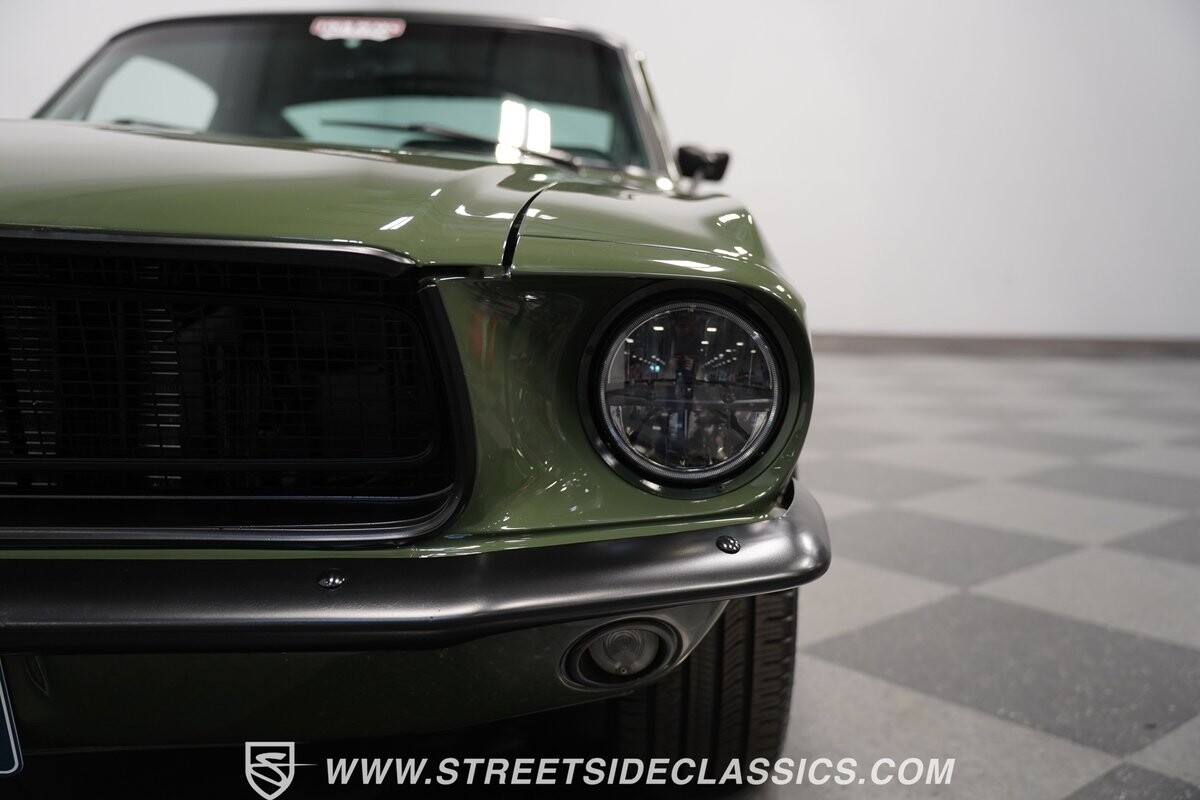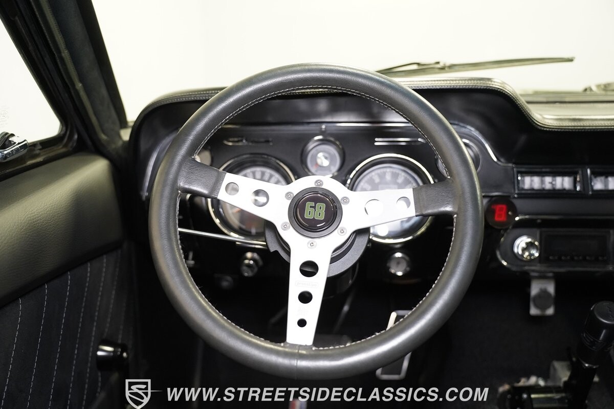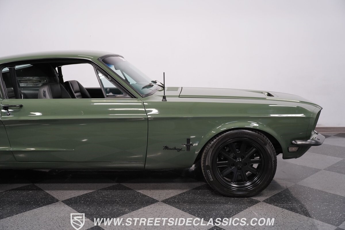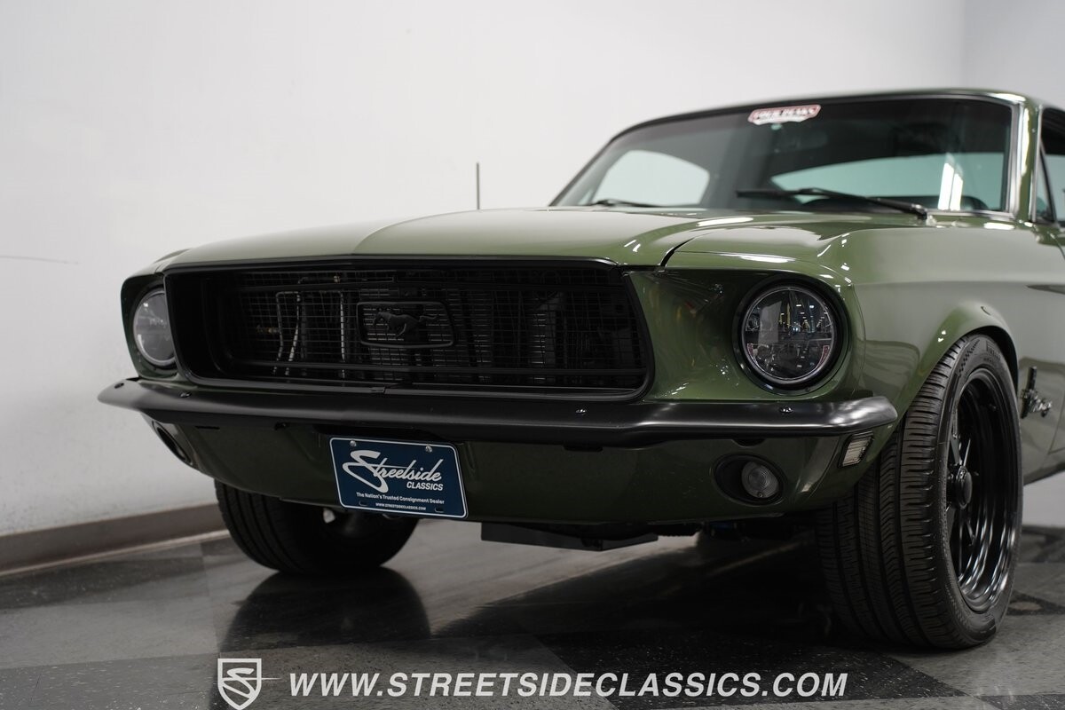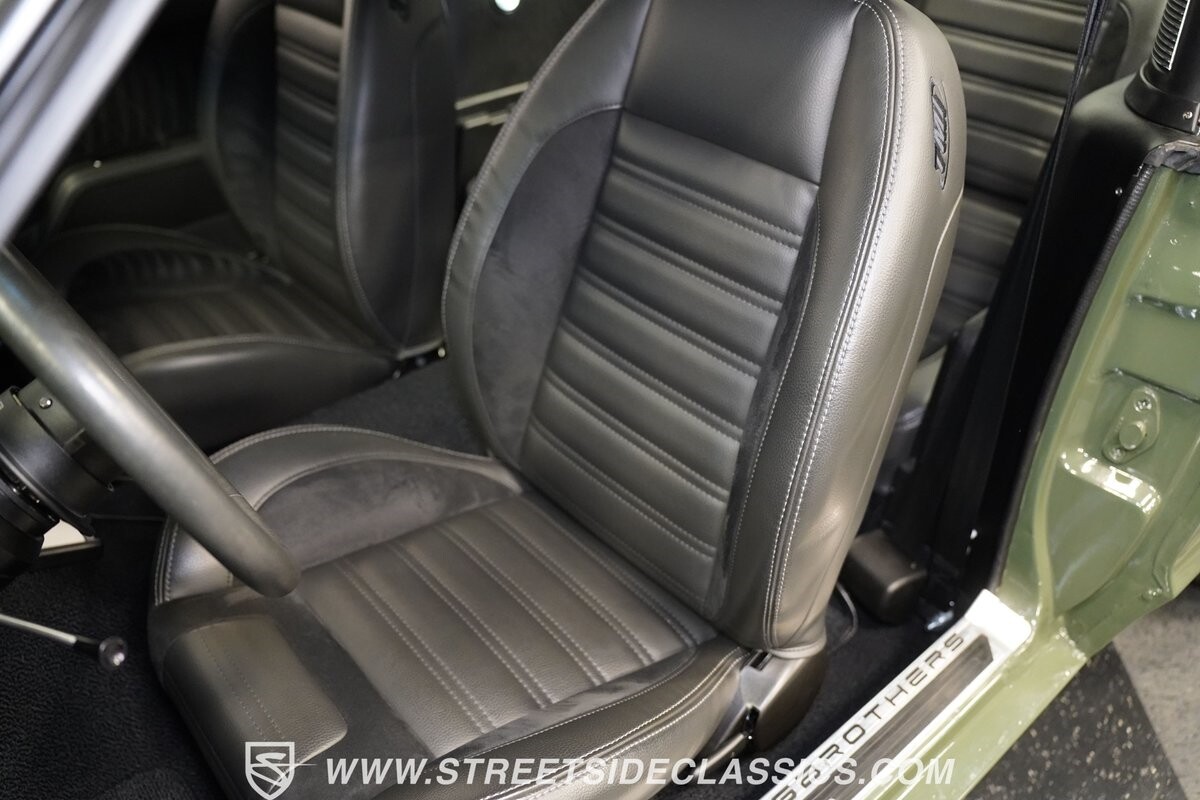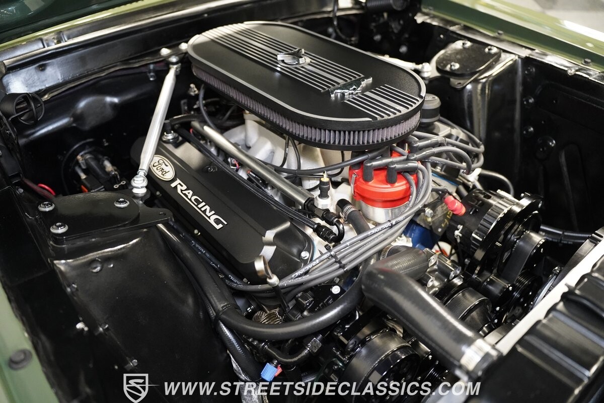 Wrapped in a coat of Army Green that whispers of covert operations and stealth maneuvers, this 1968 Ford Mustang Fastback Restomod is no ordinary beast on the road. Its transformation into a restomod masterpiece is marked by a comprehensive repaint, enhancing its aggressive stance. Staggered American Racing wheels, 17" at the front and 18" at the rear, clad in 245/45R17 and 305/35/ZR18 tires, respectively, hint at the power and poise contained within. Blacked-out chrome trim and a bespoke Mustang logo gas cap add to its mystique, while custom fog lights lurking beneath the bumper ready this Mustang for any mission, day or night.
