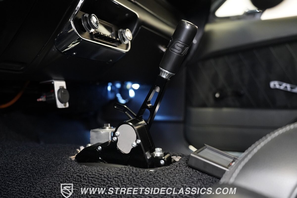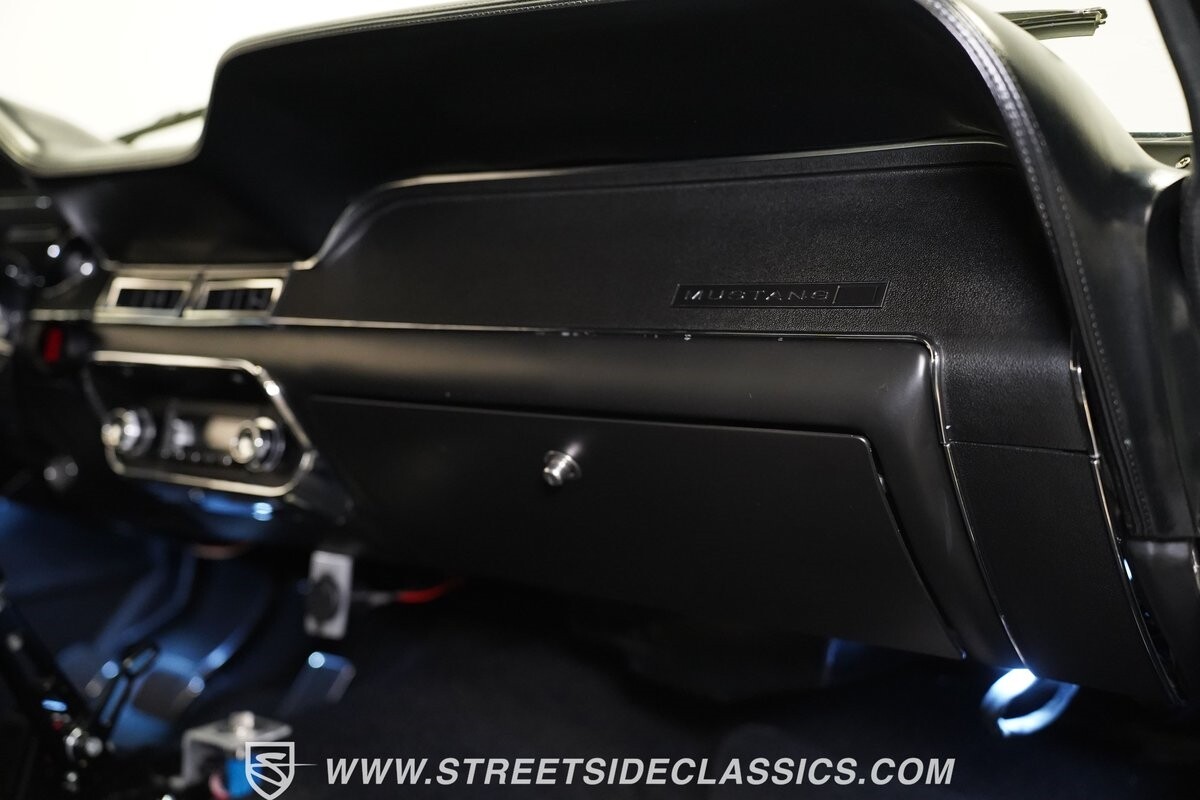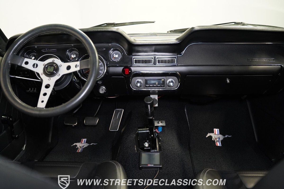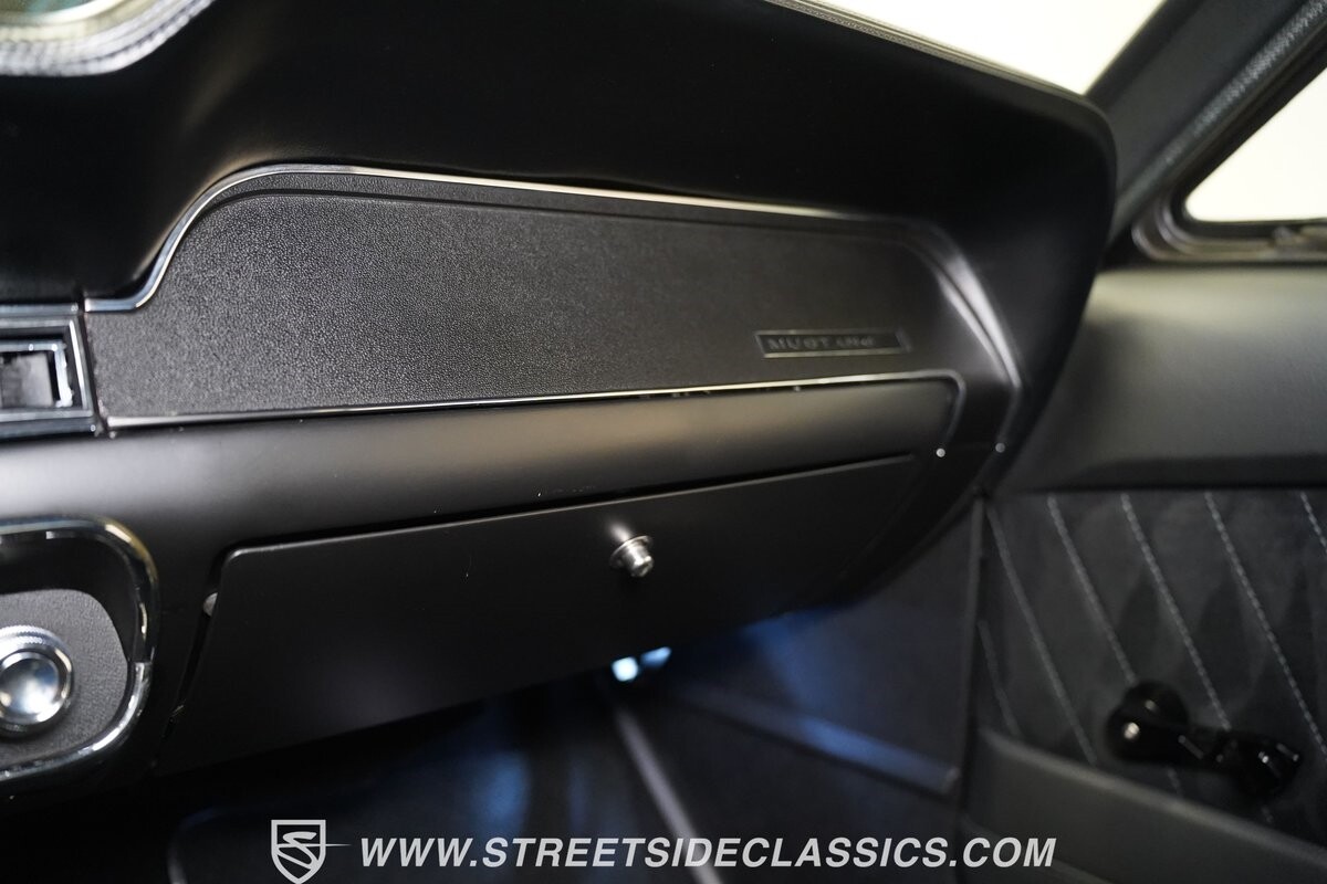 Inside, this Mustang offers a black interior elevated by TMI seats and door panels, seamlessly integrated with Dakota Digital gauges. The microsuede headliner and custom overhead console with map lights inject a touch of modern luxury into the vintage thrill. A Willwood electronic parking brake and an S1 Sequential shifter are poised for action, complemented by a retro-style AM/FM/AUX stereo that sets the soundtrack for your adventures, all underscored by the dash's impeccable condition.