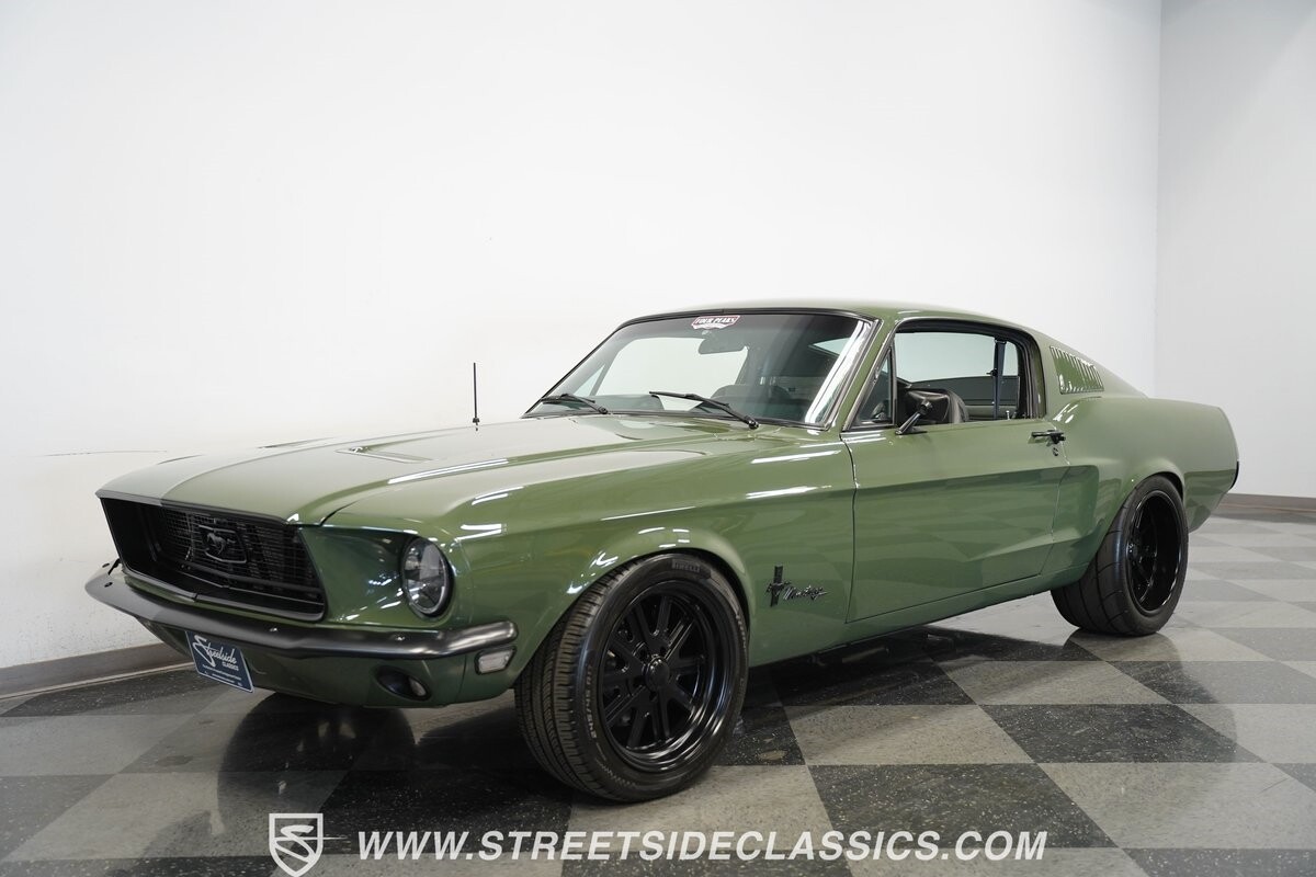 This 1968 Ford Mustang Fastback Restomod with a powerful crate engine, sleek black interior, and eye-catching Army Green exterior. Enhanced with over $115k in parts and labor from Four Peaks Motorsports and including two extra front wheels, it combines power, precision, and modern flair. Call today!