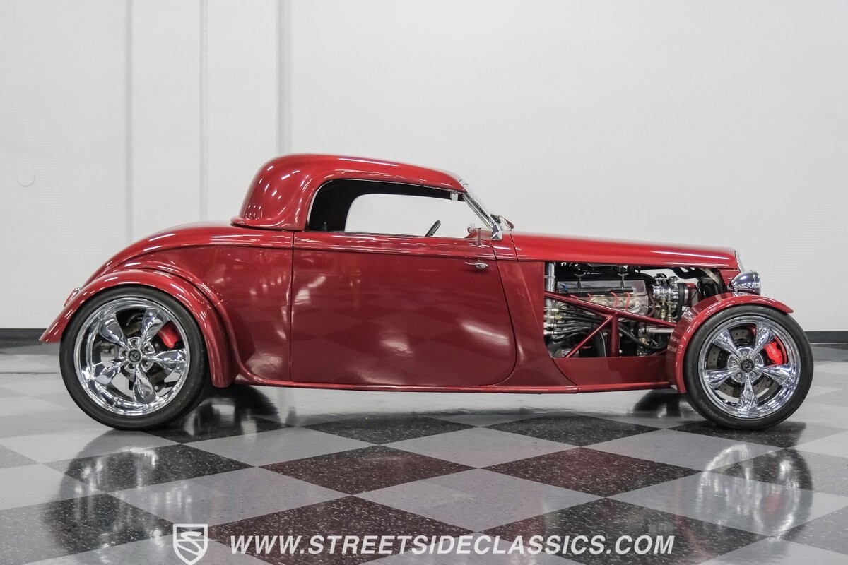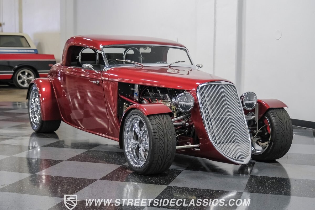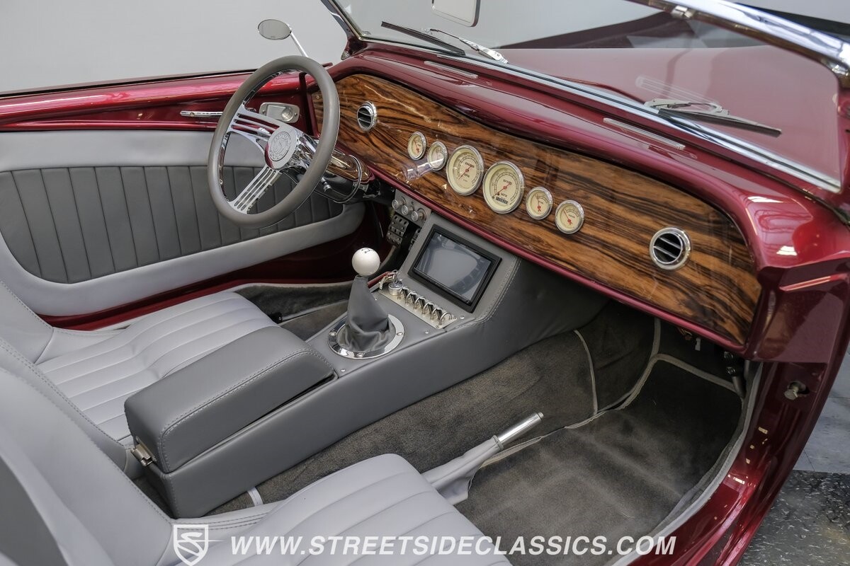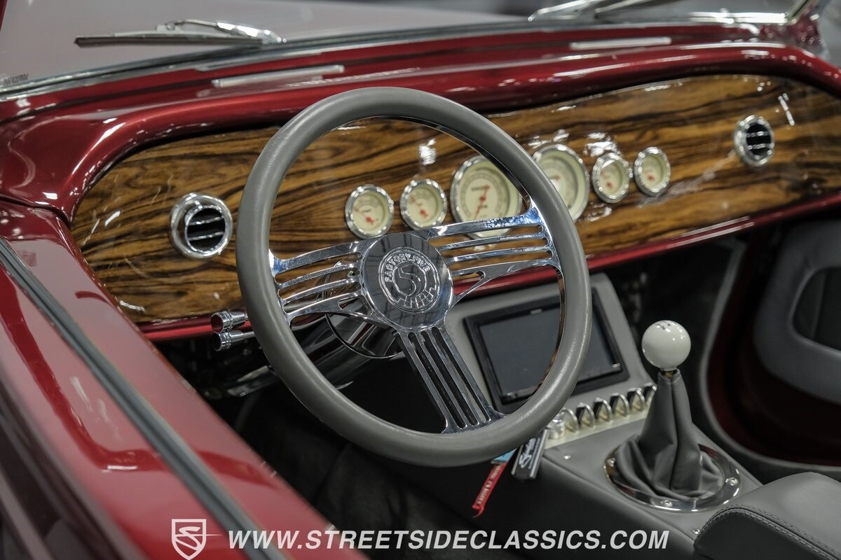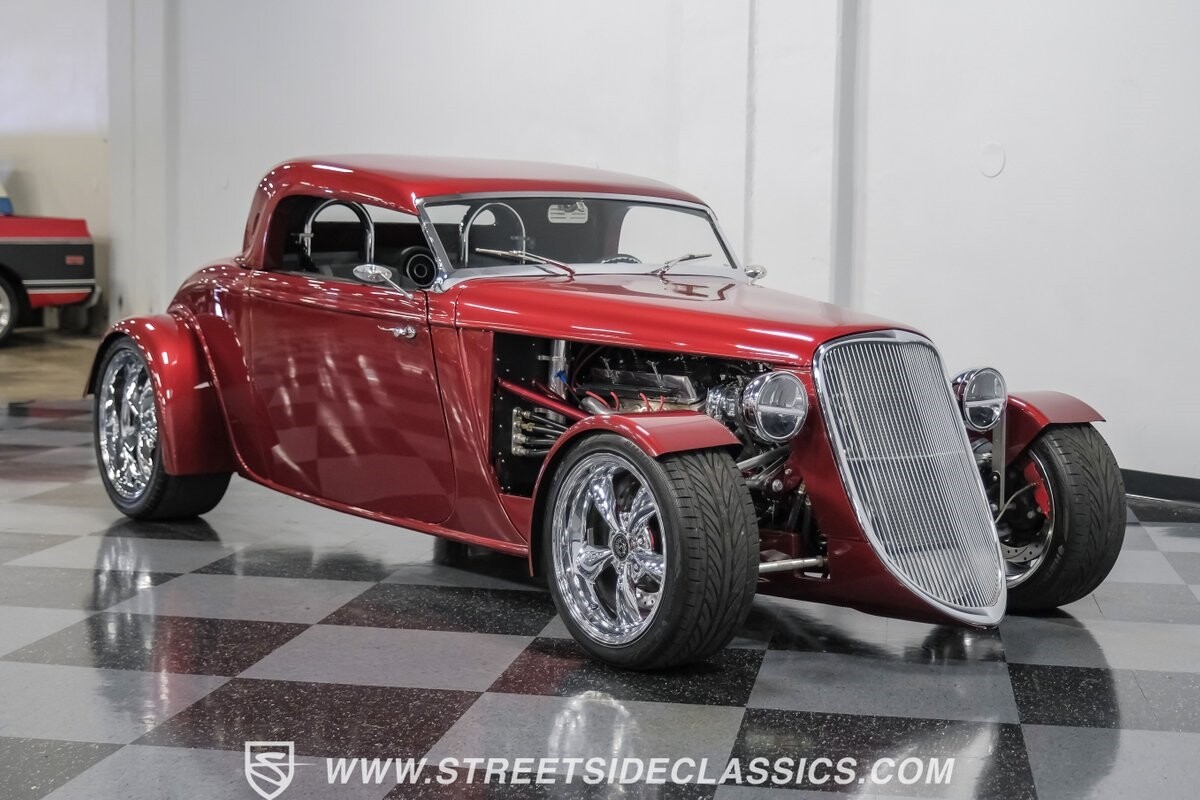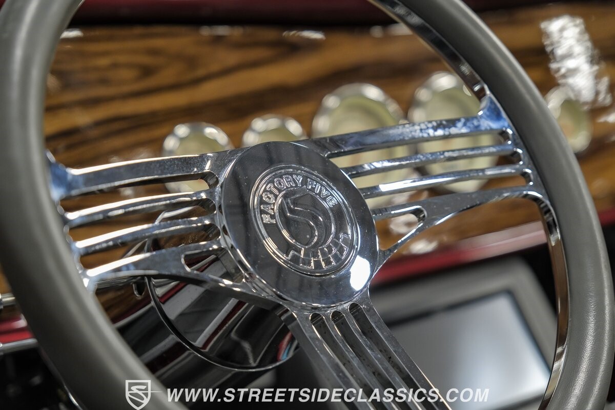 This sizzling burgundy 1933 Ford Factory Five coupe is a blazing tribute to '30s hot rod culture, expertly reimagined! The custom-built fiberglass body gleams under meticulous attention to detail, while the suicide doors and custom removable hardtop invite open-air thrills. With a mere 2,820 miles on the clock, this beauty is ready to cruise and capture attention. Gleaming 17" front and 20" rear Factory 5 chrome wheels, wrapped in 245/40ZR17 Hankook and 305/35ZR20 Goodyear tires respectively, offer a stance that's both aggressive and poised. The chrome grill and headlights add a dazzling touch, making it a standout spectacle.