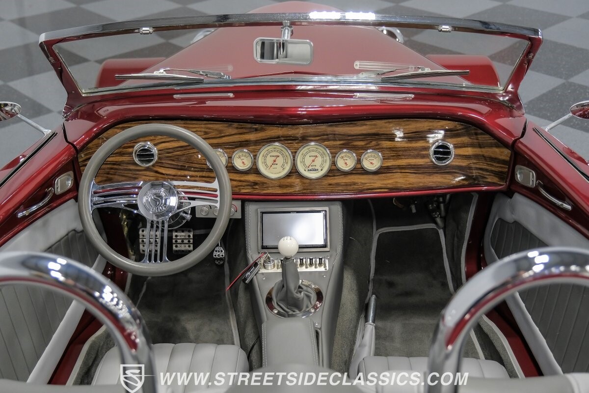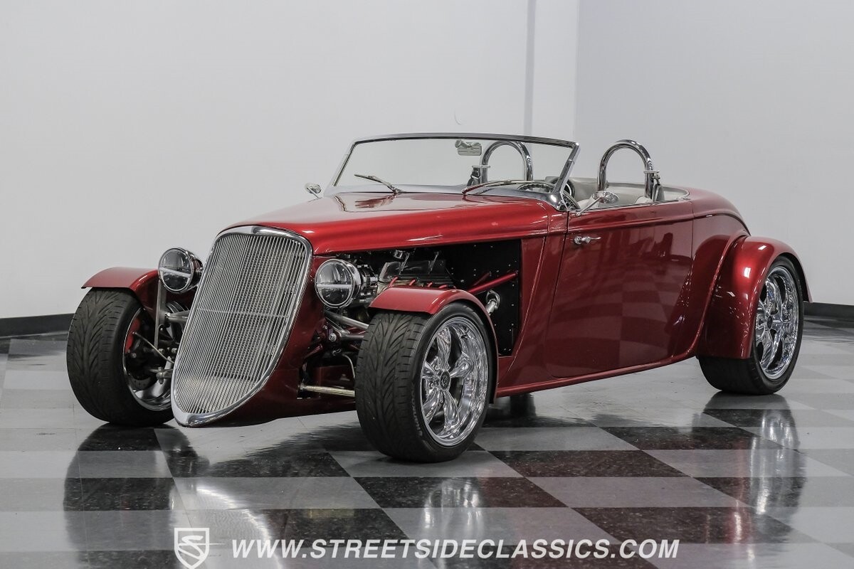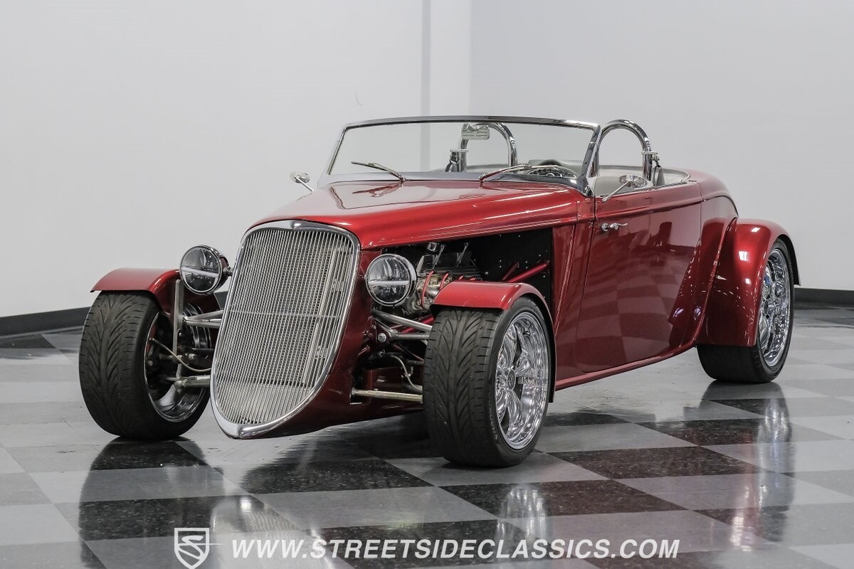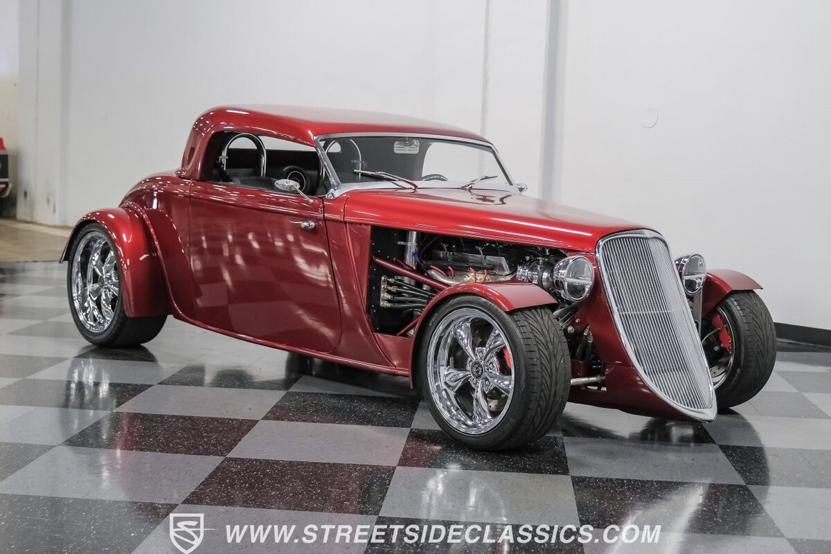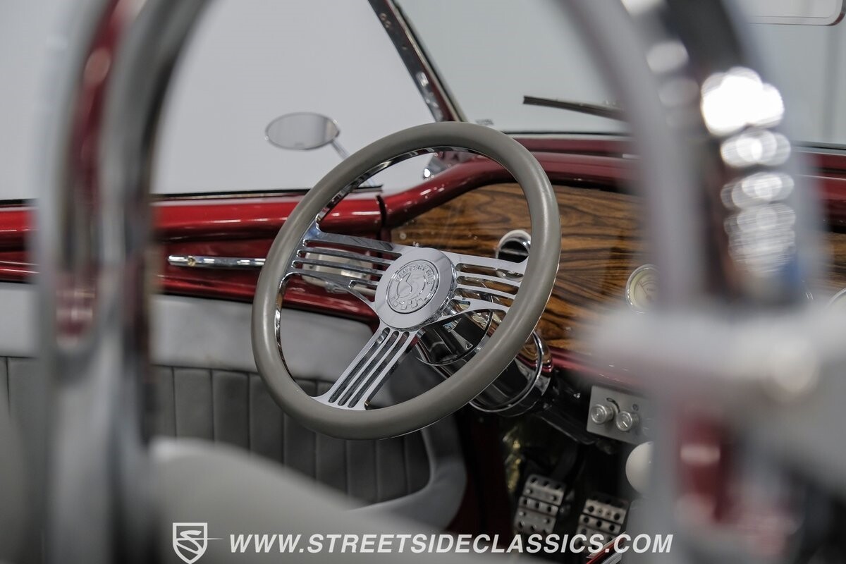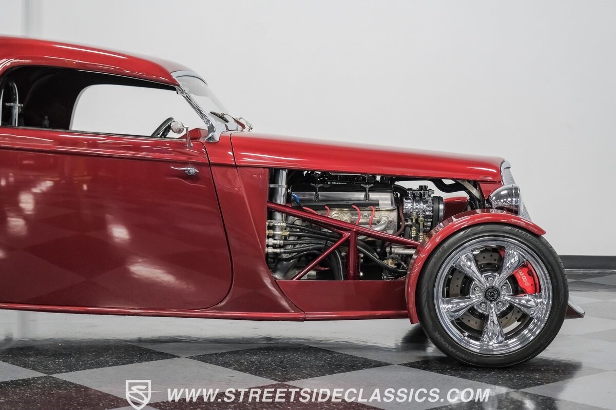 This sizzling burgundy 1933 Ford Factory Five coupe is a blazing tribute to '30s hot rod culture, expertly reimagined! The custom-built fiberglass body gleams under meticulous attention to detail, while the suicide doors and custom removable hardtop invite open-air thrills. With a mere 2,820 miles on the clock, this beauty is ready to cruise and capture attention. Gleaming 17" front and 20" rear Factory 5 chrome wheels, wrapped in 245/40ZR17 Hankook and 305/35ZR20 Goodyear tires respectively, offer a stance that's both aggressive and poised. The chrome grill and headlights add a dazzling touch, making it a standout spectacle.