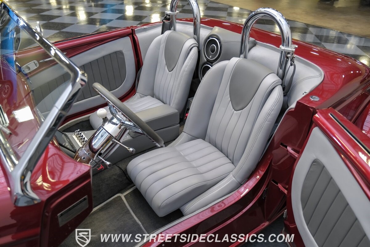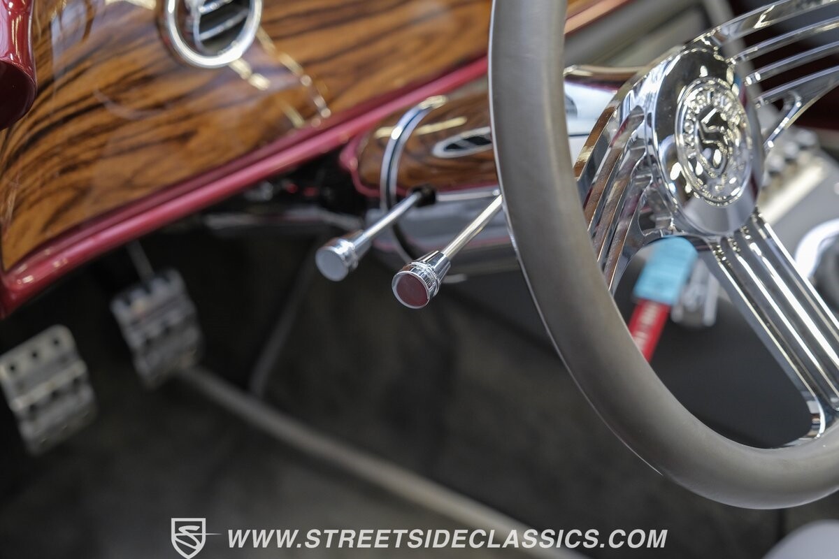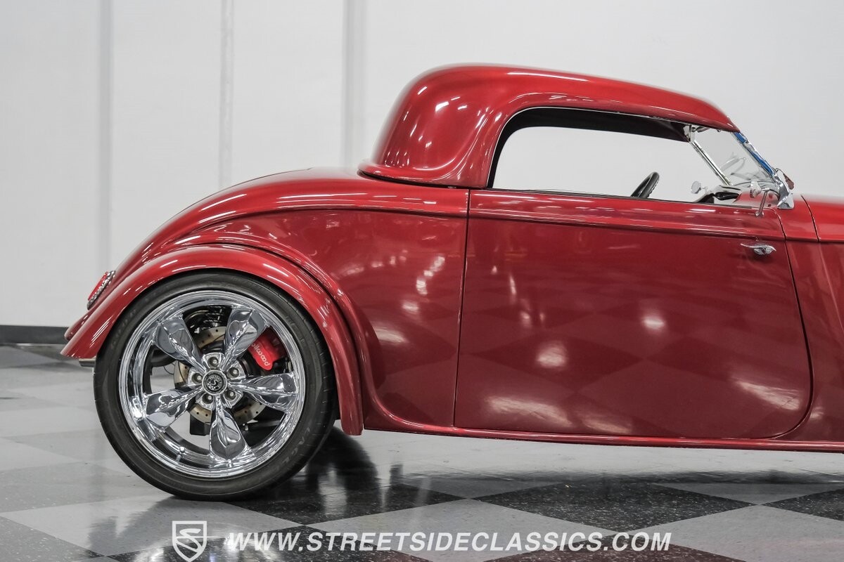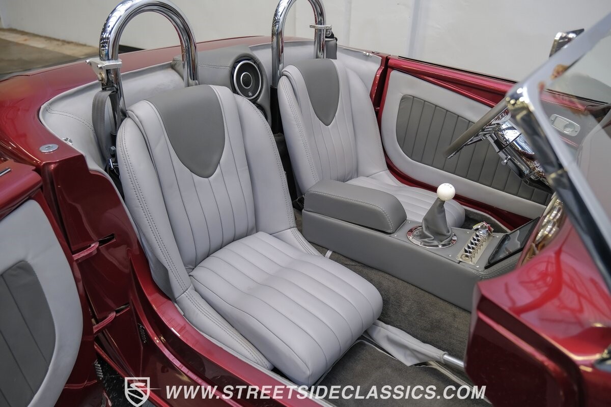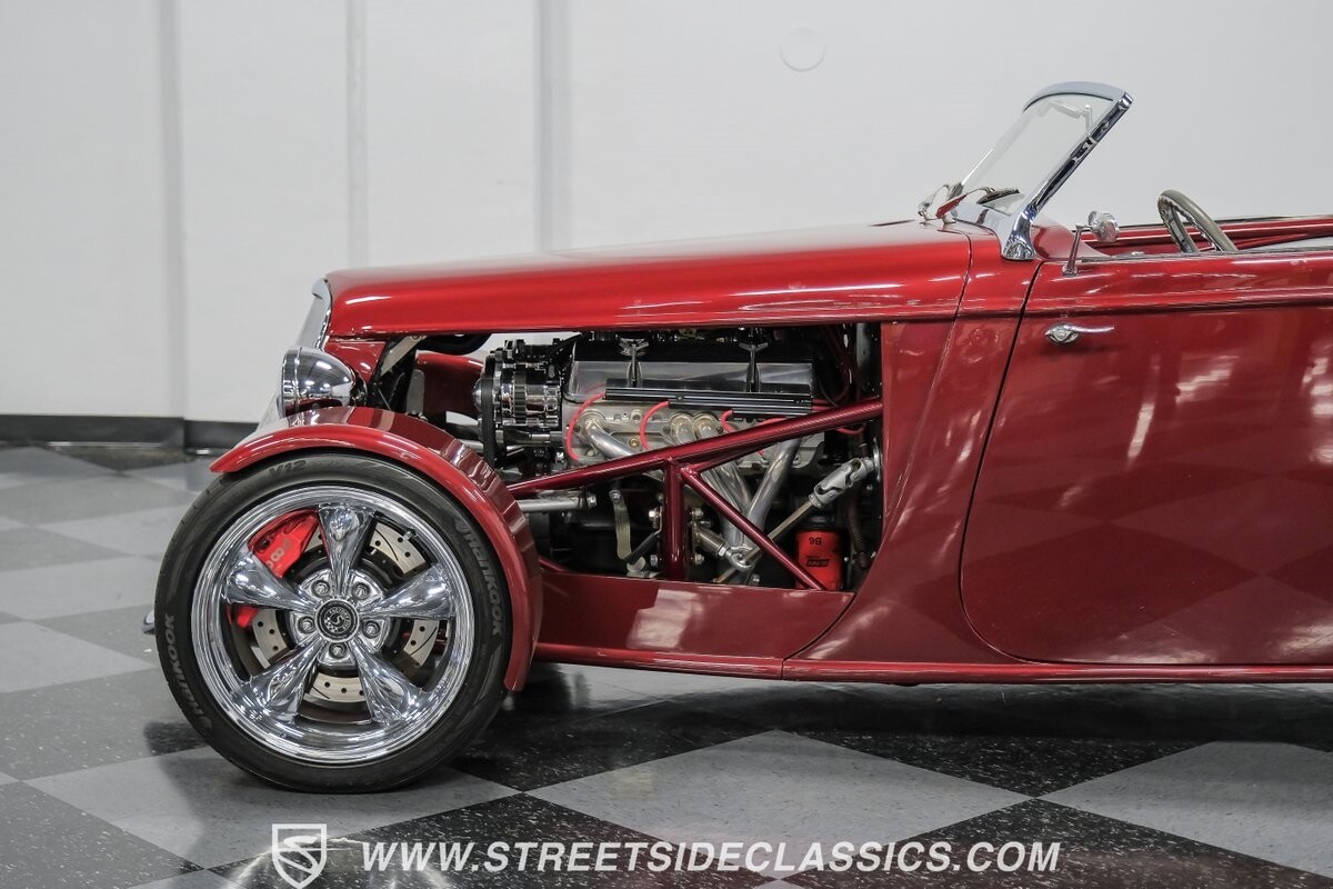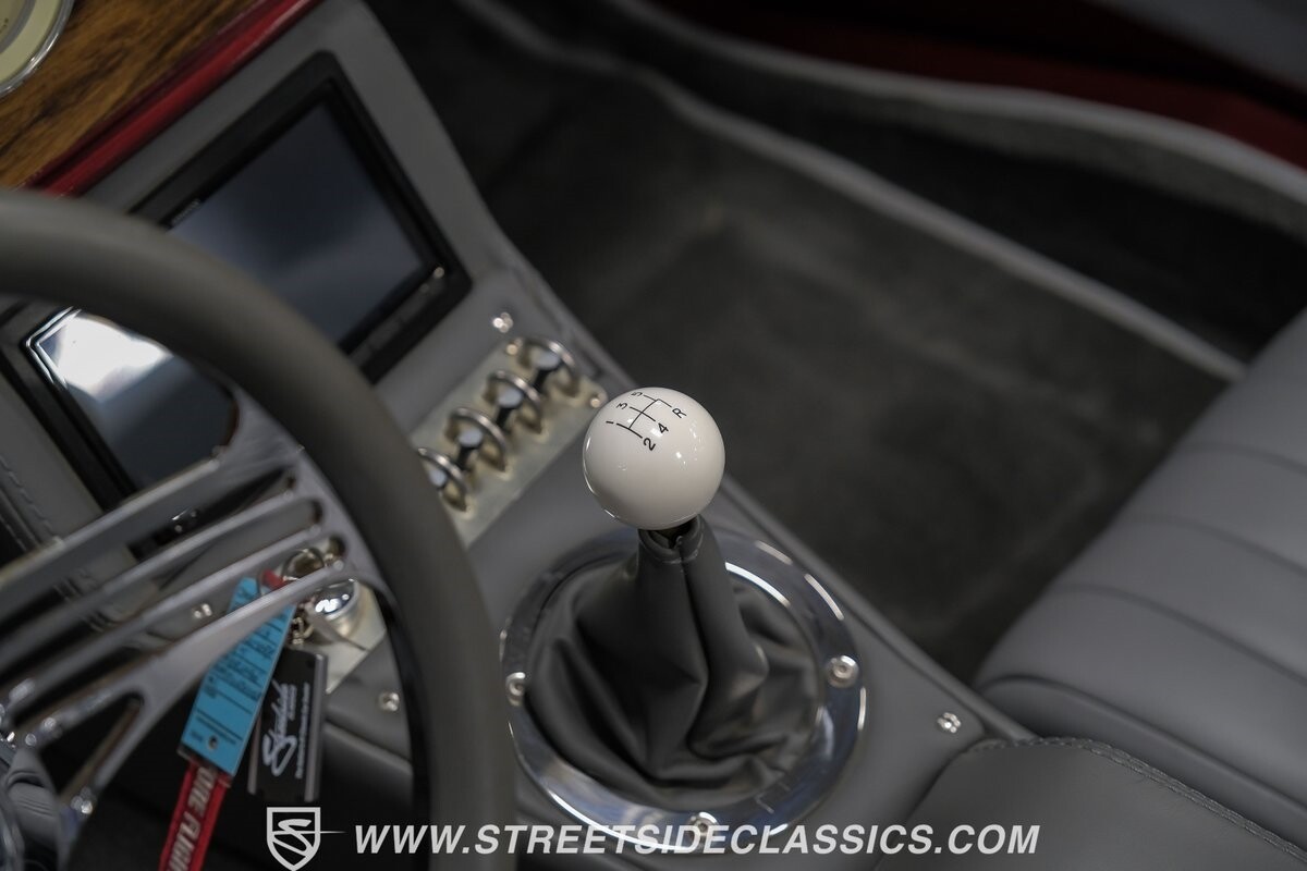 This sizzling burgundy 1933 Ford Factory Five coupe is a blazing tribute to '30s hot rod culture, expertly reimagined! The custom-built fiberglass body gleams under meticulous attention to detail, while the suicide doors and custom removable hardtop invite open-air thrills. With a mere 2,820 miles on the clock, this beauty is ready to cruise and capture attention. Gleaming 17" front and 20" rear Factory 5 chrome wheels, wrapped in 245/40ZR17 Hankook and 305/35ZR20 Goodyear tires respectively, offer a stance that's both aggressive and poised. The chrome grill and headlights add a dazzling touch, making it a standout spectacle.