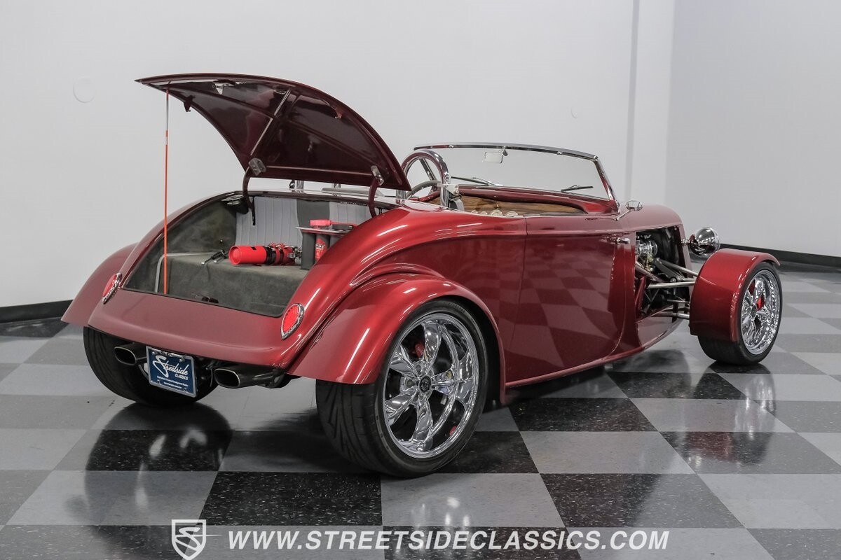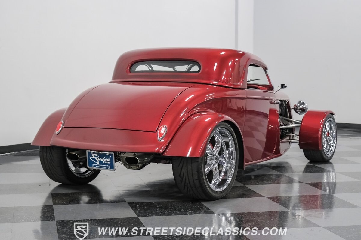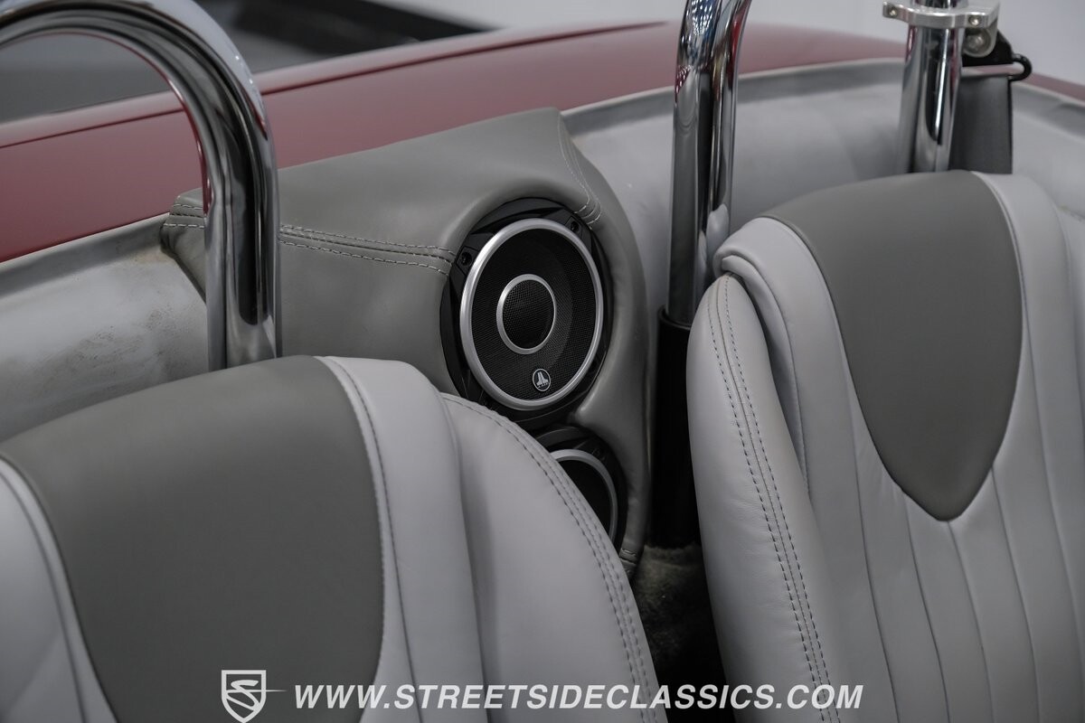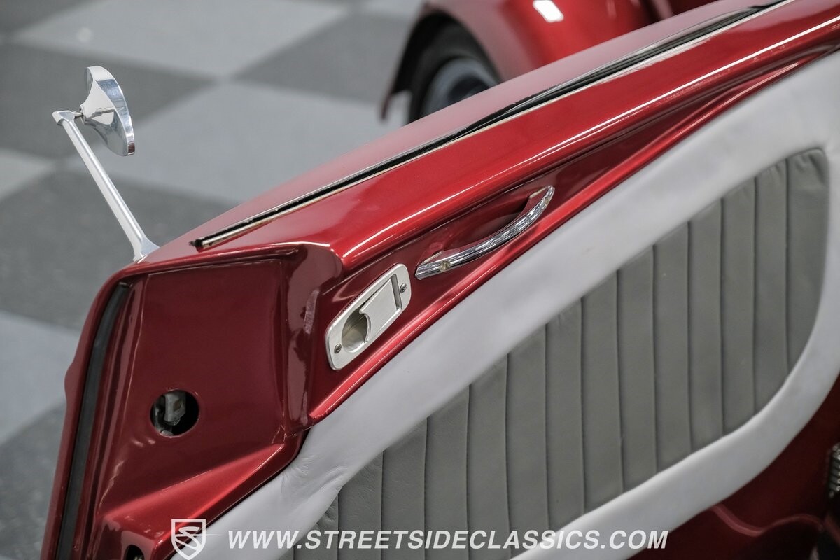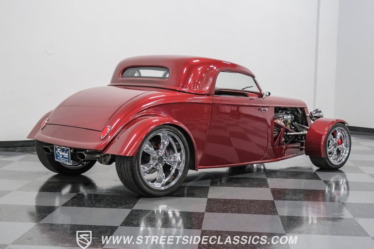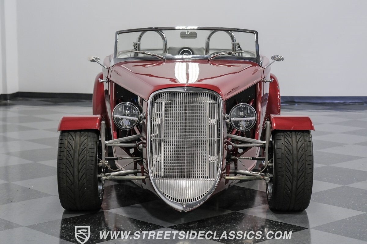This sizzling burgundy 1933 Ford Factory Five coupe is a blazing tribute to '30s hot rod culture, expertly reimagined! The custom-built fiberglass body gleams under meticulous attention to detail, while the suicide doors and custom removable hardtop invite open-air thrills. With a mere 2,820 miles on the clock, this beauty is ready to cruise and capture attention. Gleaming 17" front and 20" rear Factory 5 chrome wheels, wrapped in 245/40ZR17 Hankook and 305/35ZR20 Goodyear tires respectively, offer a stance that's both aggressive and poised. The chrome grill and headlights add a dazzling touch, making it a standout spectacle.