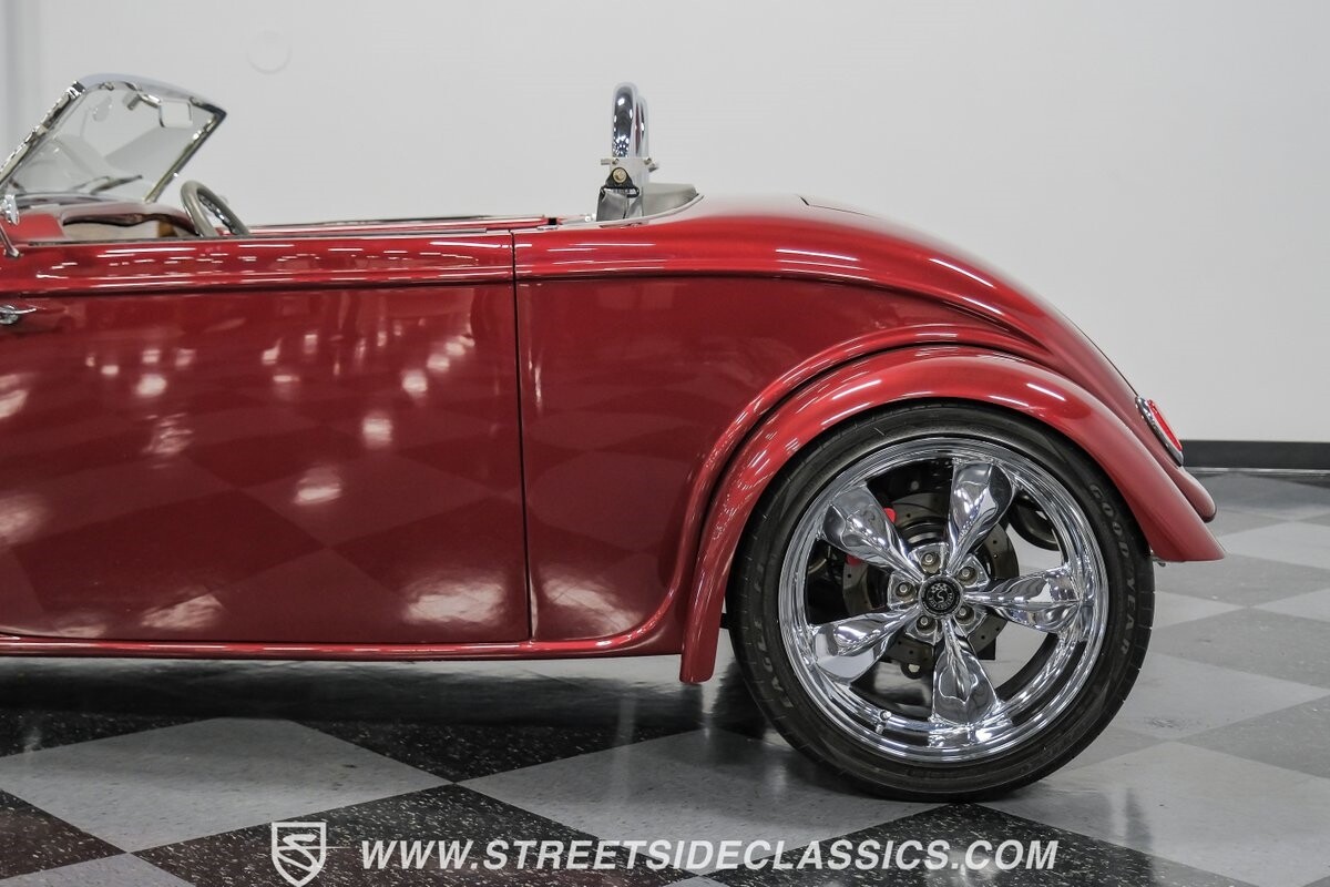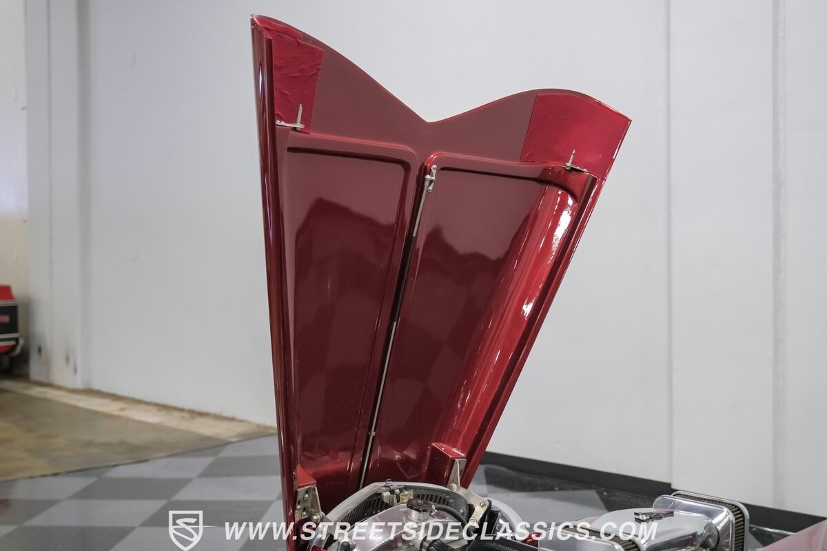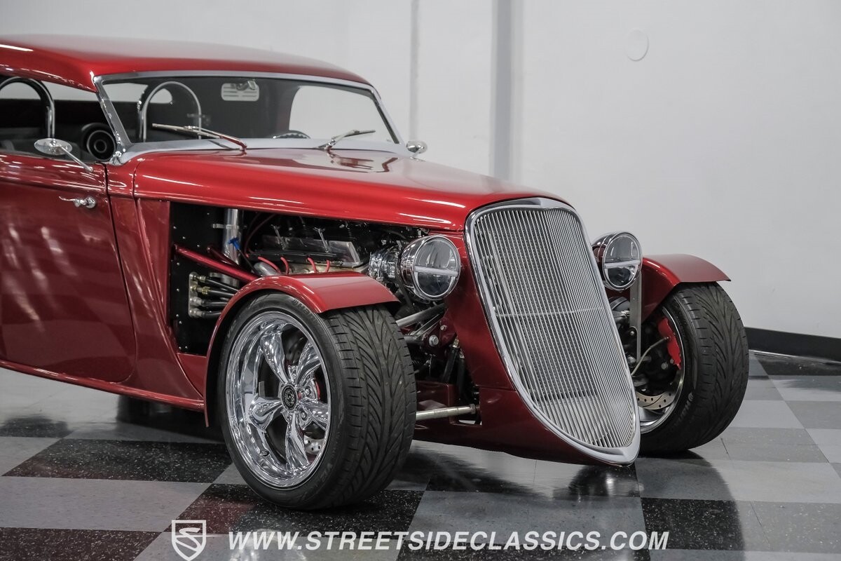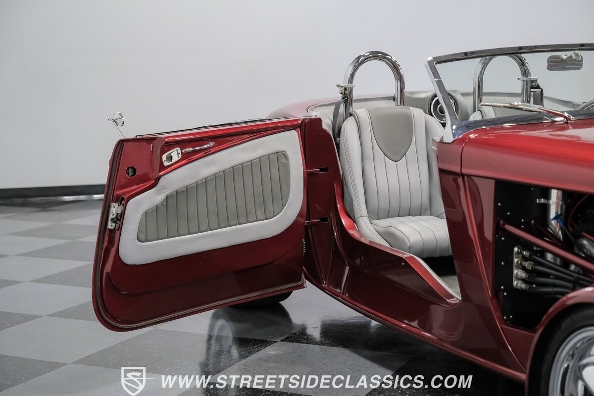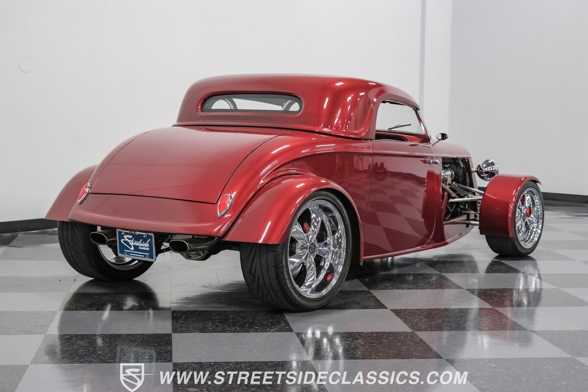 This sizzling burgundy 1933 Ford Factory Five coupe is a blazing tribute to '30s hot rod culture, expertly reimagined! The custom-built fiberglass body gleams under meticulous attention to detail, while the suicide doors and custom removable hardtop invite open-air thrills. With a mere 2,820 miles on the clock, this beauty is ready to cruise and capture attention. Gleaming 17" front and 20" rear Factory 5 chrome wheels, wrapped in 245/40ZR17 Hankook and 305/35ZR20 Goodyear tires respectively, offer a stance that's both aggressive and poised. The chrome grill and headlights add a dazzling touch, making it a standout spectacle.