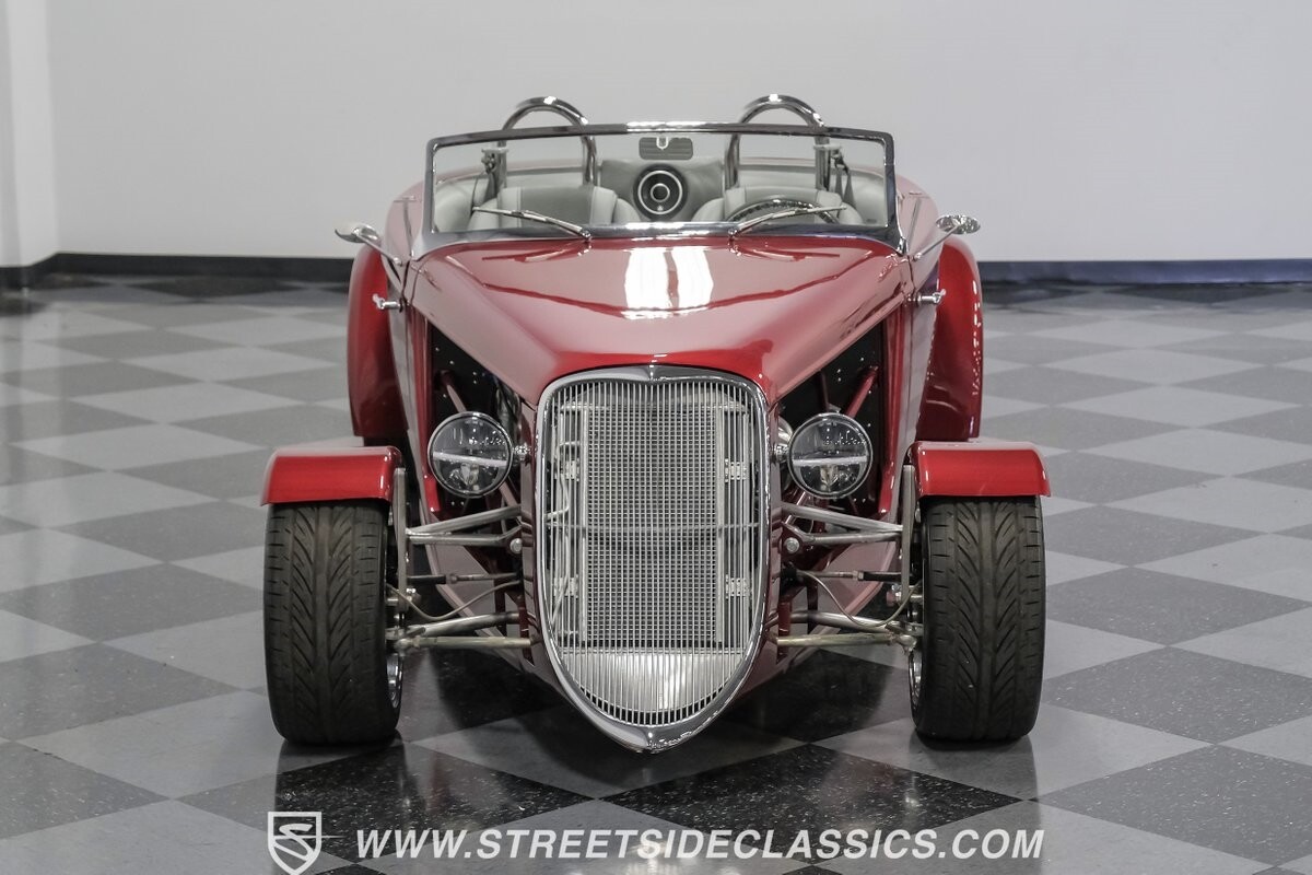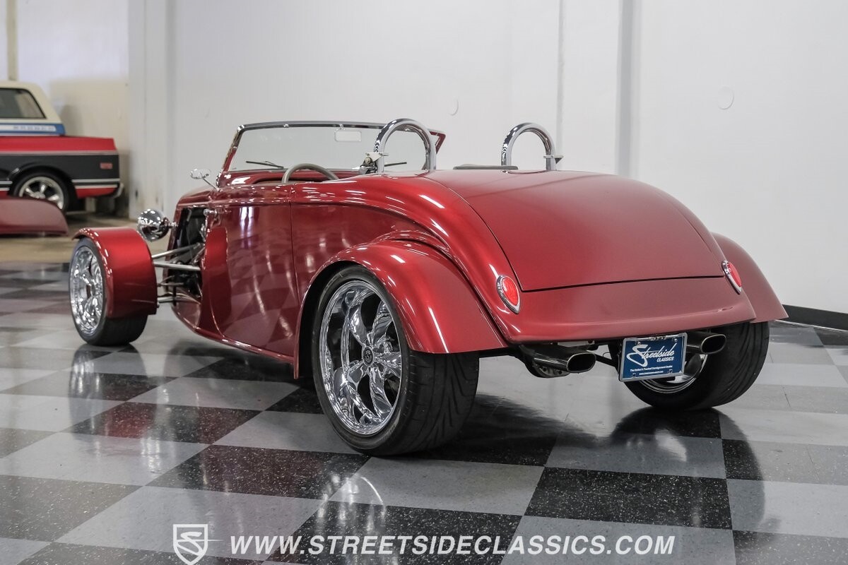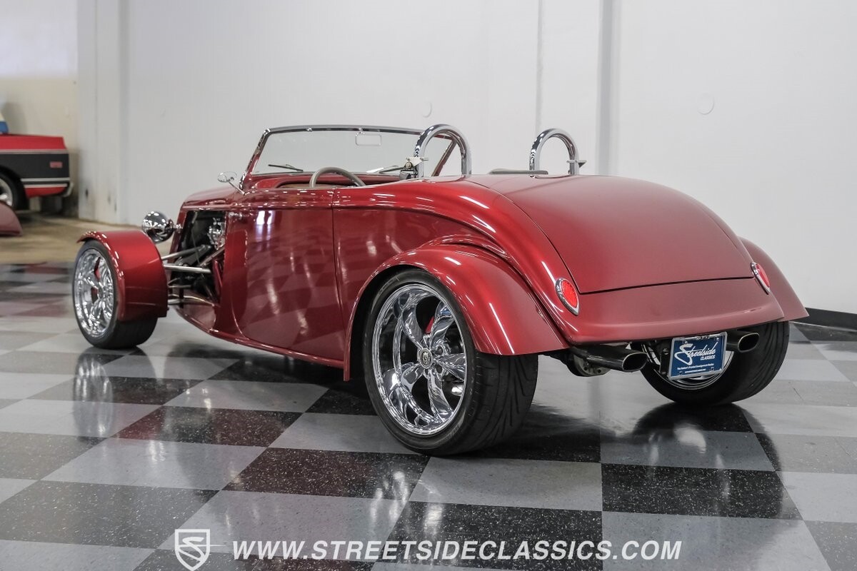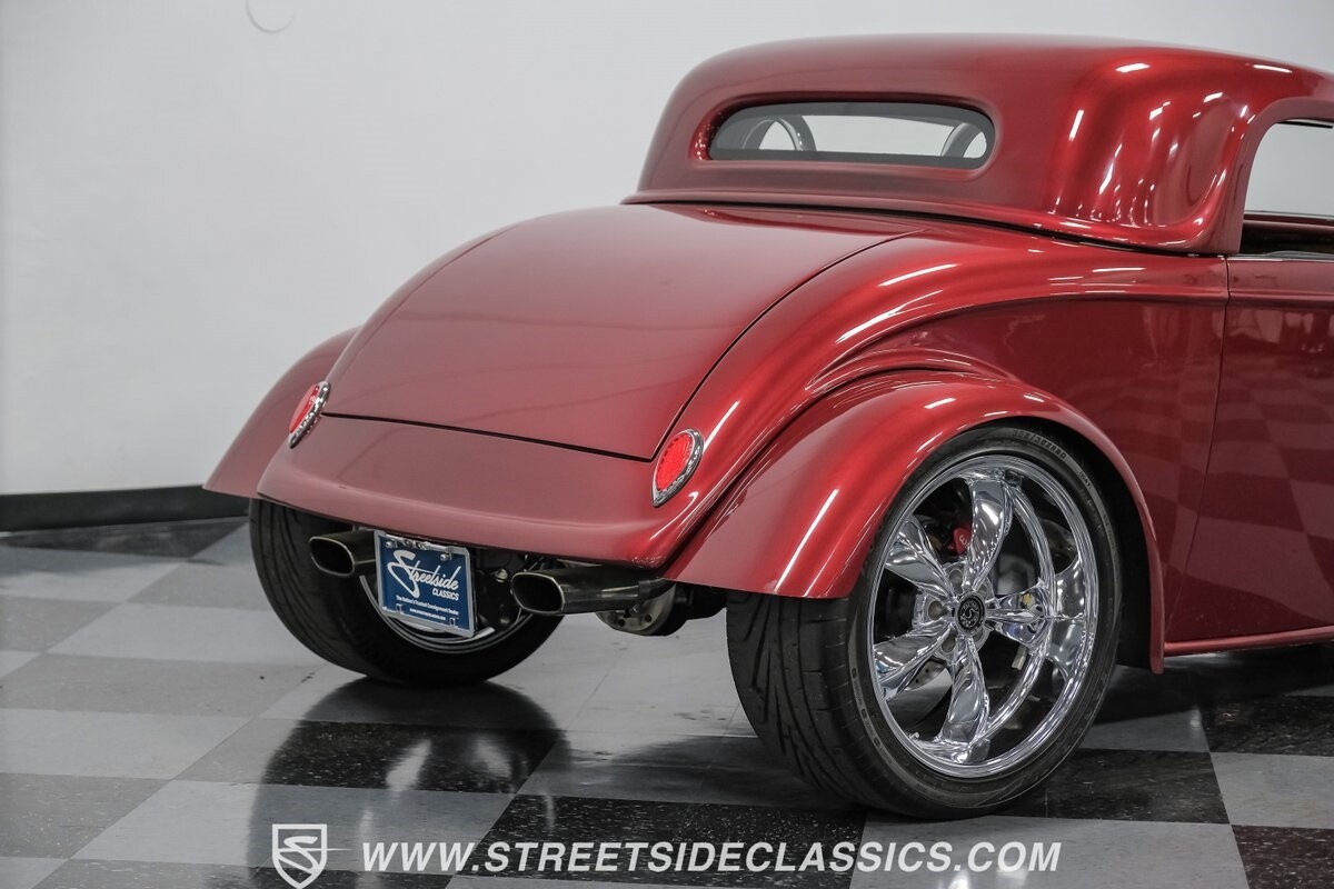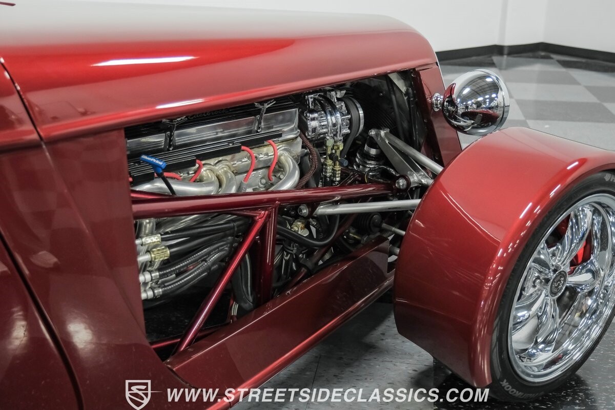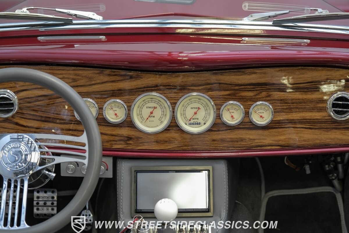 This sizzling burgundy 1933 Ford Factory Five coupe is a blazing tribute to '30s hot rod culture, expertly reimagined! The custom-built fiberglass body gleams under meticulous attention to detail, while the suicide doors and custom removable hardtop invite open-air thrills. With a mere 2,820 miles on the clock, this beauty is ready to cruise and capture attention. Gleaming 17" front and 20" rear Factory 5 chrome wheels, wrapped in 245/40ZR17 Hankook and 305/35ZR20 Goodyear tires respectively, offer a stance that's both aggressive and poised. The chrome grill and headlights add a dazzling touch, making it a standout spectacle.