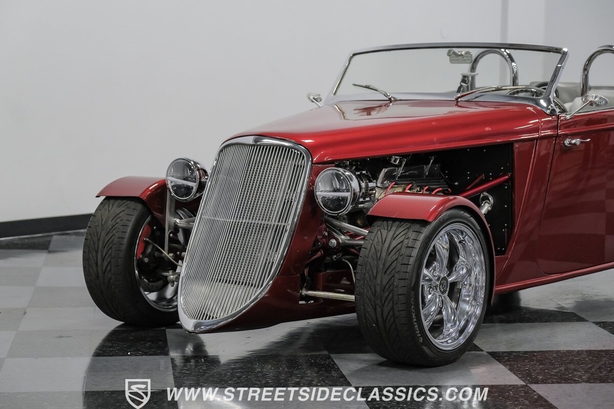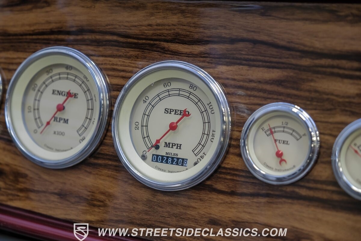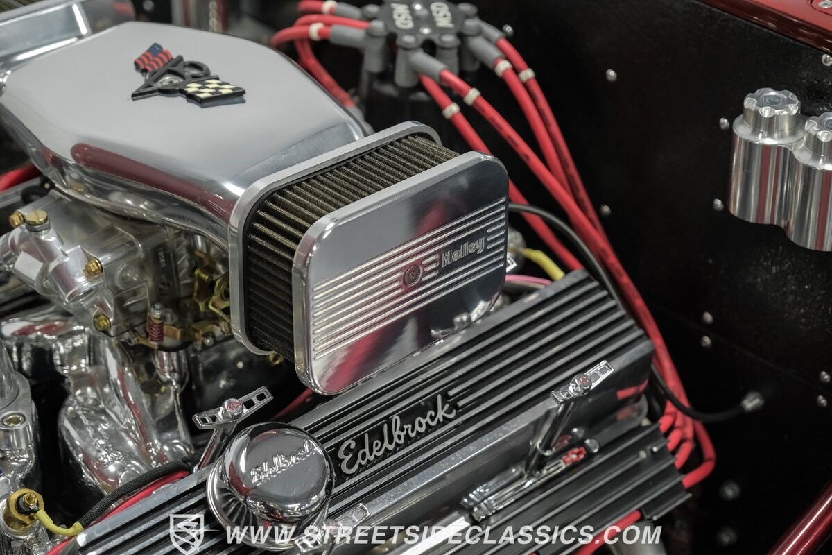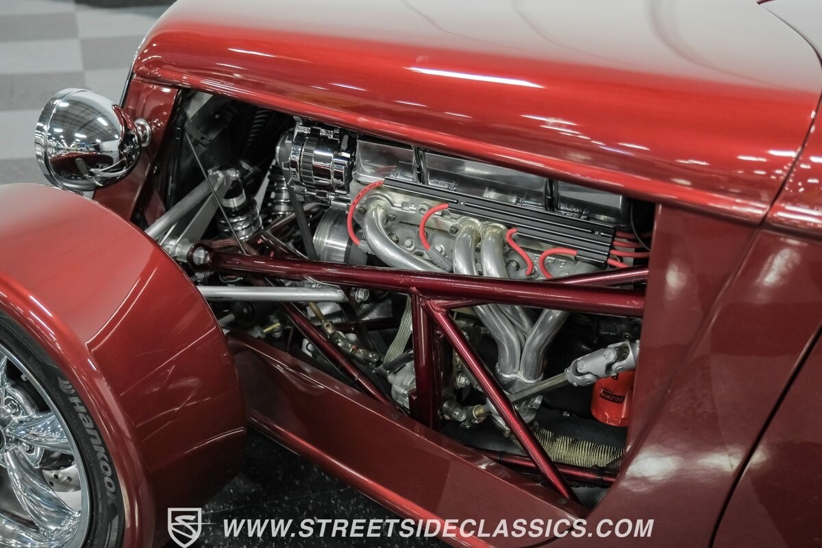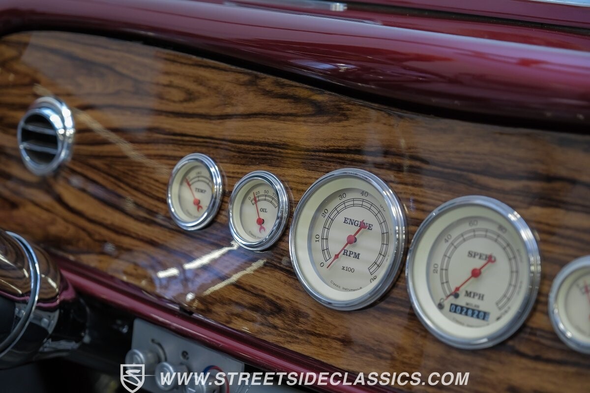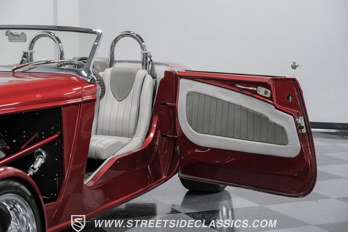 This sizzling burgundy 1933 Ford Factory Five coupe is a blazing tribute to '30s hot rod culture, expertly reimagined! The custom-built fiberglass body gleams under meticulous attention to detail, while the suicide doors and custom removable hardtop invite open-air thrills. With a mere 2,820 miles on the clock, this beauty is ready to cruise and capture attention. Gleaming 17" front and 20" rear Factory 5 chrome wheels, wrapped in 245/40ZR17 Hankook and 305/35ZR20 Goodyear tires respectively, offer a stance that's both aggressive and poised. The chrome grill and headlights add a dazzling touch, making it a standout spectacle.