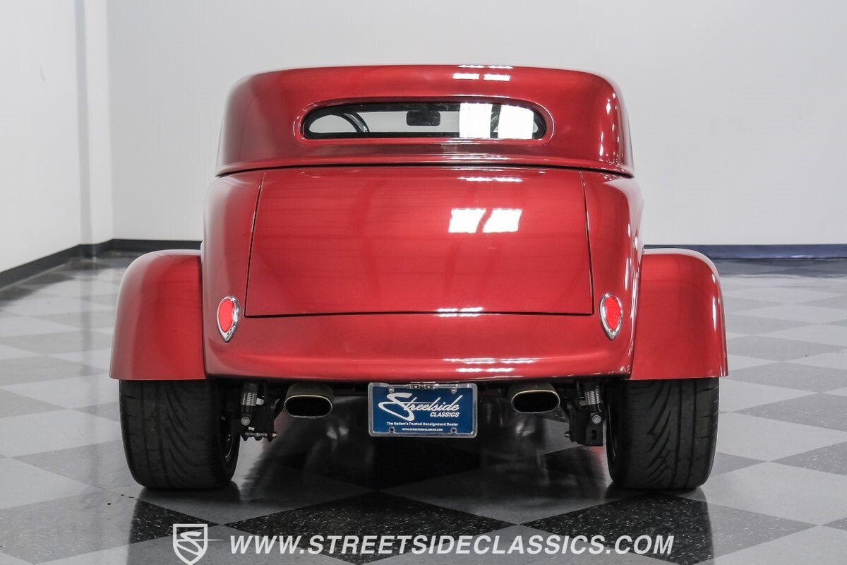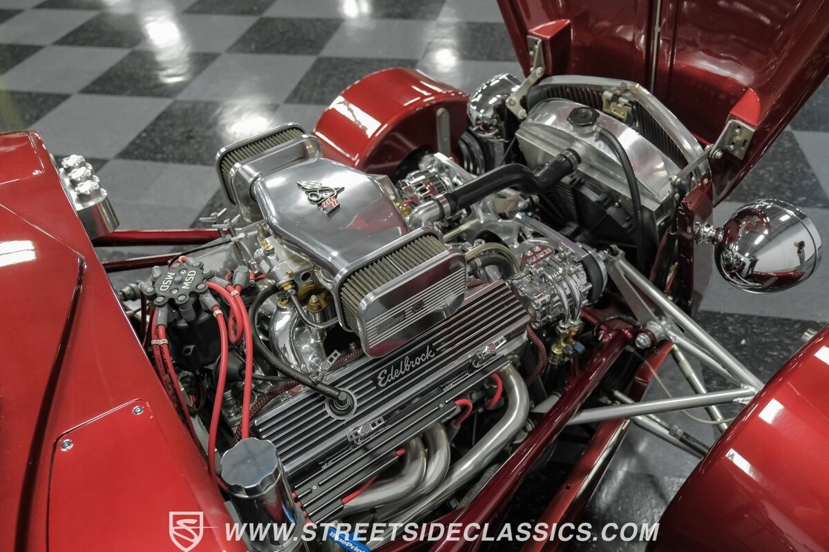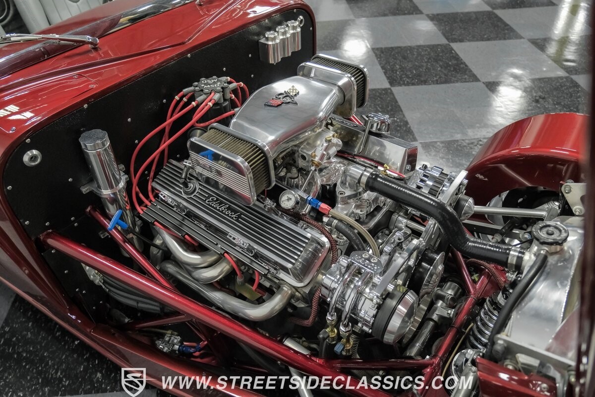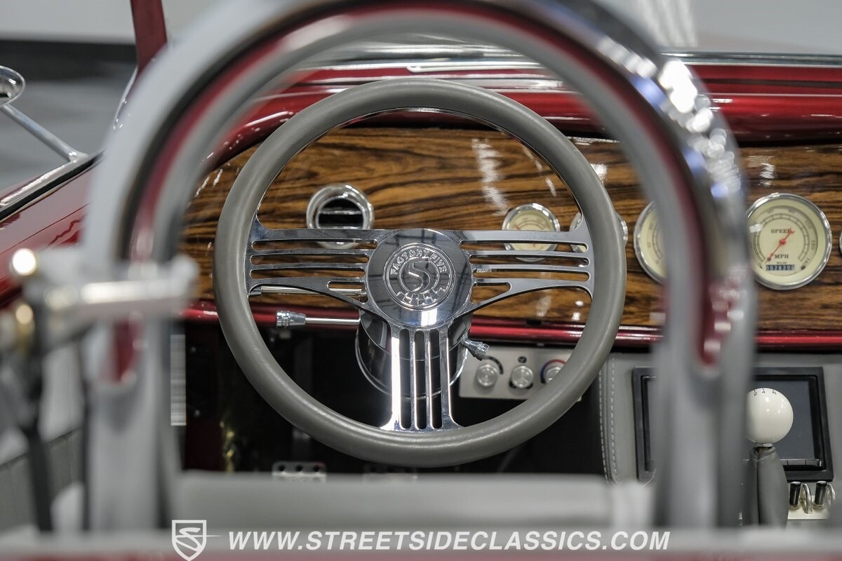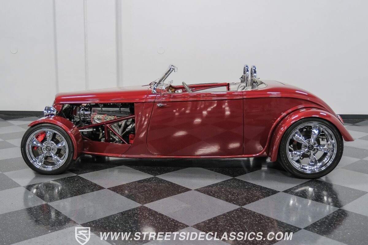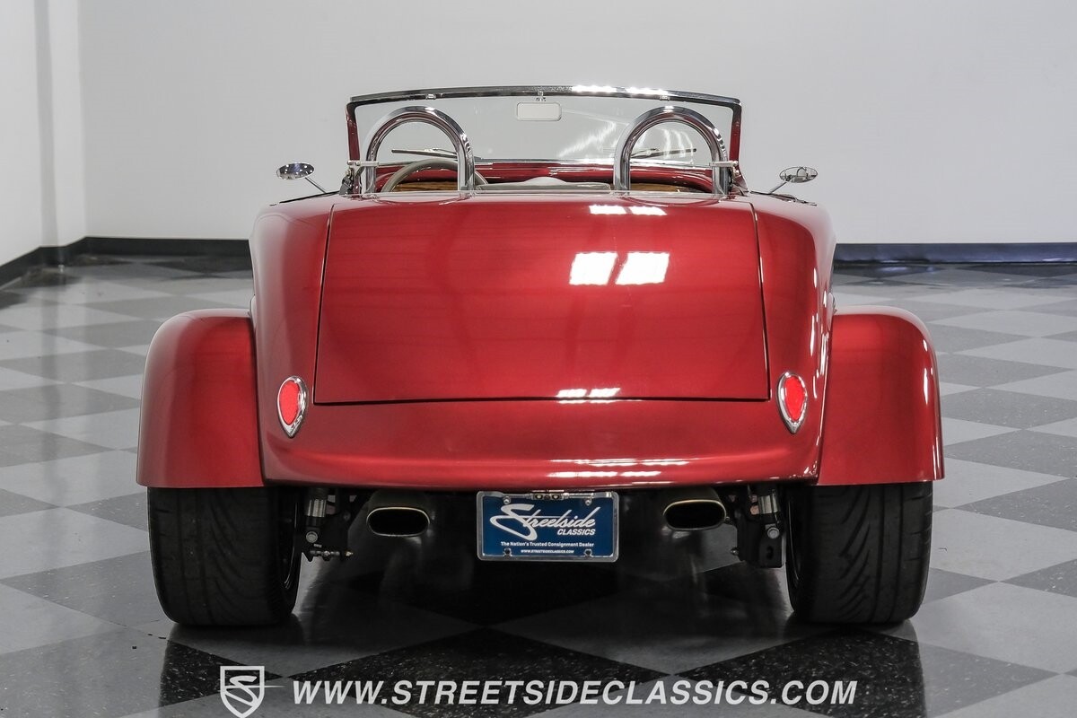 This sizzling burgundy 1933 Ford Factory Five coupe is a blazing tribute to '30s hot rod culture, expertly reimagined! The custom-built fiberglass body gleams under meticulous attention to detail, while the suicide doors and custom removable hardtop invite open-air thrills. With a mere 2,820 miles on the clock, this beauty is ready to cruise and capture attention. Gleaming 17" front and 20" rear Factory 5 chrome wheels, wrapped in 245/40ZR17 Hankook and 305/35ZR20 Goodyear tires respectively, offer a stance that's both aggressive and poised. The chrome grill and headlights add a dazzling touch, making it a standout spectacle.