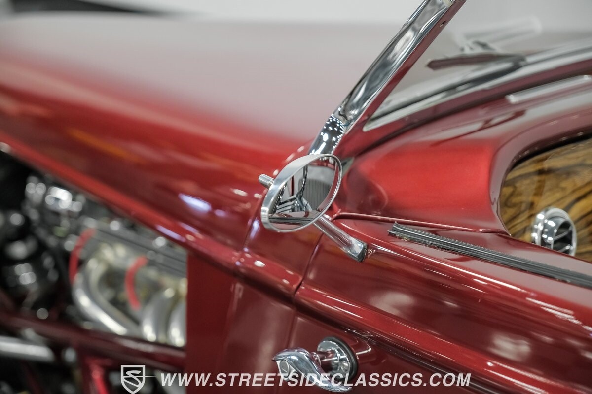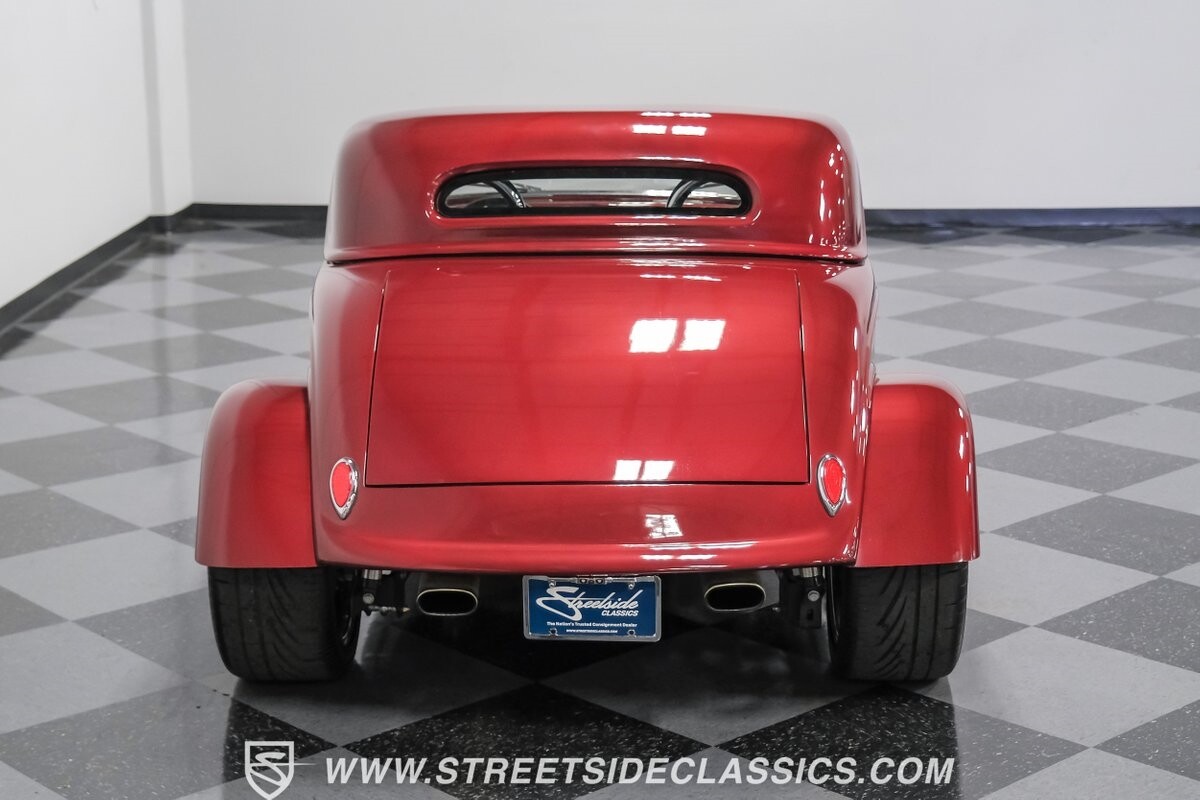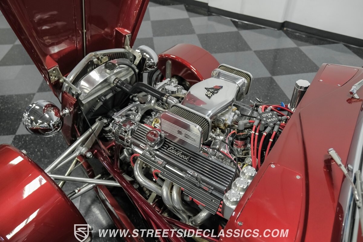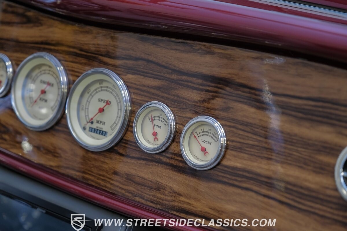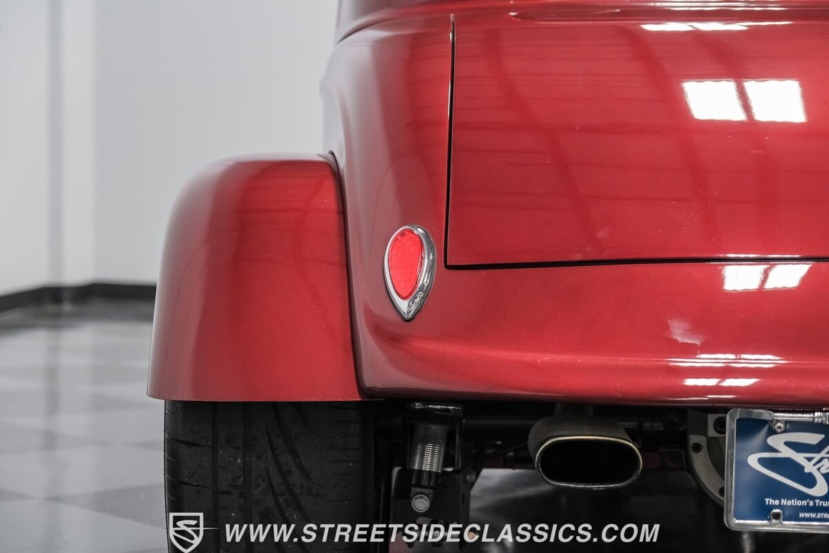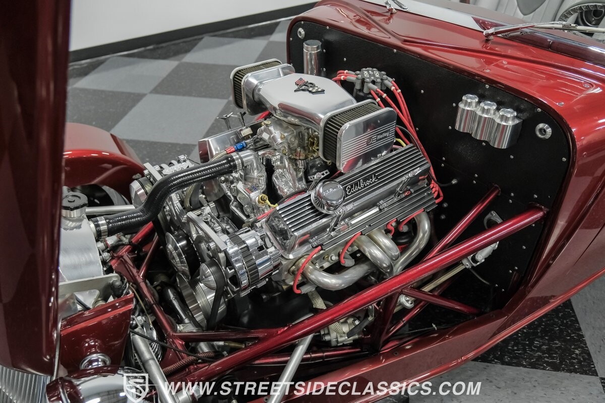 This sizzling burgundy 1933 Ford Factory Five coupe is a blazing tribute to '30s hot rod culture, expertly reimagined! The custom-built fiberglass body gleams under meticulous attention to detail, while the suicide doors and custom removable hardtop invite open-air thrills. With a mere 2,820 miles on the clock, this beauty is ready to cruise and capture attention. Gleaming 17" front and 20" rear Factory 5 chrome wheels, wrapped in 245/40ZR17 Hankook and 305/35ZR20 Goodyear tires respectively, offer a stance that's both aggressive and poised. The chrome grill and headlights add a dazzling touch, making it a standout spectacle.