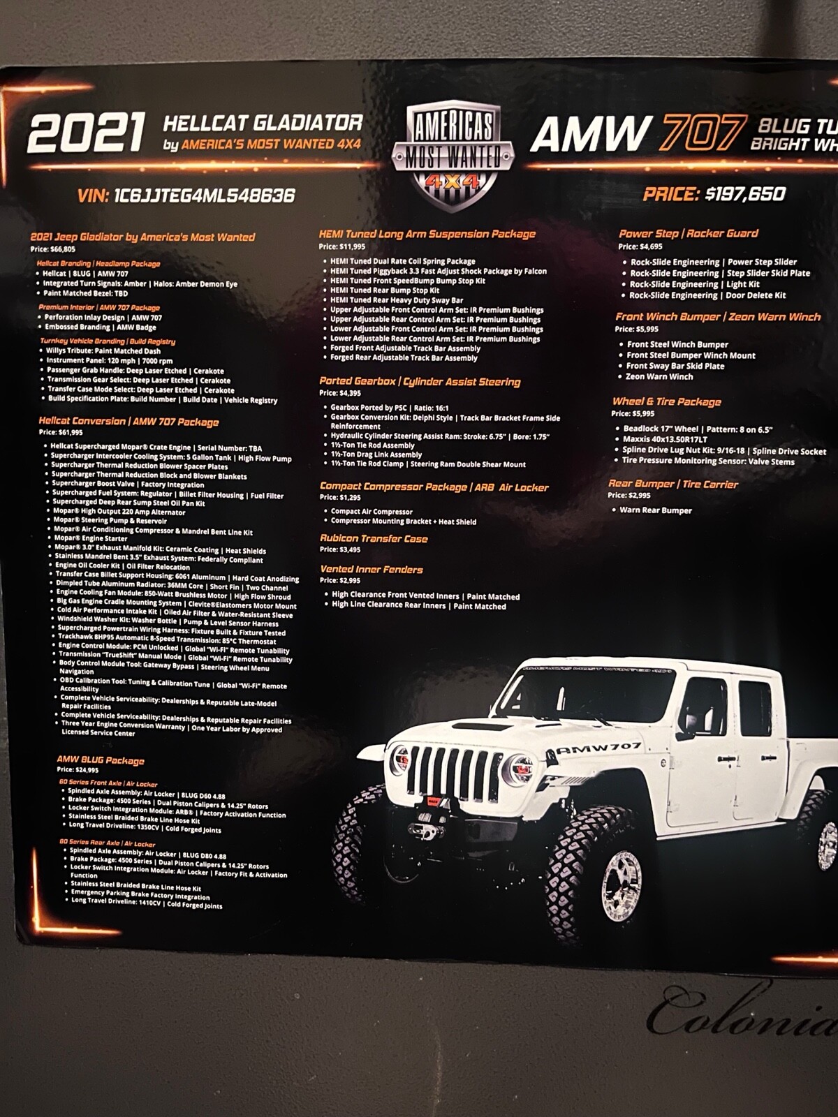 2021 Americas Most Wanted Hellcat Gladiator 707 Please go to AMW4x4.com to see the extension of their build list. Interior, exterior complete drivetrain, Dana 60 and 80 axles with adjustable suspension. I purchased the vehicle from them with 3000 miles on it. In my ownership it has not seen dirt, rocks or even a burnout! Everything about the vehicle is still perfect. Clean and clear title that I have in hand. Call if your serious 334-220-4475Vehicle Details