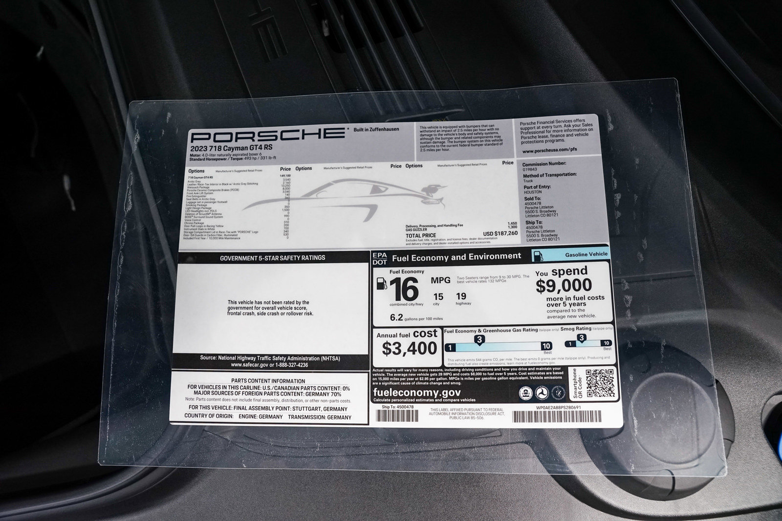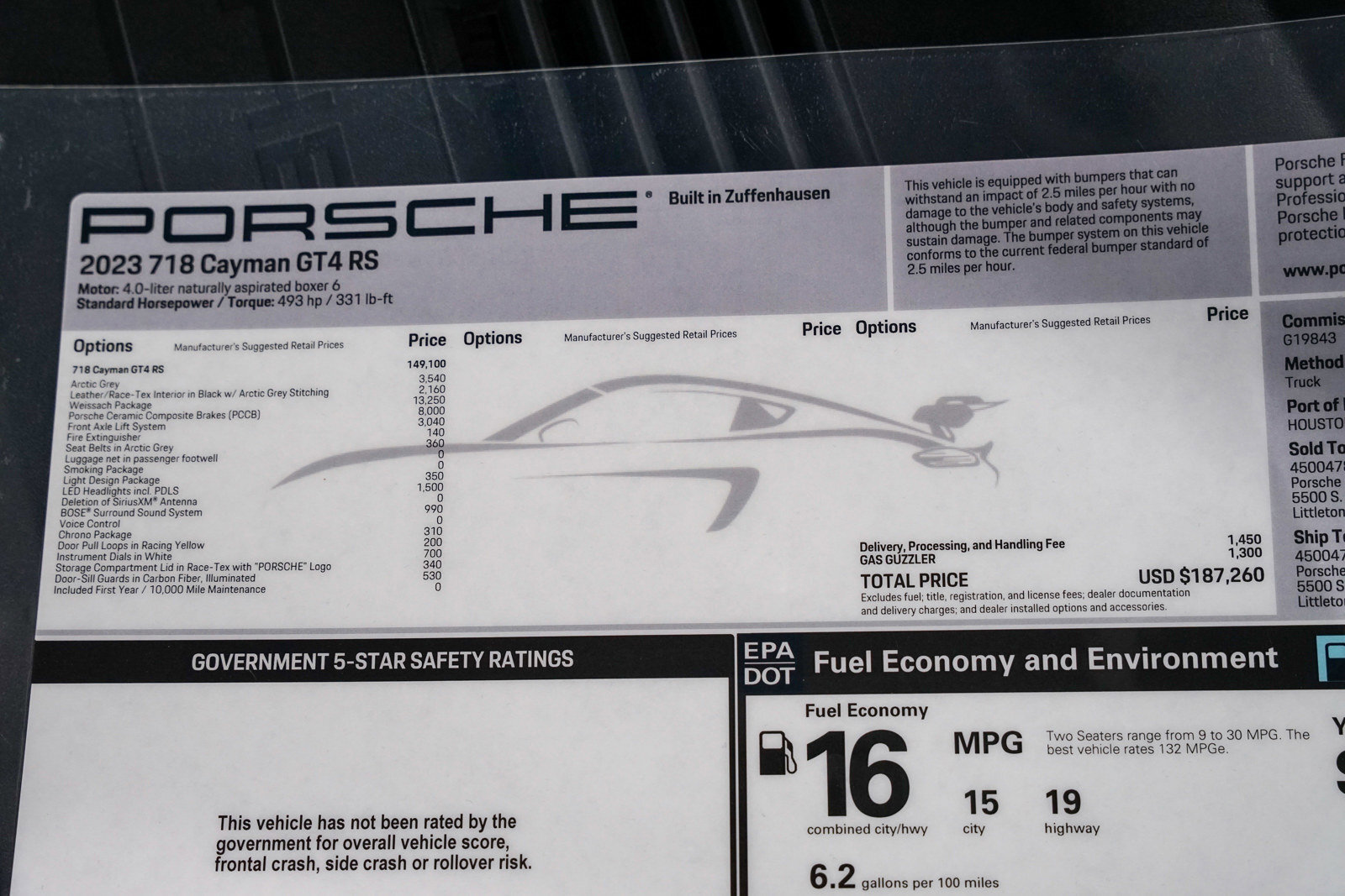 *Porsche 718 Cayman GT4 RS (2023)* * *2,455 miles* * *Weissach Package* * *PCCB* * *Arctic Grey Exterior* * *Black W/Arctic Grey, Leather/Race Tex Seat Trim Interior* * *Front Axle Lift* * *Sport Chrono* * *Door Pull Loops In Racing Yellow* * *Seat Belts In Arctic Grey* * *Instrument Dials In White* * *Storage Compart Lid In Race Tex W/Porsche Logo* * *Fire Extinguisher* * *Bose Sound*Unfortunately, Porsche is bidding farewell to the familiar Boxster and Cayman models. Most likely, their place will be taken by new fully electric models of the brand... Hence, the Porsche 718 Cayman GT4 RS is the perfect farewell version that will likely only increase in value over time. Moreover, many experts consider the 718 Cayman GT4 RS the best modern Porsche in terms of handling and driving emotions. It's hard to disagree, considering its mid-engine layout and suspension elements borrowed from the 911 GT models.*Options:*U0 - Arctic Grey610 - Black W/Arctic Grey, Leather/Race Tex Seat Trim04I - Weissach Package474 - Front Axle Lift SystemQR5 - Chrono Package450 - Porsche Ceramic Composite Brakes (PCCB)QH1 - Voice Control684 - Deletion Of Siriusxm Antenna9VL - Bose Surround Sound System630 - Light Design PackageXXD - Illuminated Door Sill Guards In Carbon Fiber583 - Smoking Package581 - Luggage Net In Passenger FootwellXBC - Door Pull Loops In Racing Yellow562 - Seat Belts In Arctic GreyXFJ - Instrument Dials In WhiteXLG - Storage Compart Lid In Race Tex W/Porsche Logo509 - Fire Extinguisher634 - Led Headlights Incl. Porsche Dynamic Light System (PDLS)