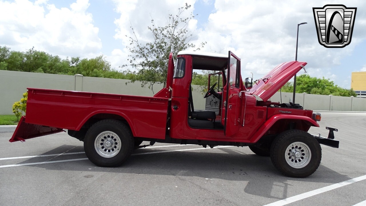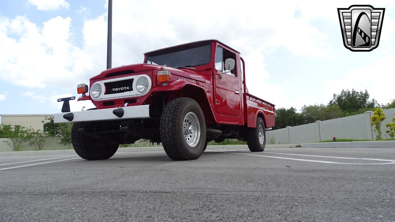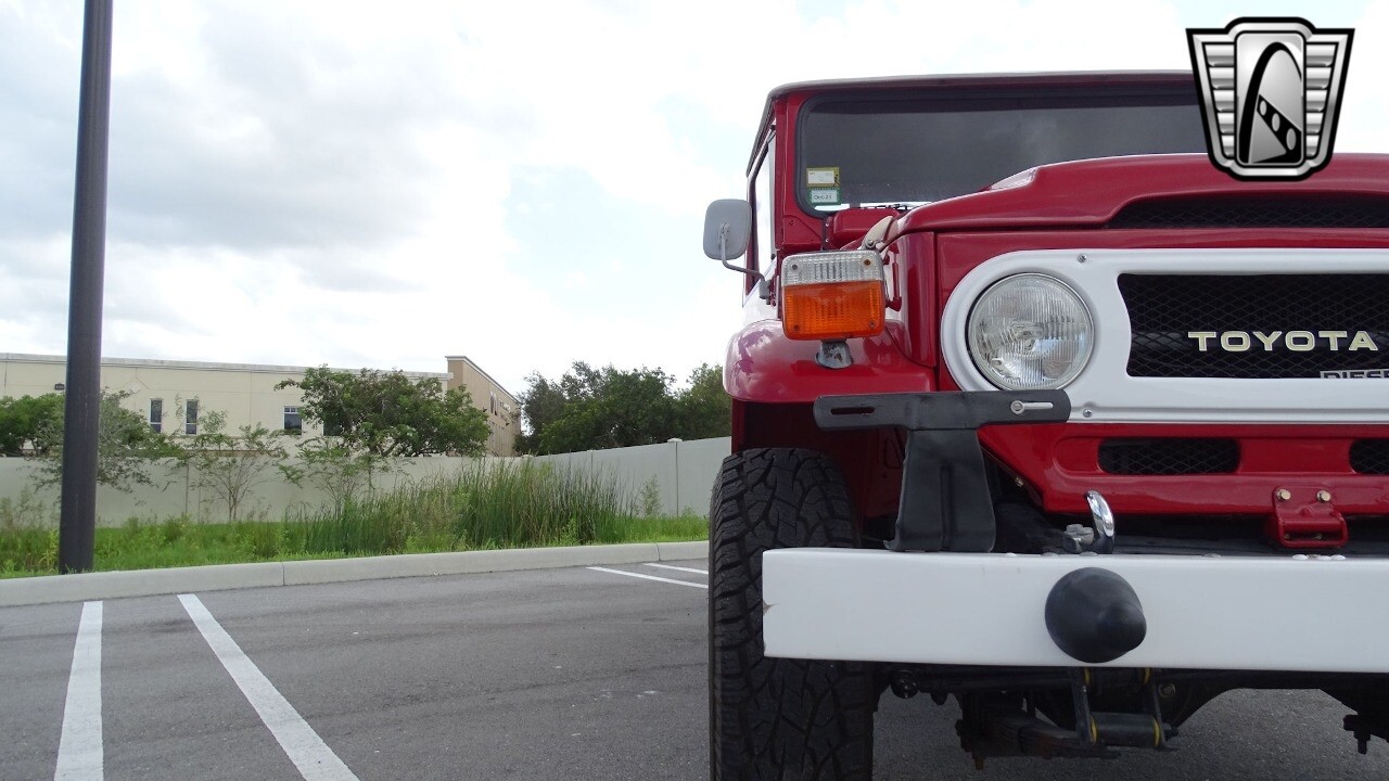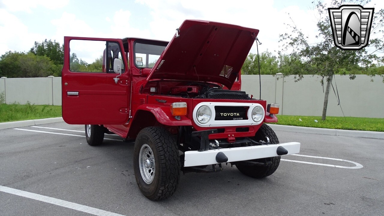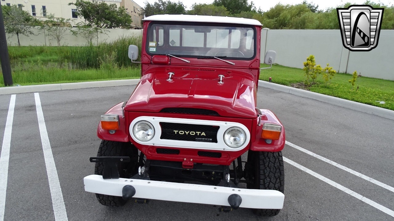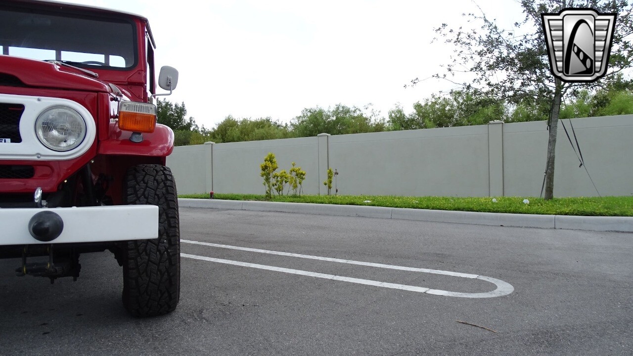 Introducing the classic 1977 Toyota Land Cruiser FJ43, a timeless piece of automotive history. This model is dressed in a vibrant red exterior, a color that is sure to turn heads wherever you go. The interior is a tasteful gray, a nice complement to the exterior, and is furnished in durable vinyl for a blend of comfort and practicality.