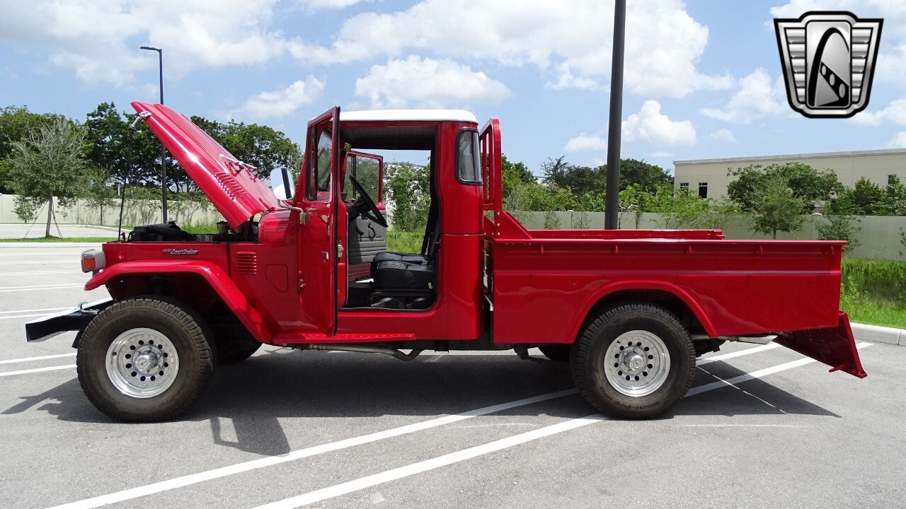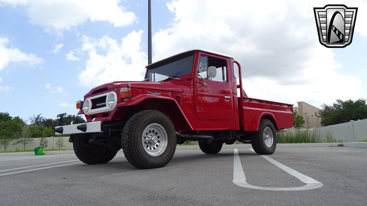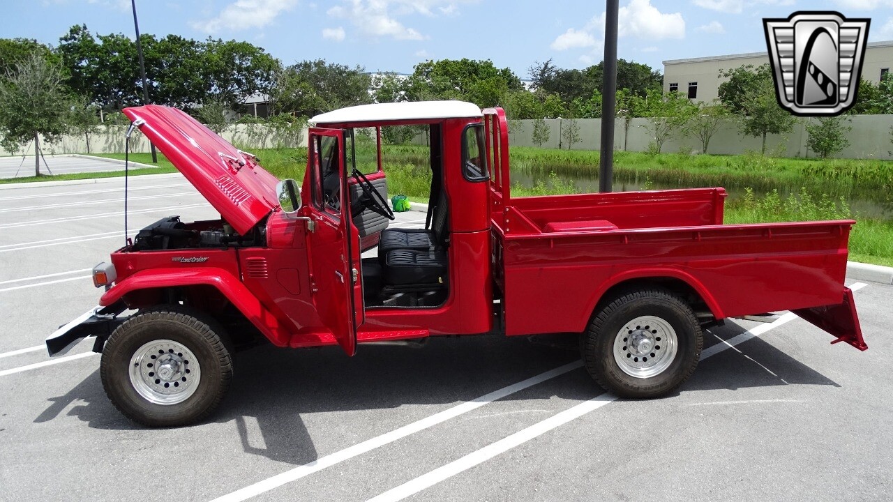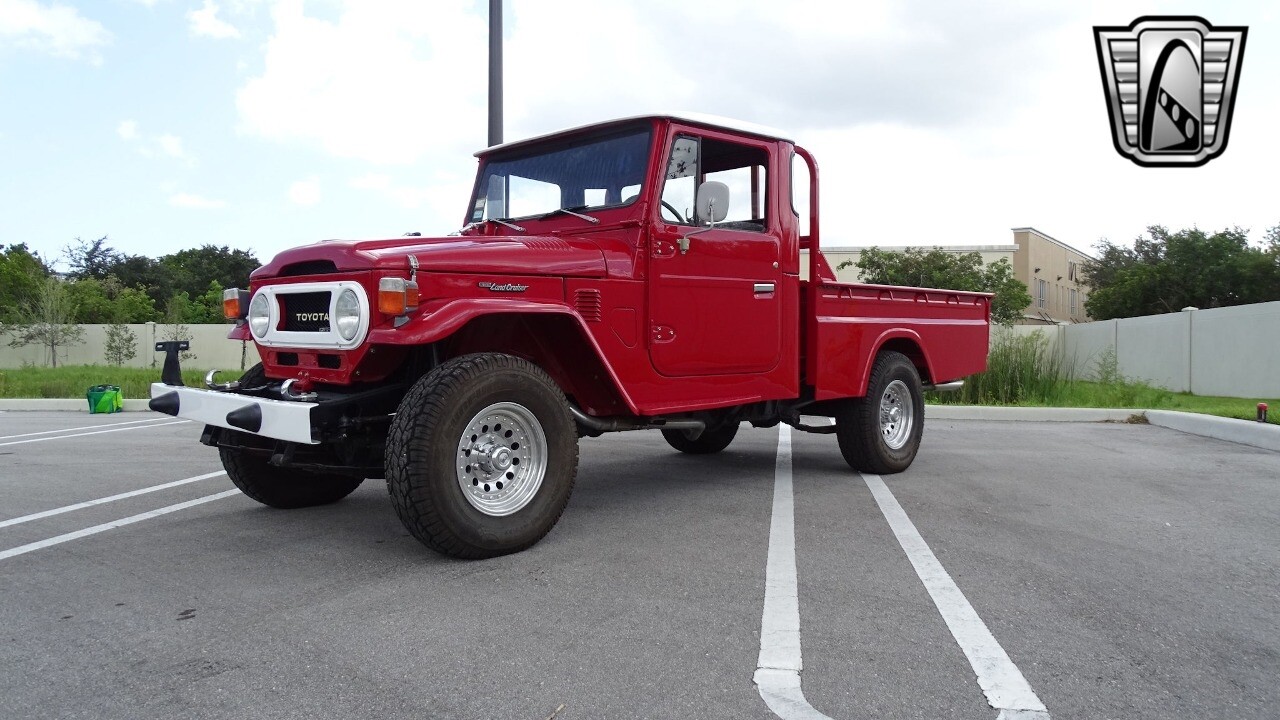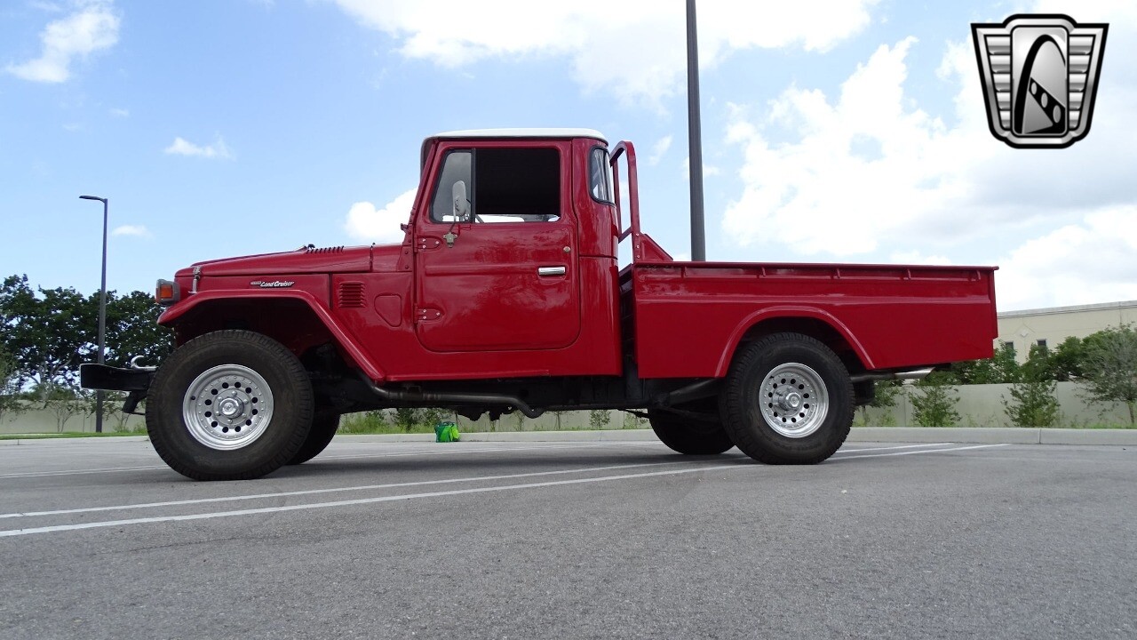 Introducing the classic 1977 Toyota Land Cruiser FJ43, a timeless piece of automotive history. This model is dressed in a vibrant red exterior, a color that is sure to turn heads wherever you go. The interior is a tasteful gray, a nice complement to the exterior, and is furnished in durable vinyl for a blend of comfort and practicality.