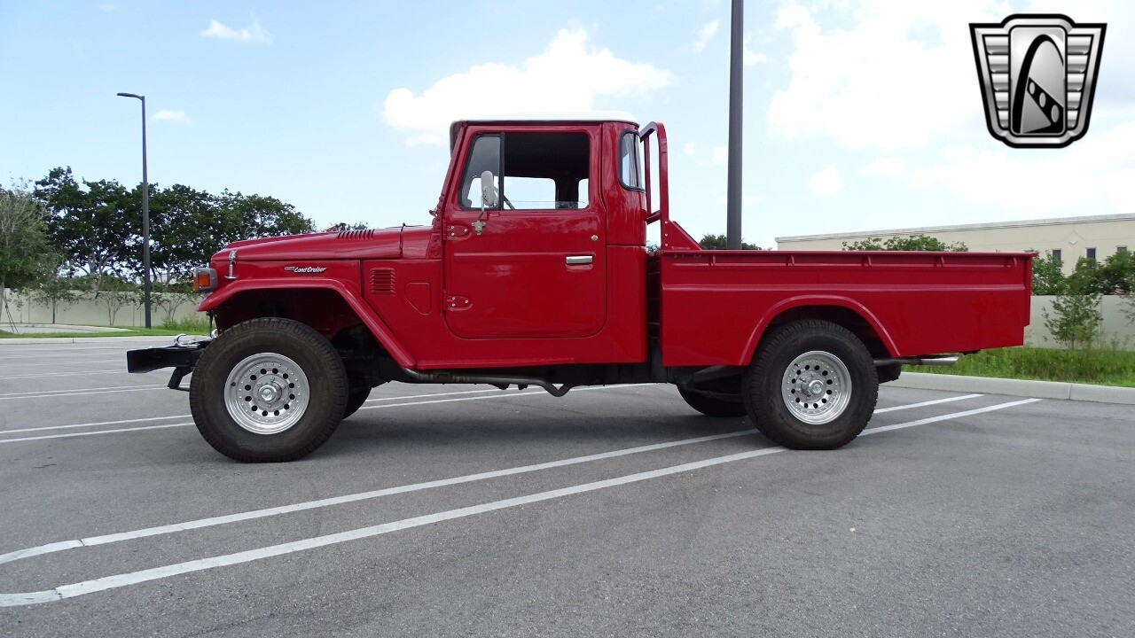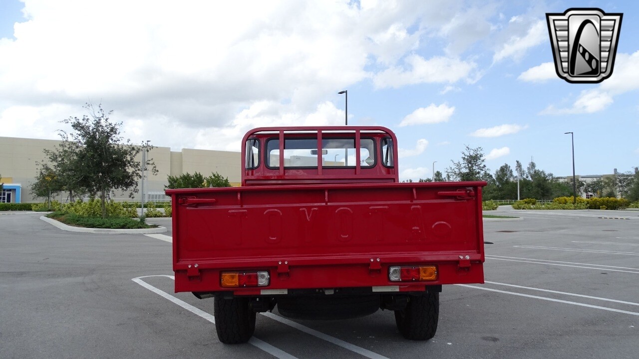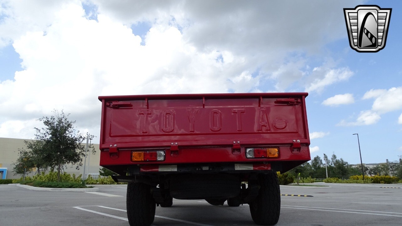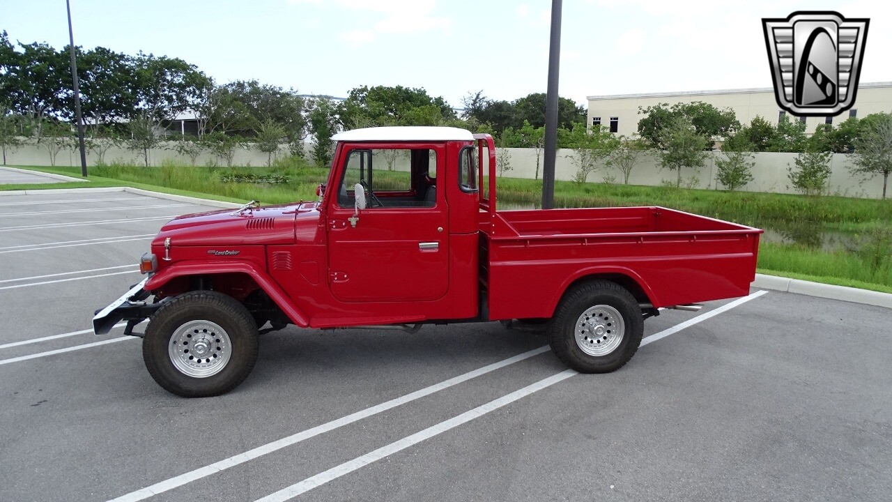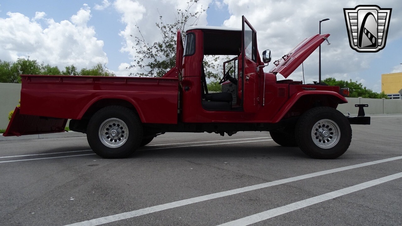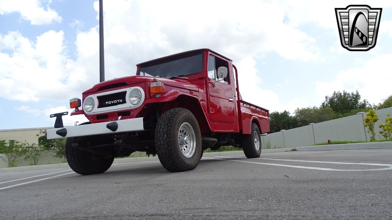 Introducing the classic 1977 Toyota Land Cruiser FJ43, a timeless piece of automotive history. This model is dressed in a vibrant red exterior, a color that is sure to turn heads wherever you go. The interior is a tasteful gray, a nice complement to the exterior, and is furnished in durable vinyl for a blend of comfort and practicality.