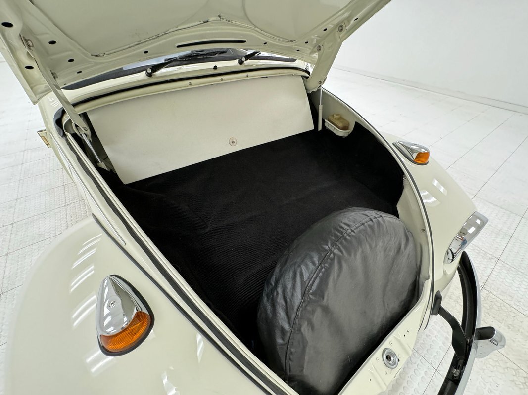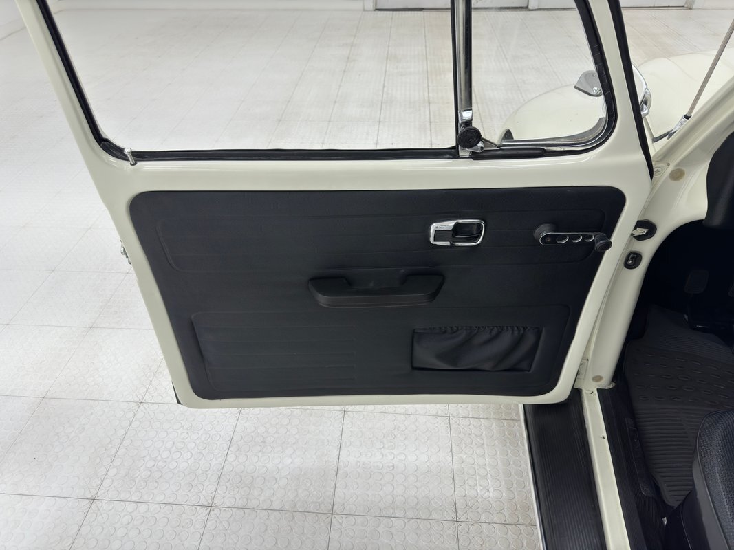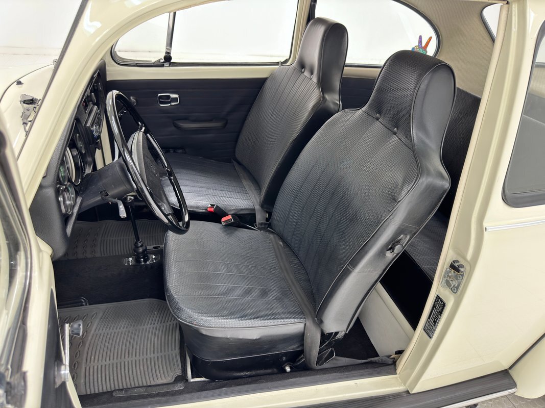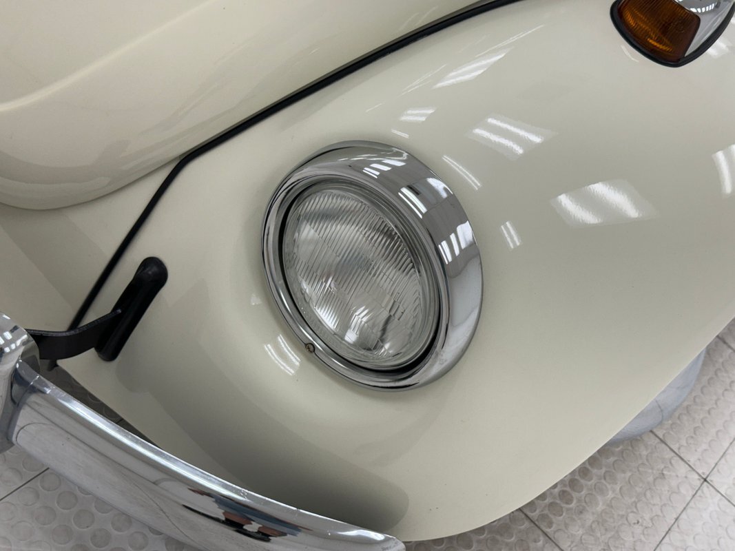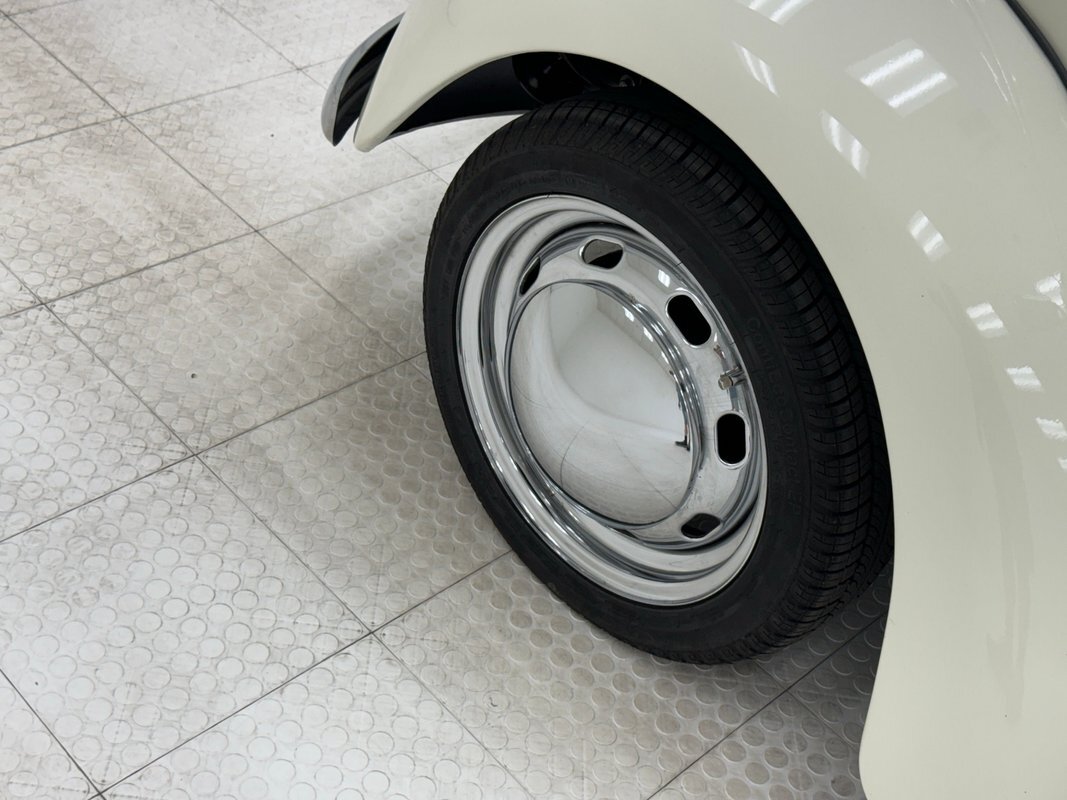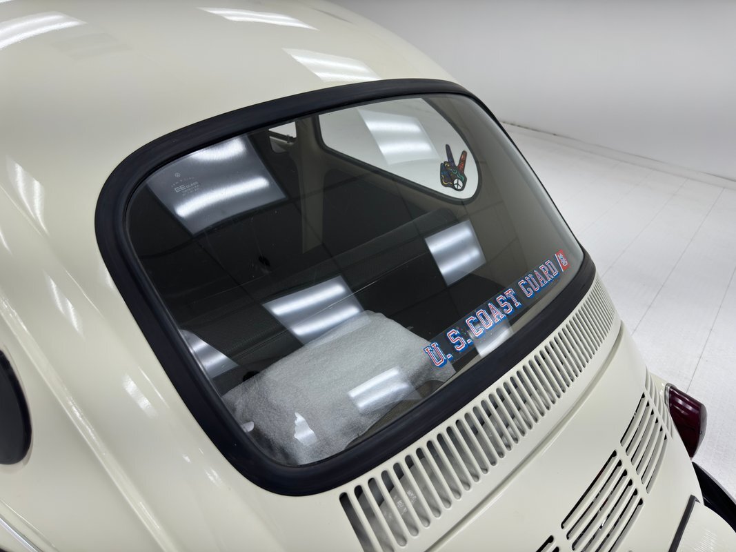 The front fenders are mated with earlier vintage rear fenders which instantly gives the car a unique shape and the bumpers, turn signals, and taillights are from an earlier model too. Once these parts were melded, the car received a paint job with Pastel White. The metal work including light rings, light housing, hubcaps, side mirror, side molding, and handles are all in wonderful shape and the paint coverage is fantastic. 15-inch staggered width steel wheels carry slightly staggered size tires with a late 2019 date code, and along with the black window frames, wipers, vents, and running board provide a nice contrast to the white. We could not find any glaring imperfection on the exterior of this fine bug.